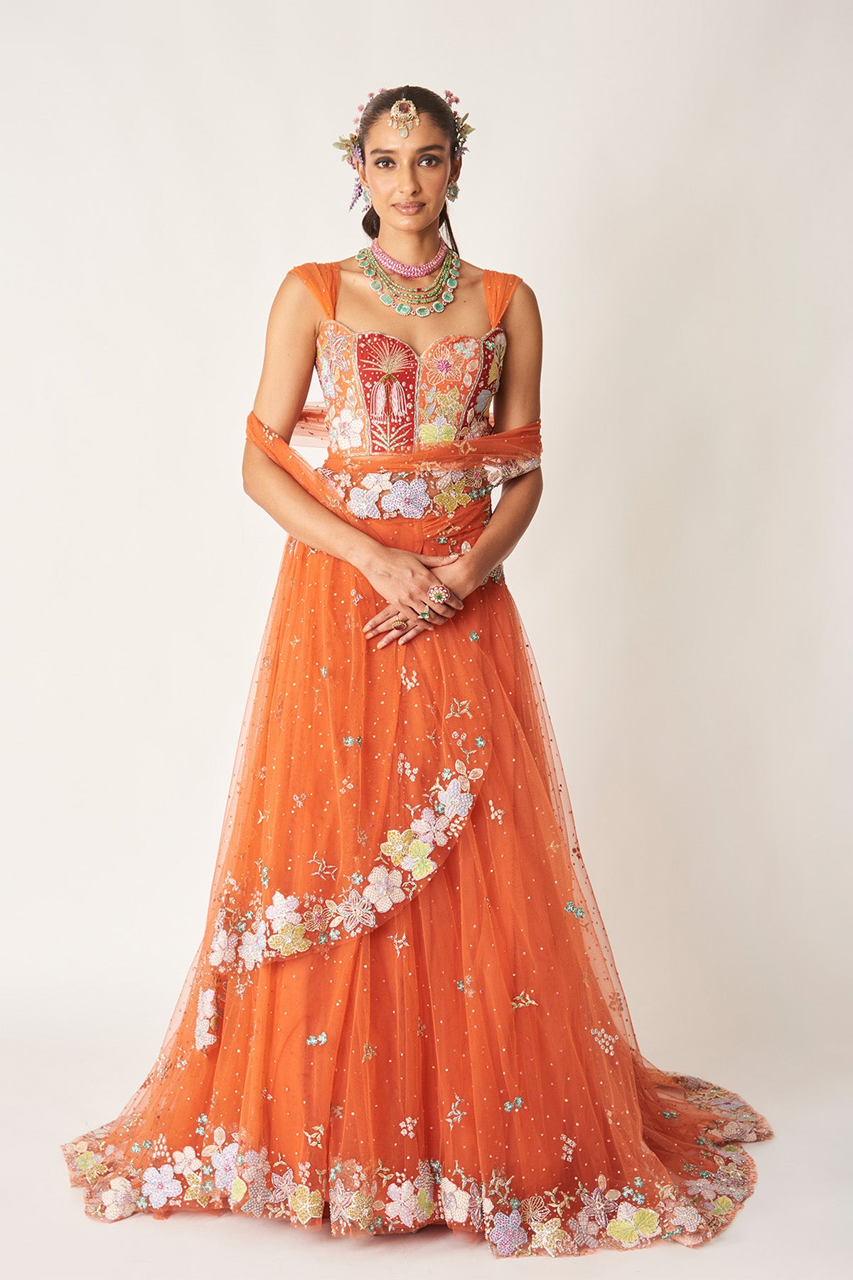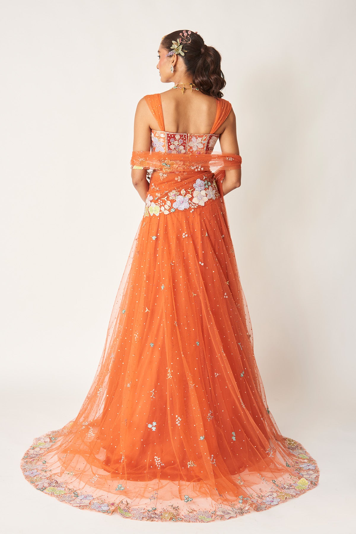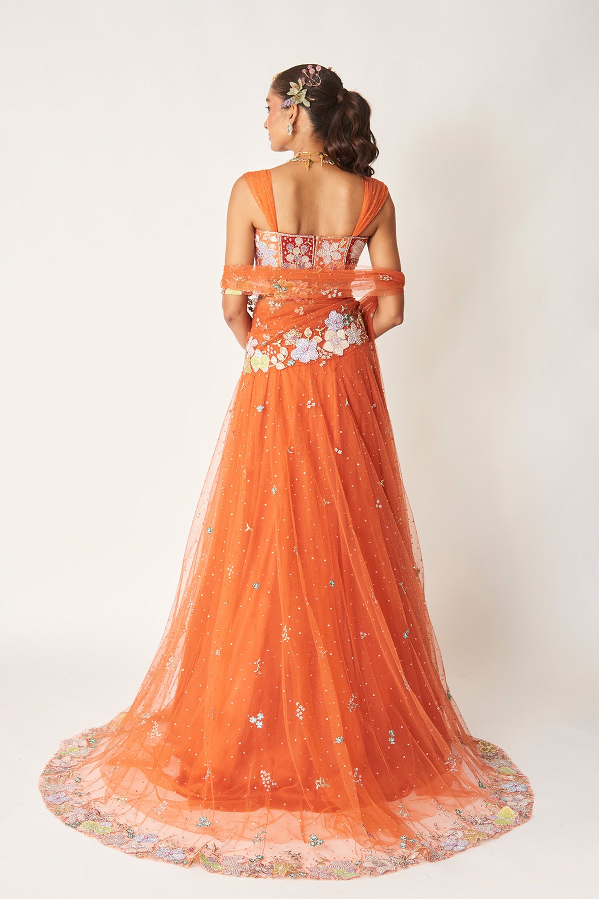 Matilda orange applique embellished net stitched saree lehenga with ruched strap blouse.