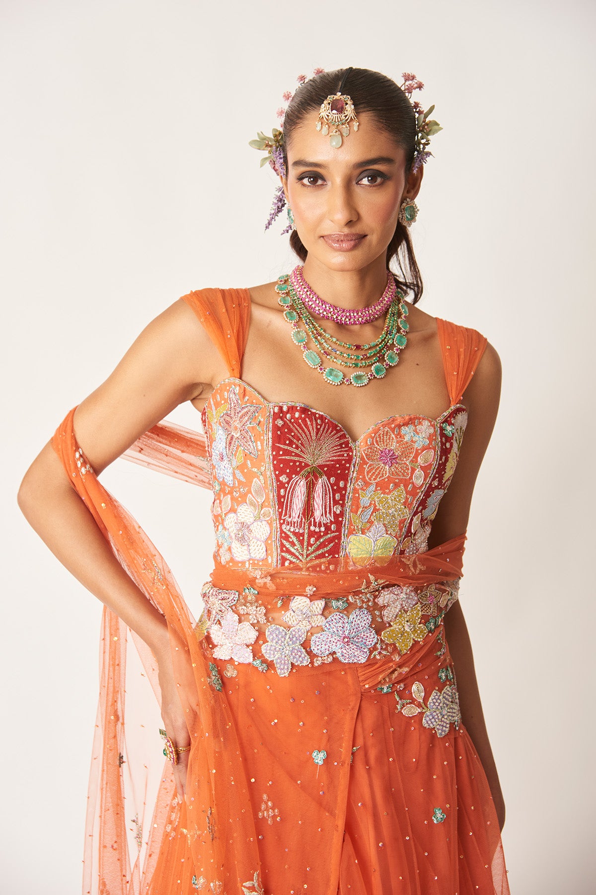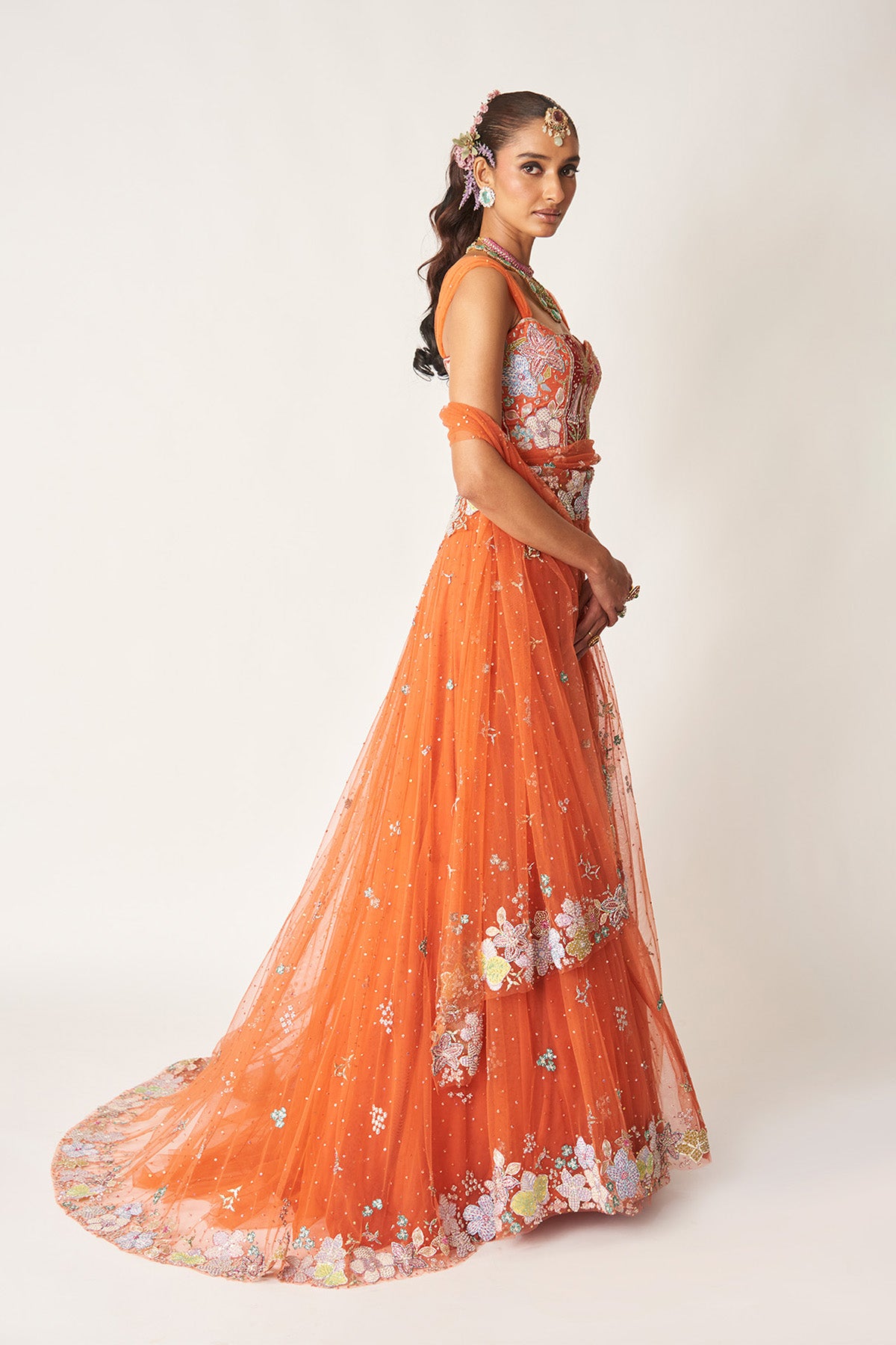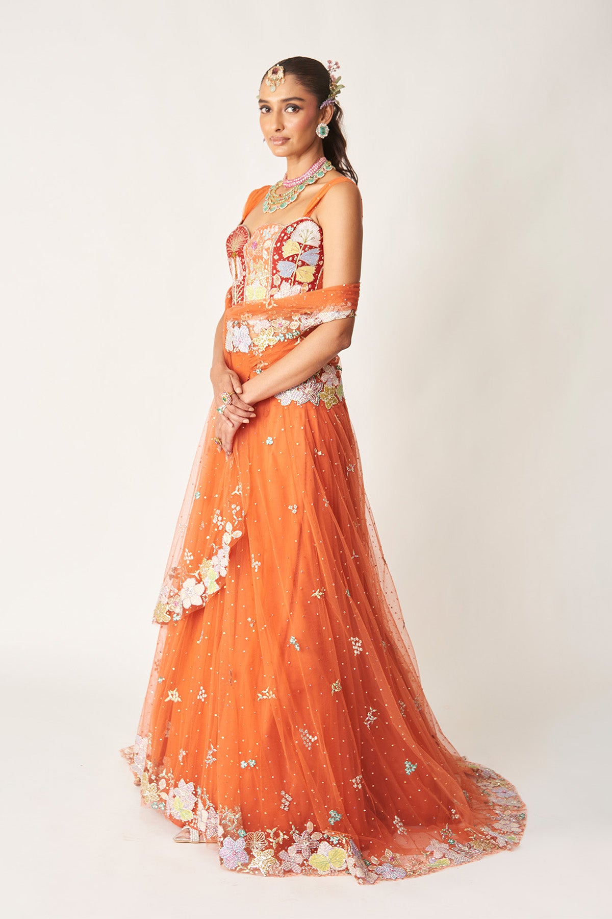 Matilda orange applique embellished net stitched saree lehenga with ruched strap blouse.