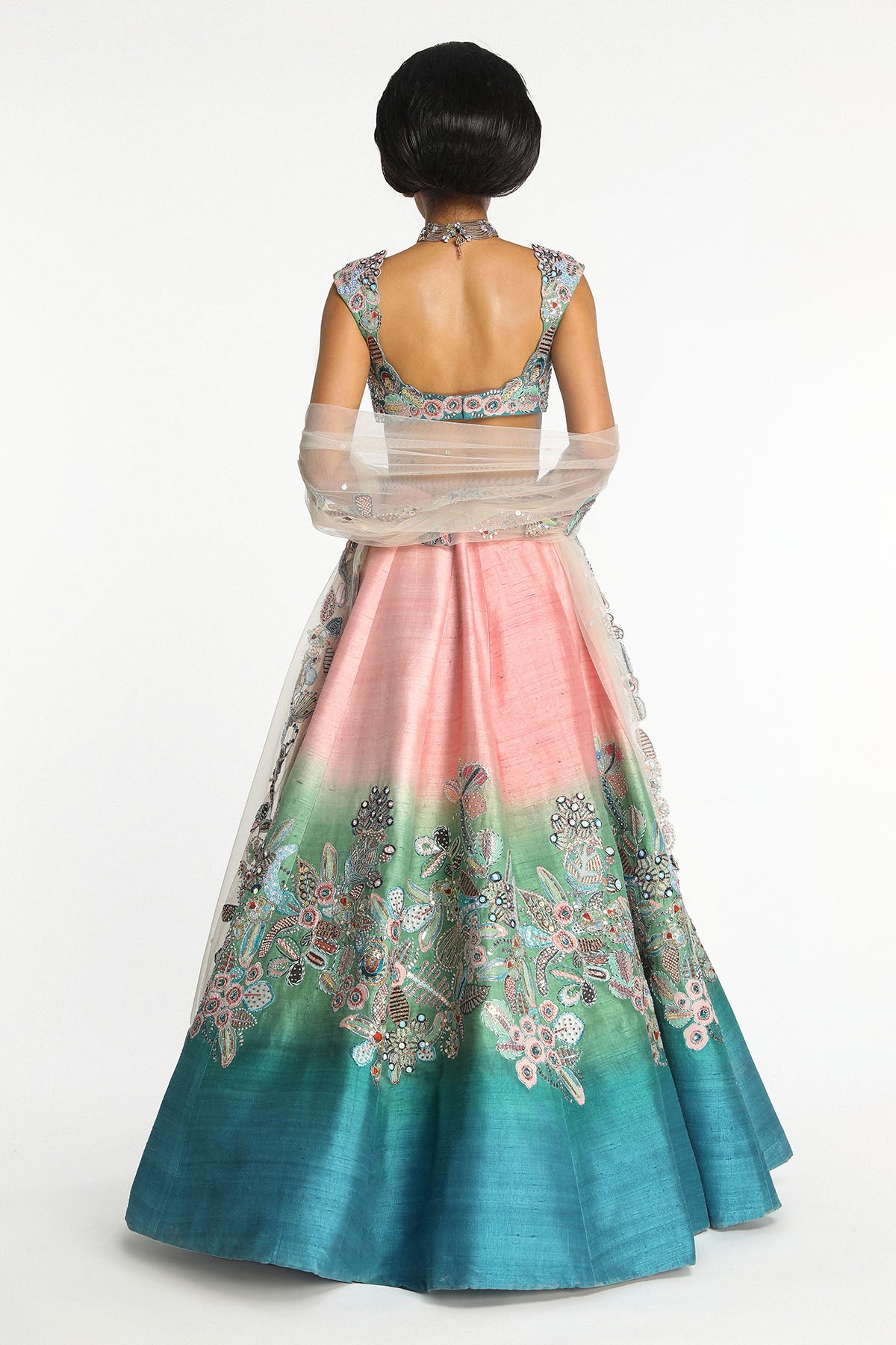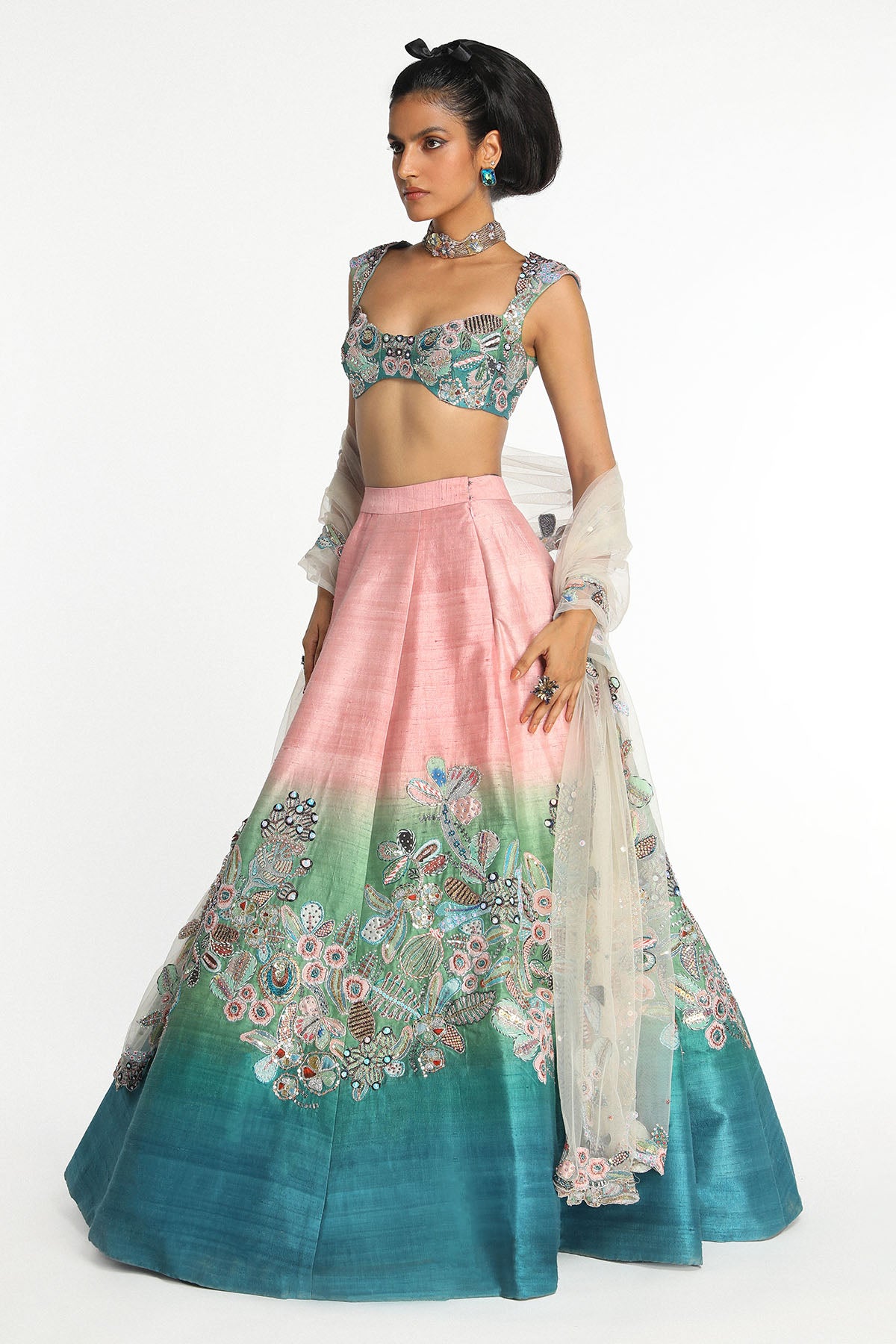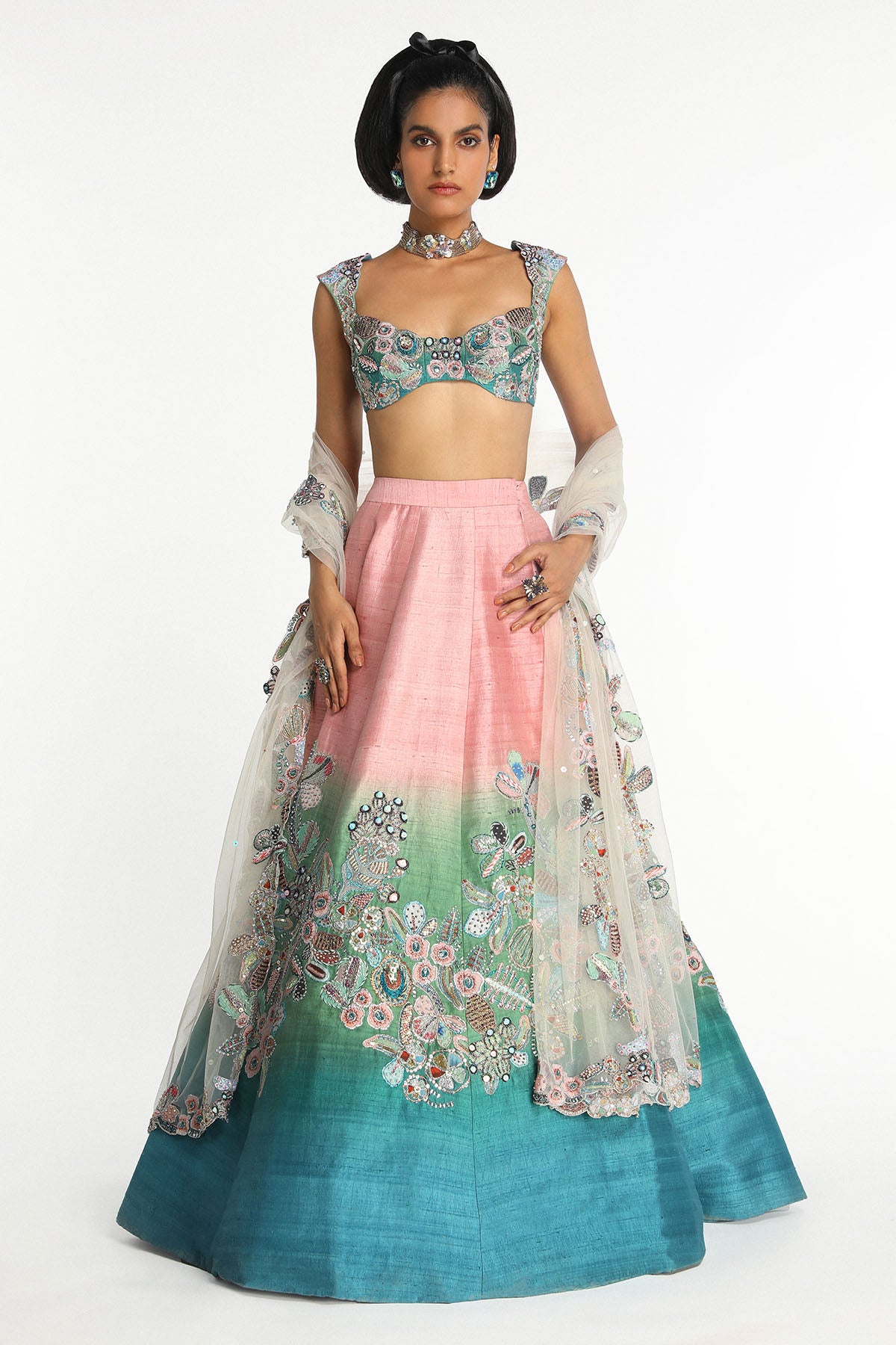 Kinfolk Aurora Ombre Applique Embellished Raw Silk Lehenga, blouse & Tulle Dupatta