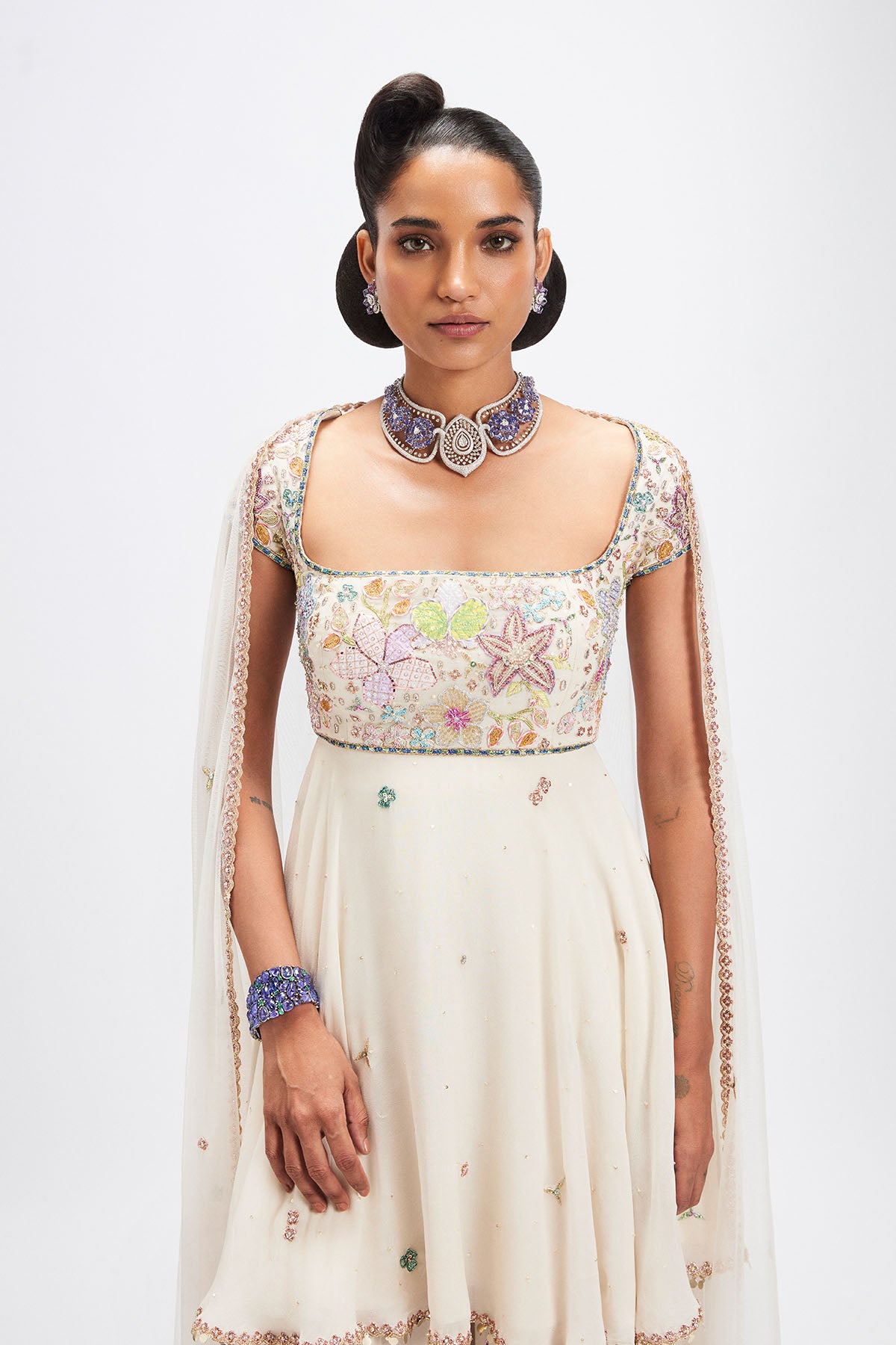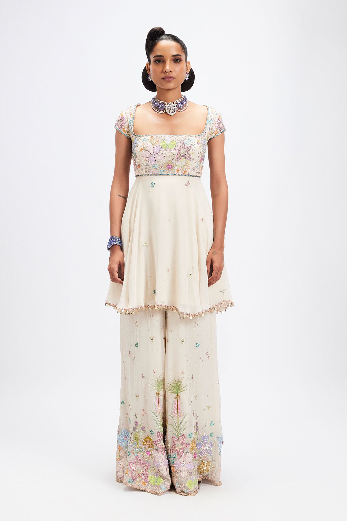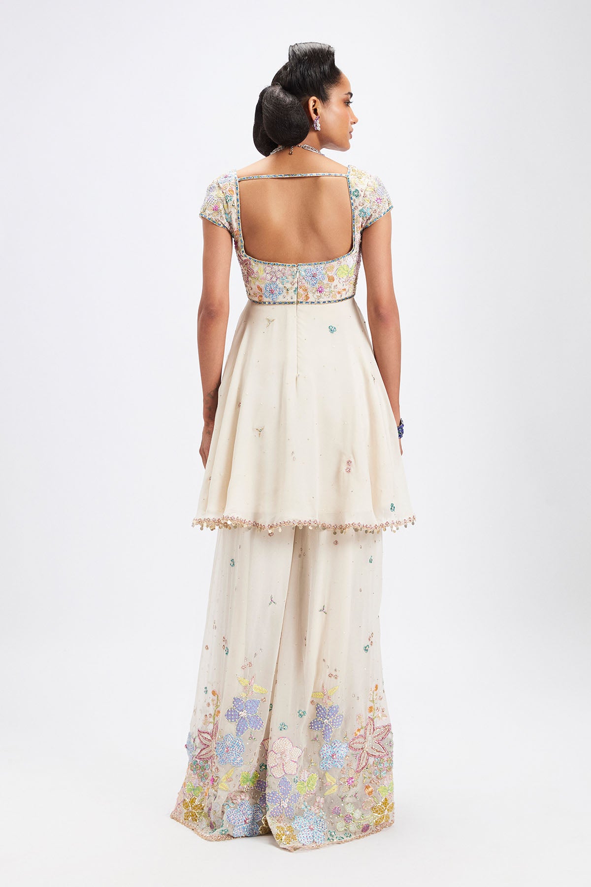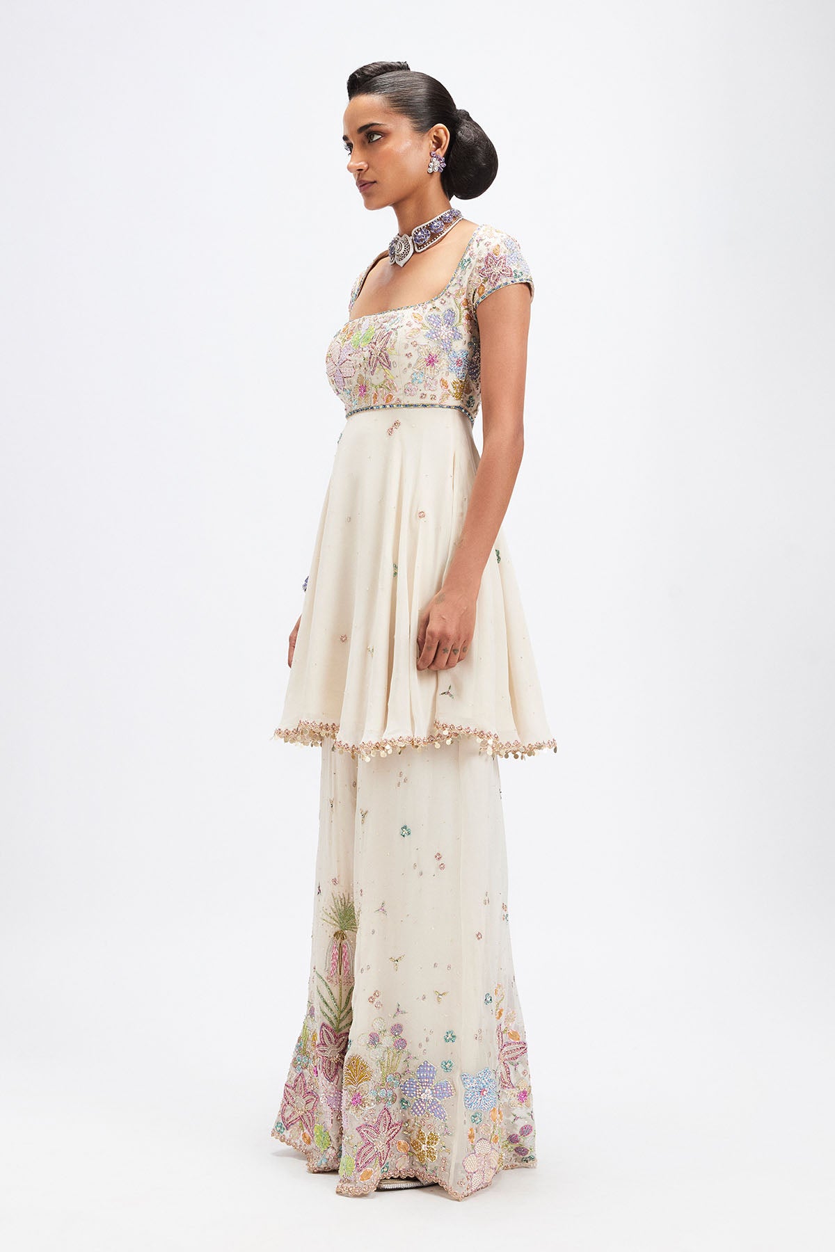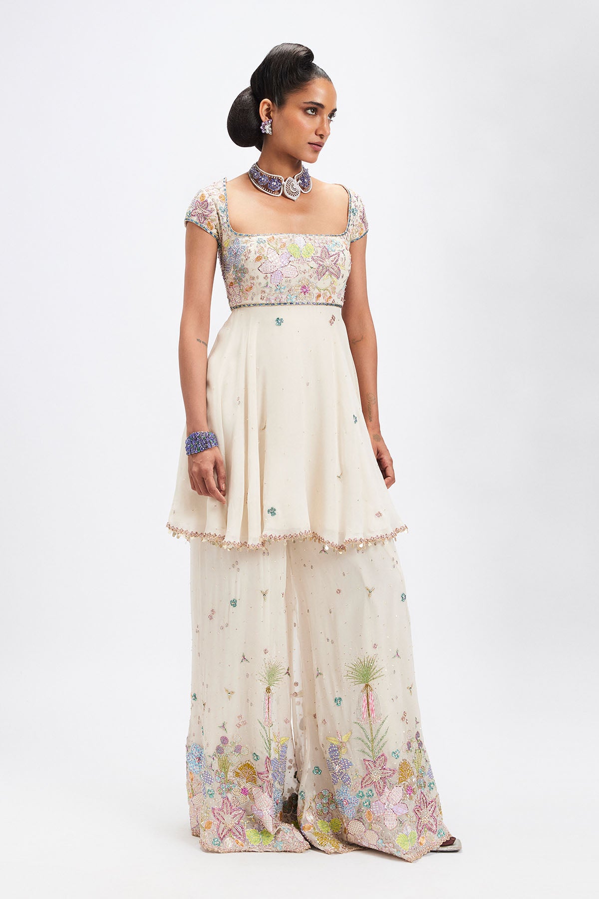 Matilda Ivory applique embellished georgette short kurta, sharara with tulle dupatta