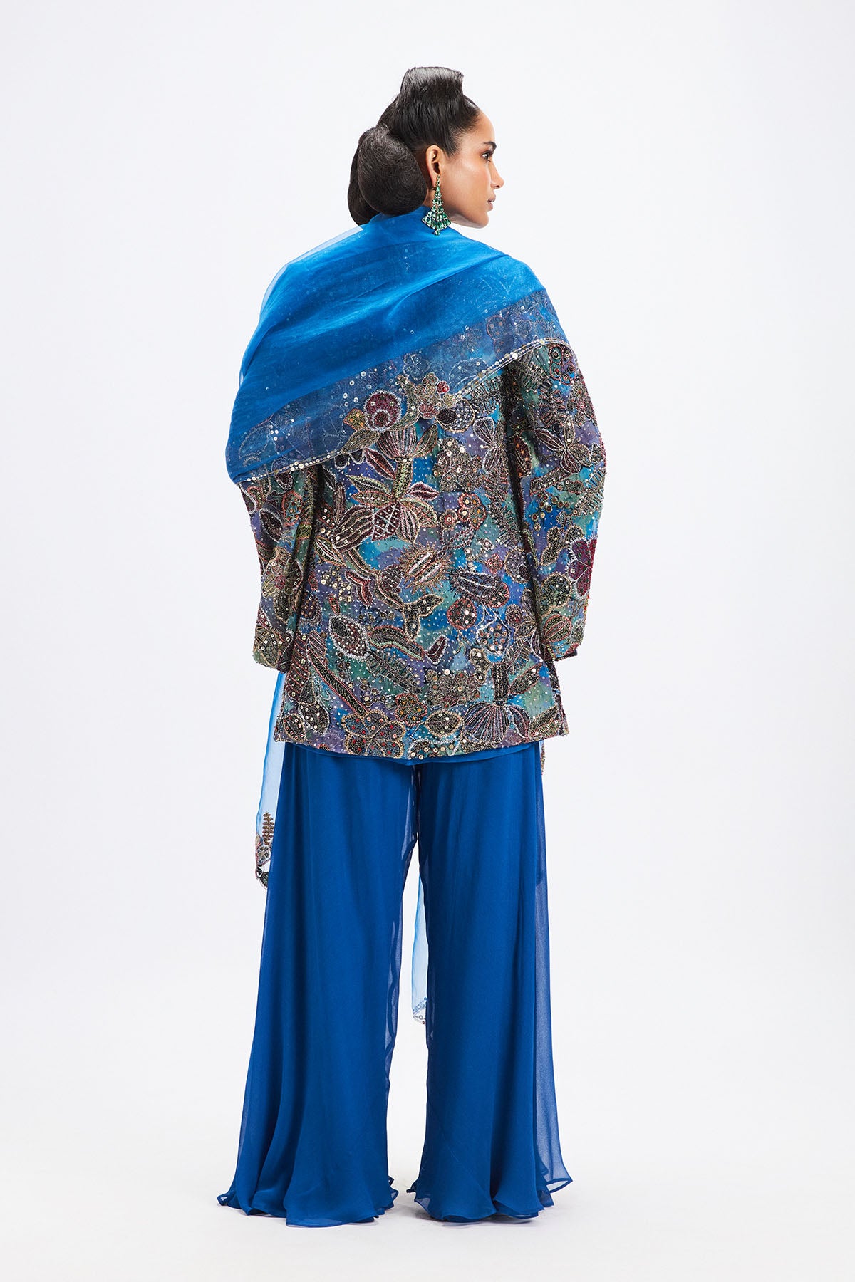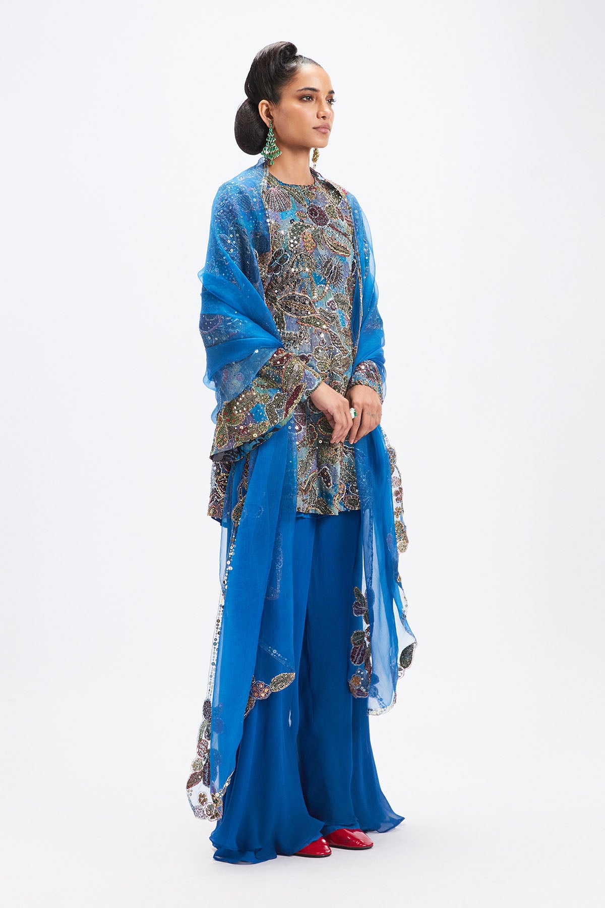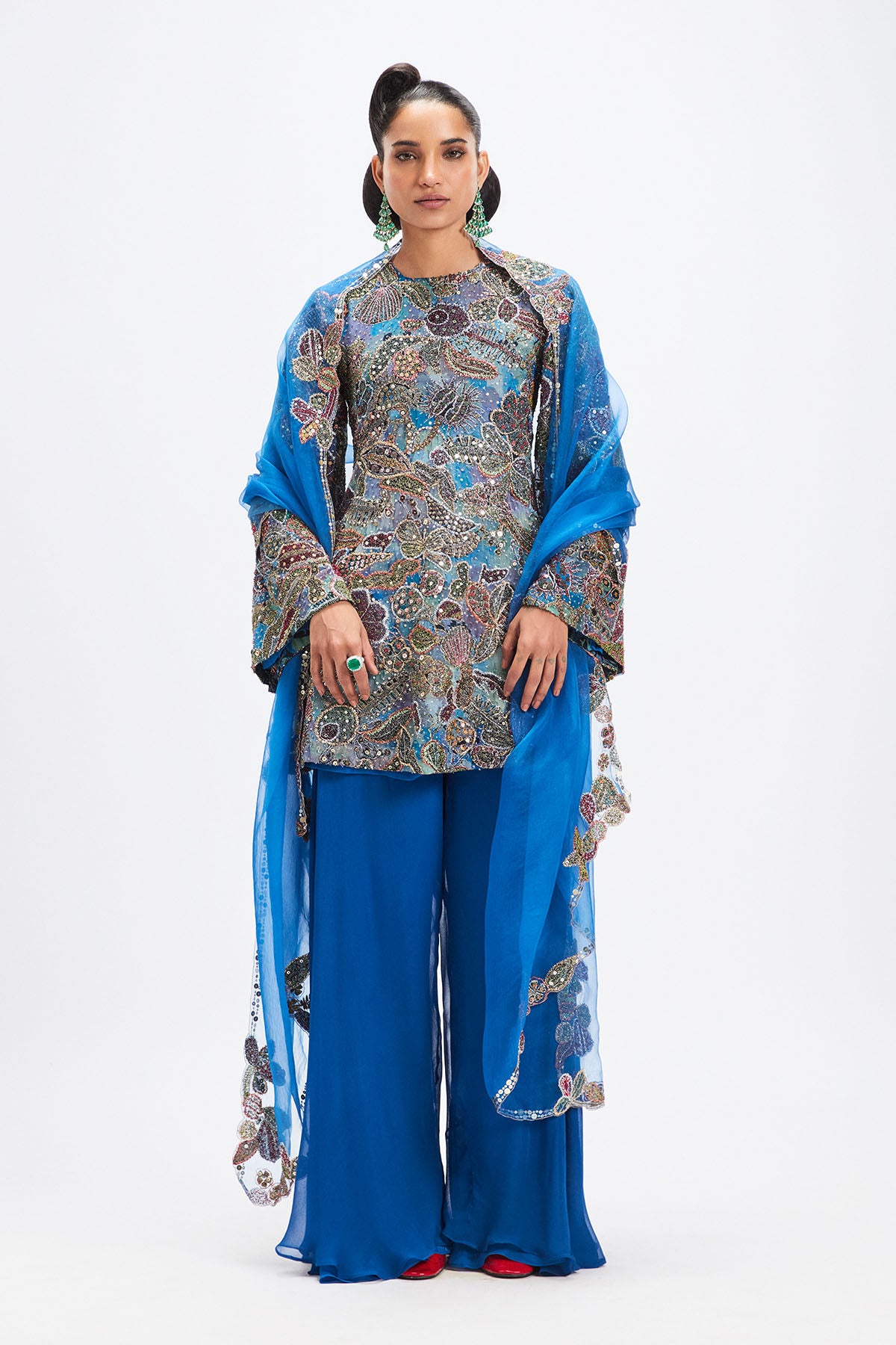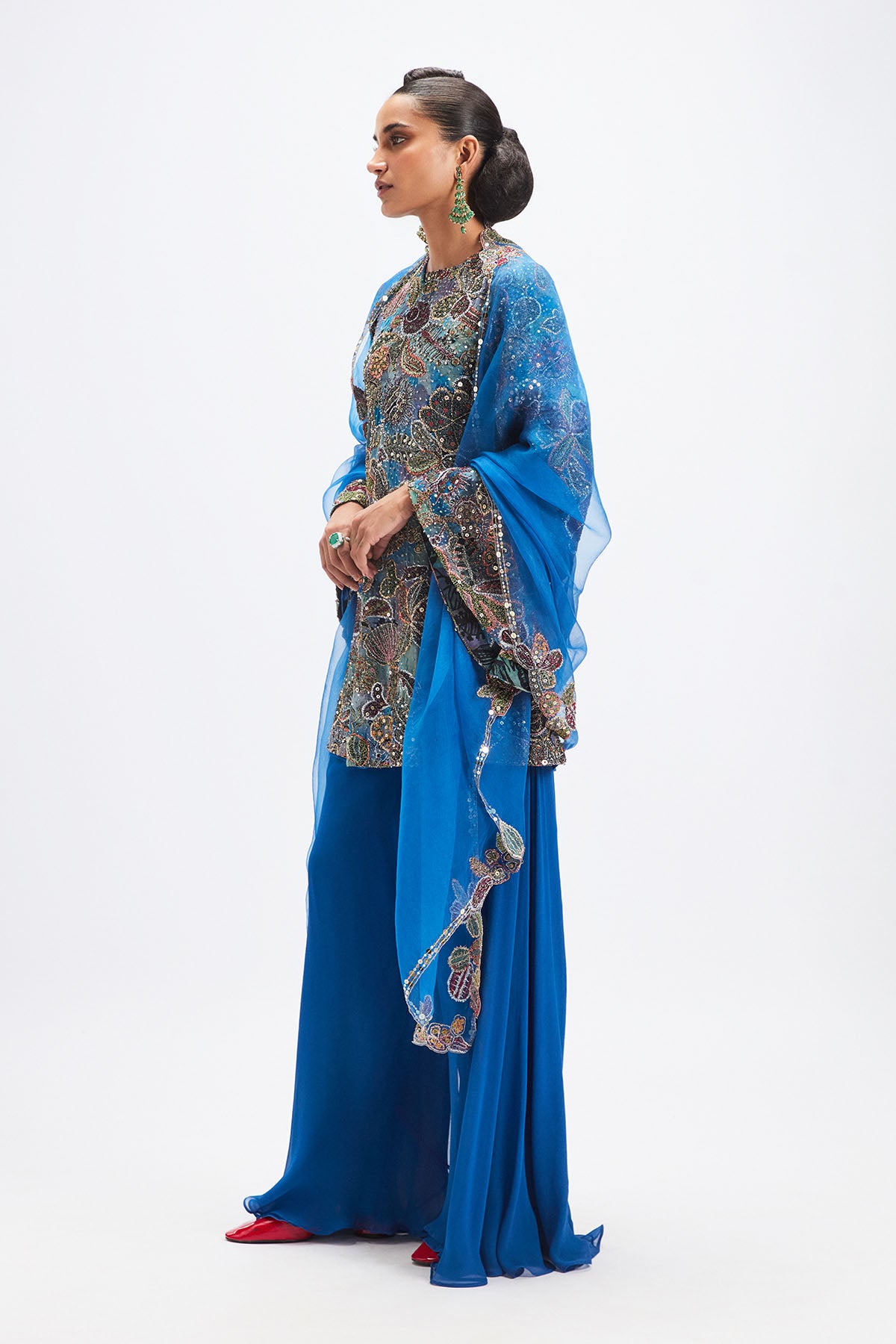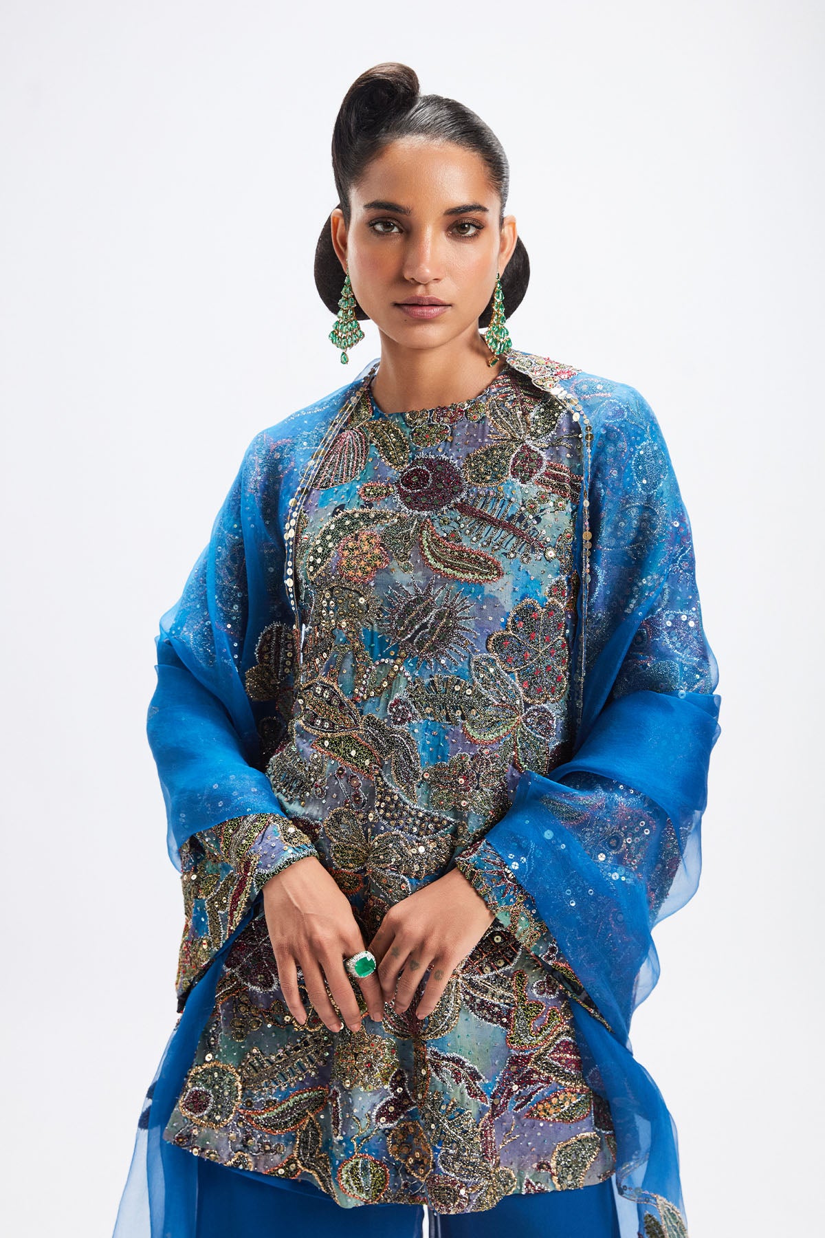 Kinfolk spectrum blue printed embellished georgette short kurta with solid pants & dupatta