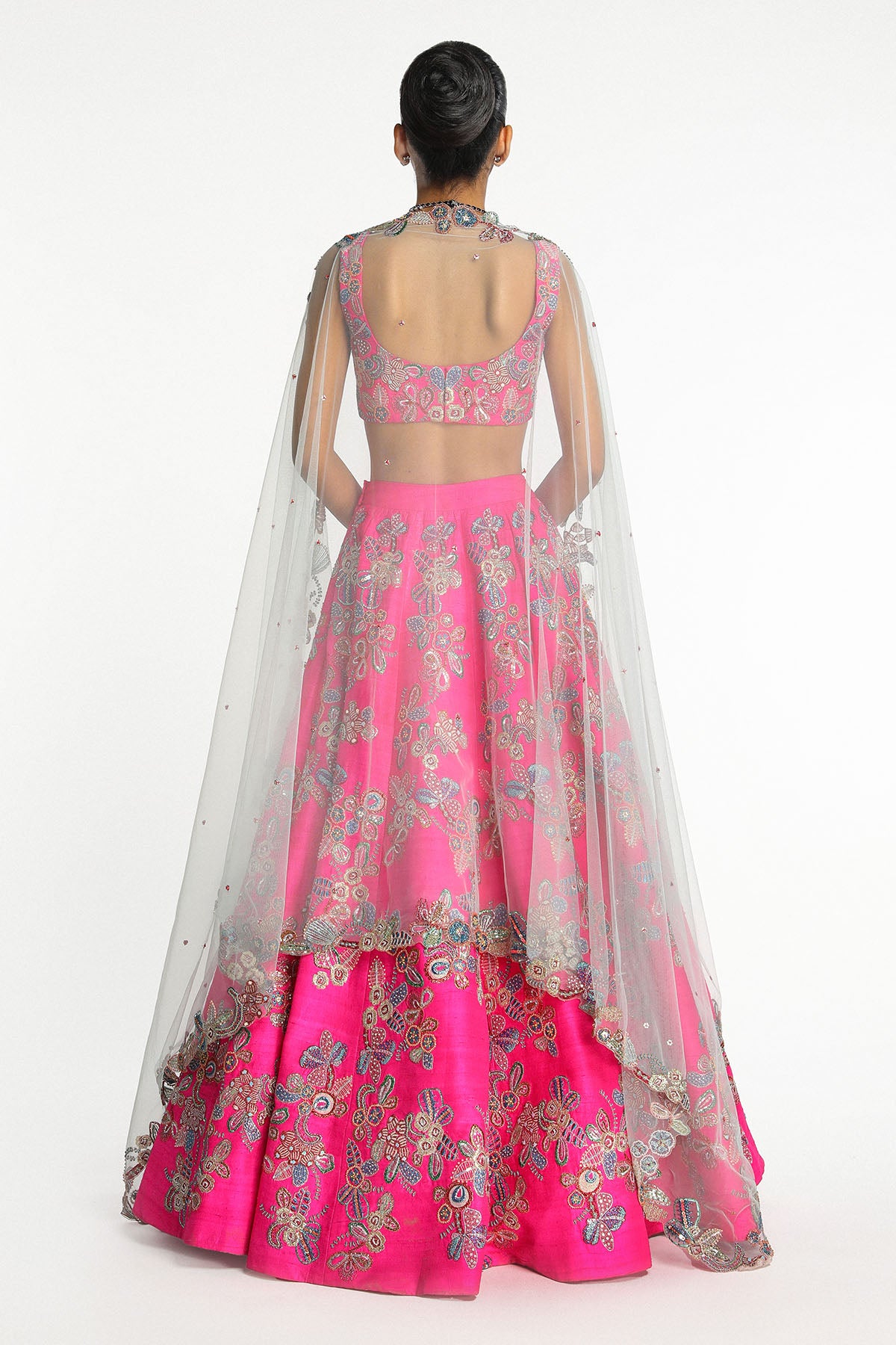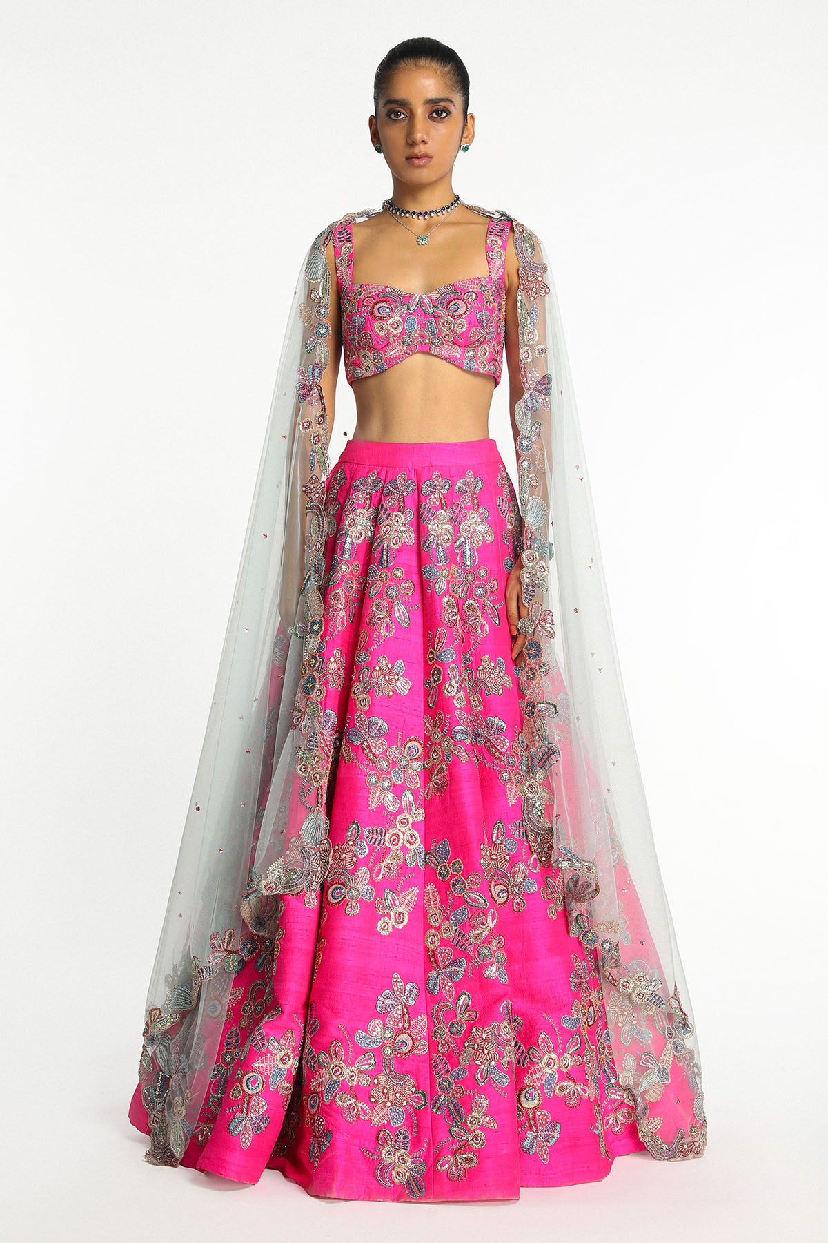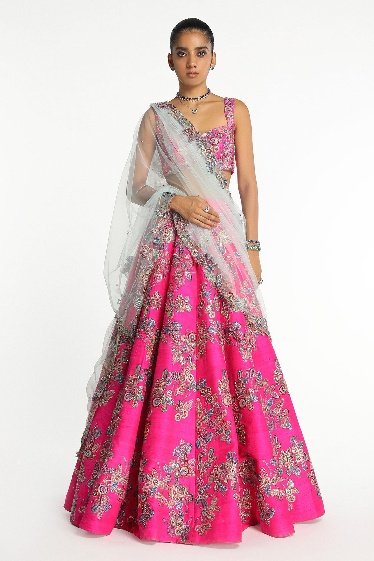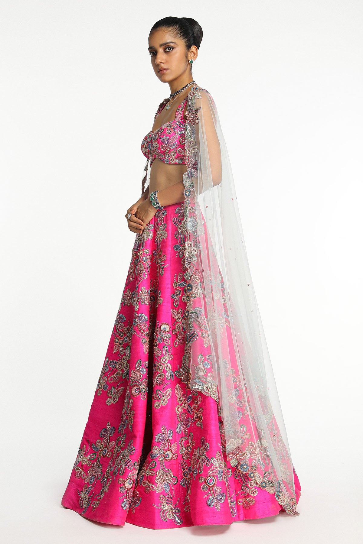 Kinfolk Hot Pink Embellished Raw Silk Vb Lehenga, Blouse & Tulle Dupatta