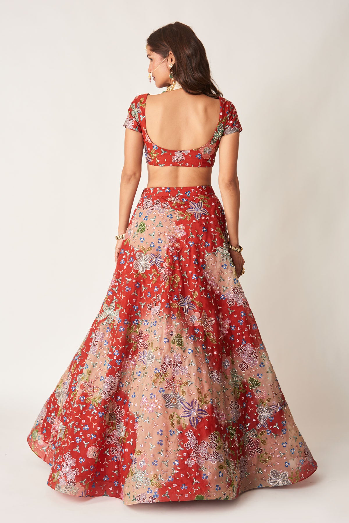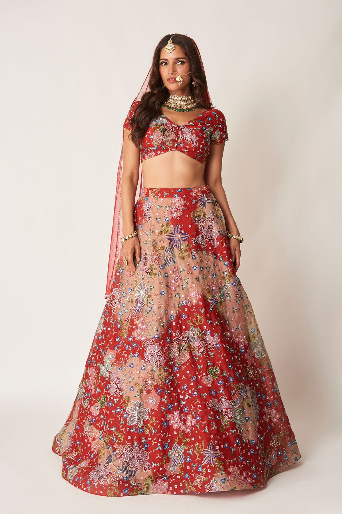 Matilda red printed embellished organza lehenga with blouse & tulle dupatta.