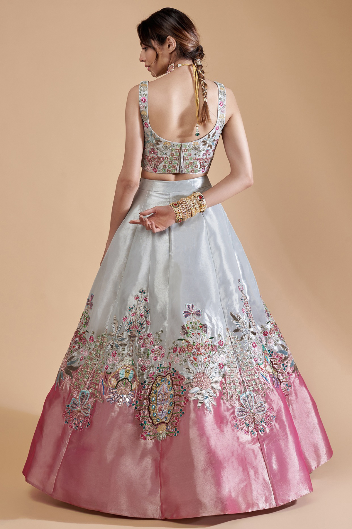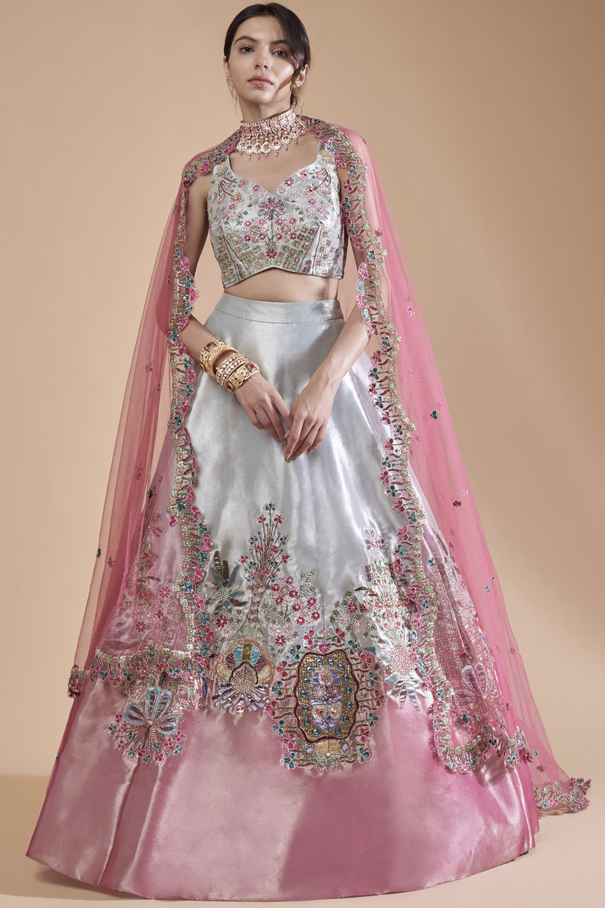 Banafsh Ivory -pink appliqued embellished Tissue MK dual tone lehenga with blouse & dupatta