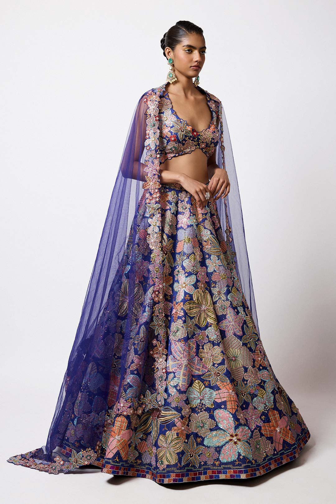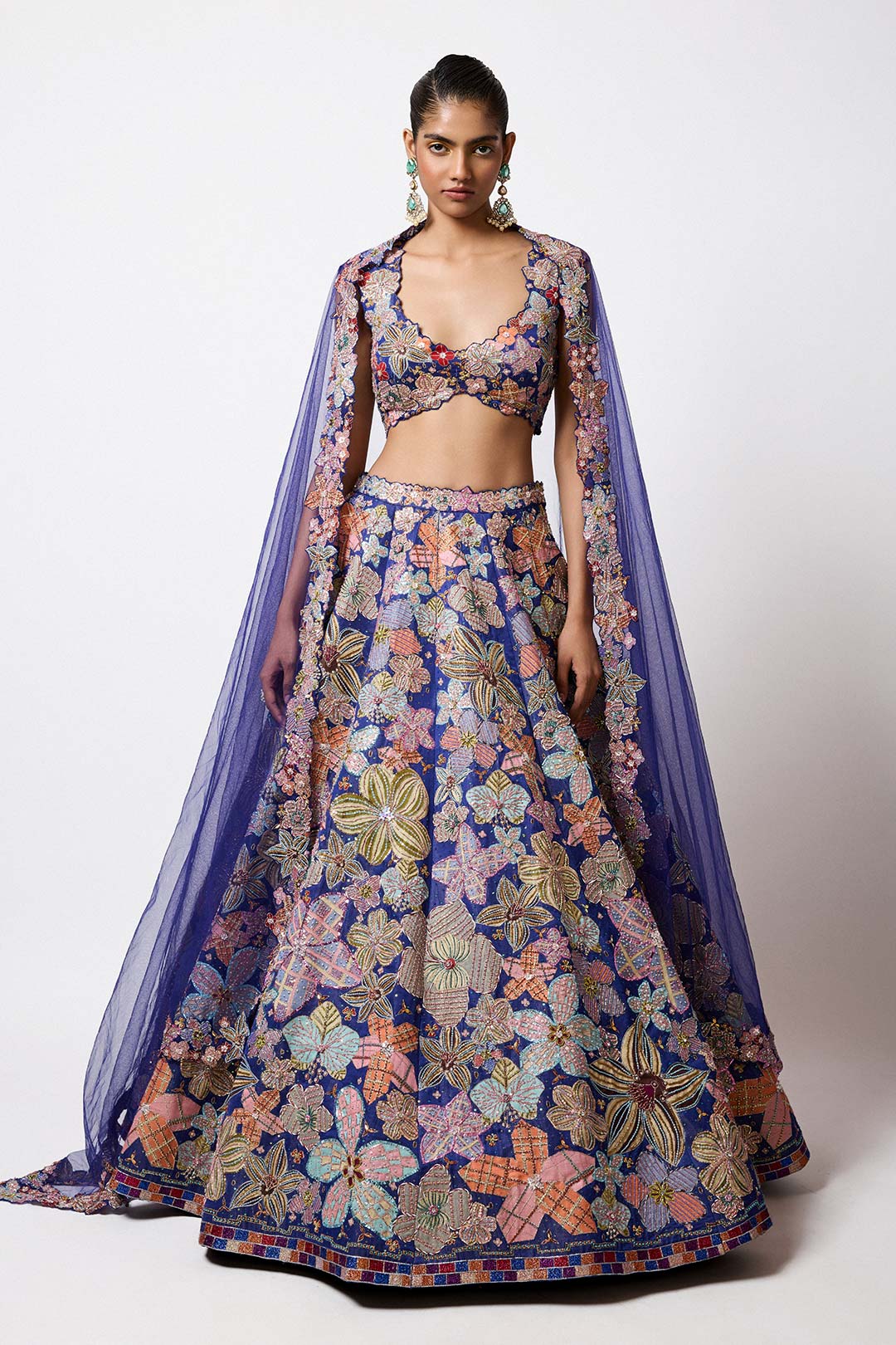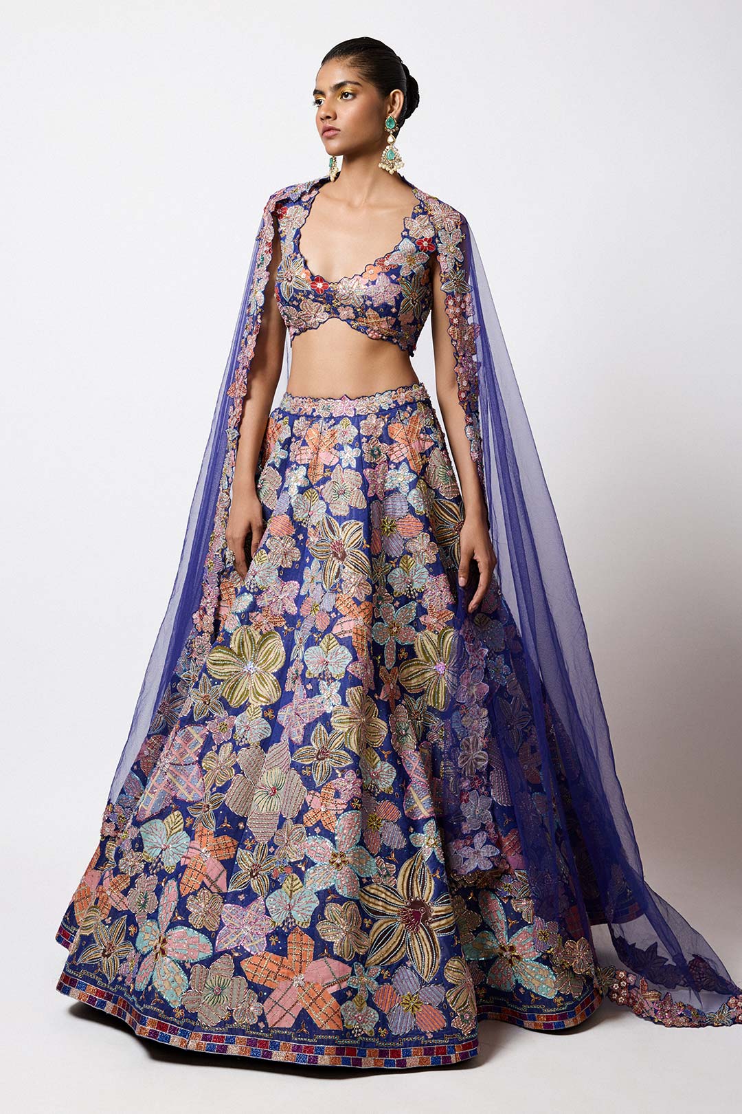 Matilda Electric Blue Printed Applique Embellished Kasab Satin Hk Big Flower Lehenga With Cutwork Blouse & Tulle Dupatta
