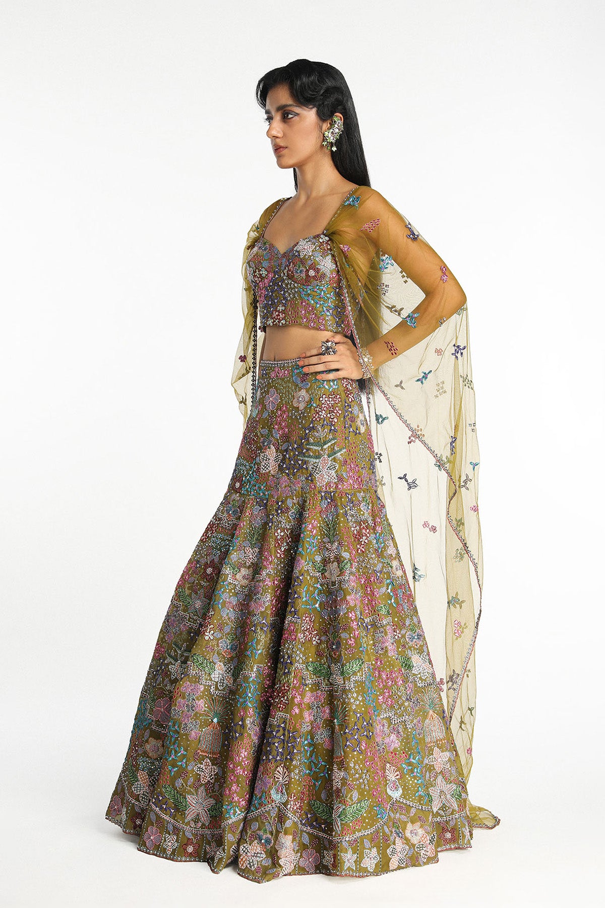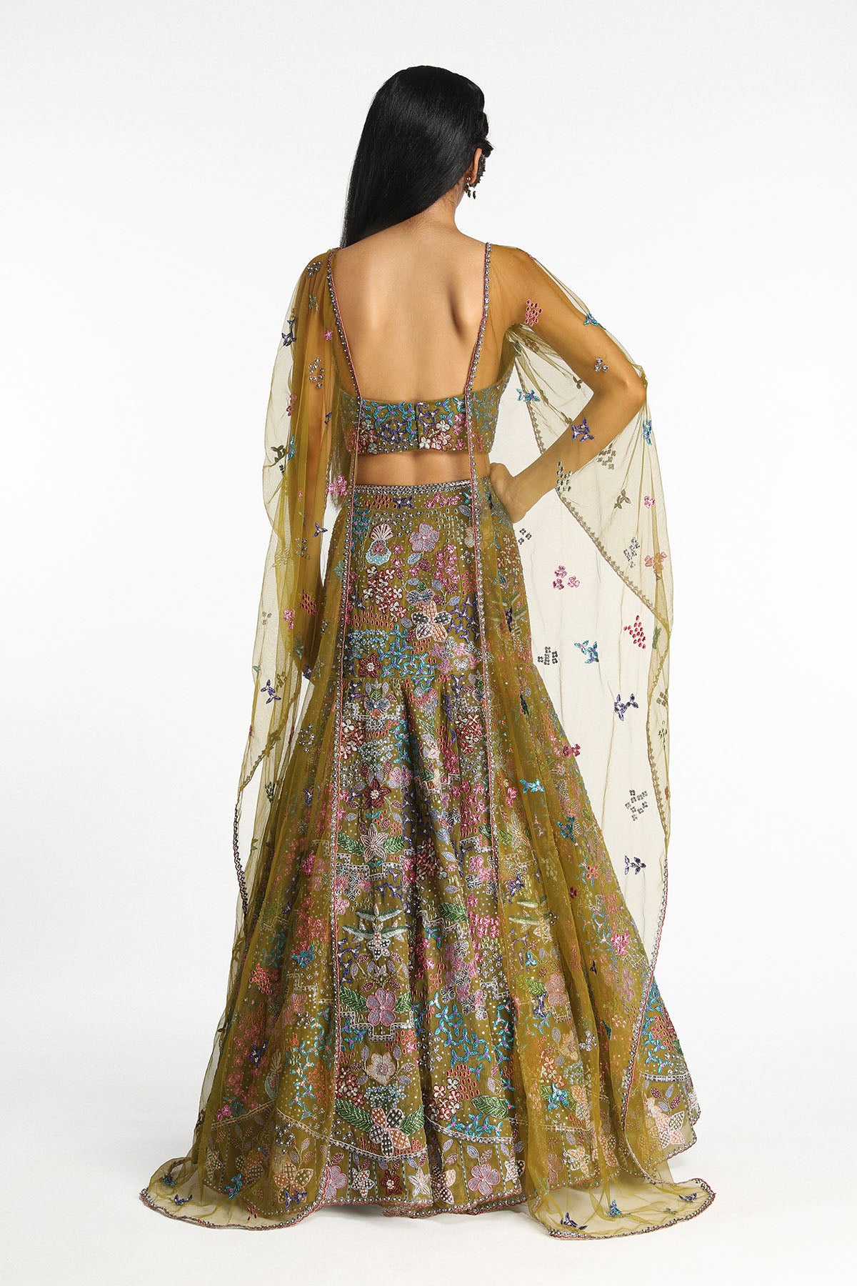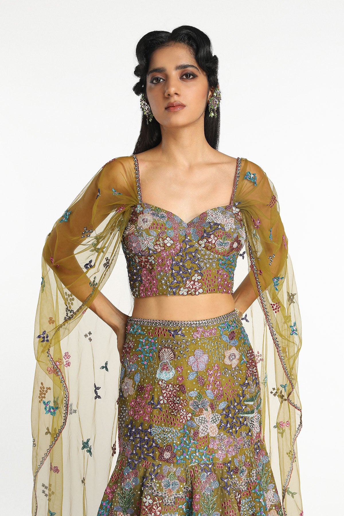 Matilda olive applique embellished organza lehenga and blouse with tulle sleeve cape.