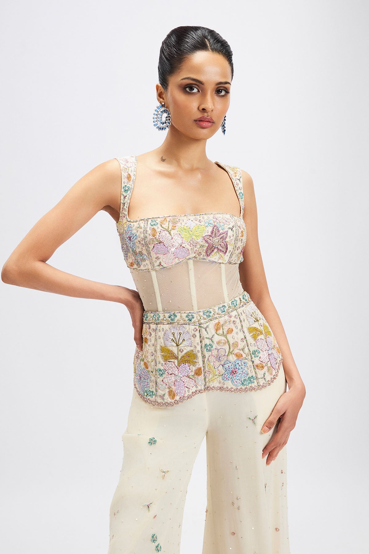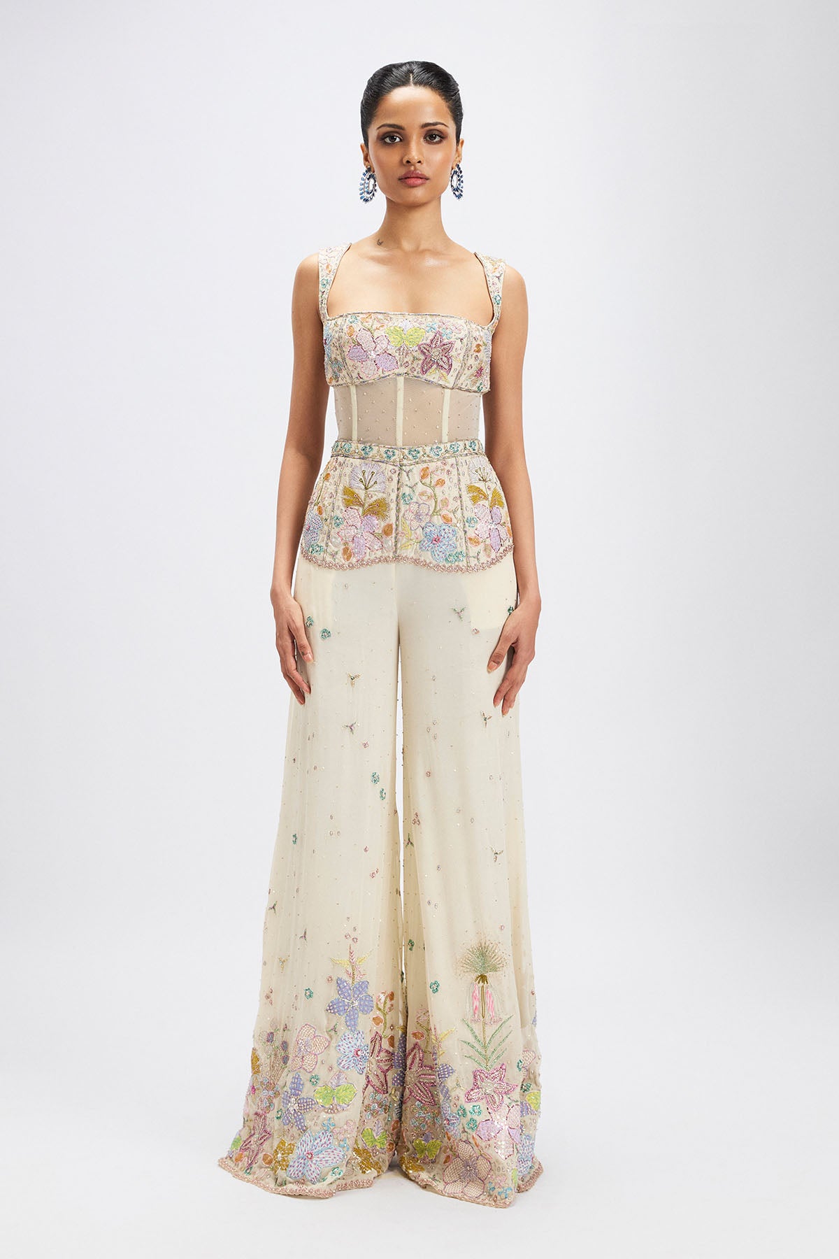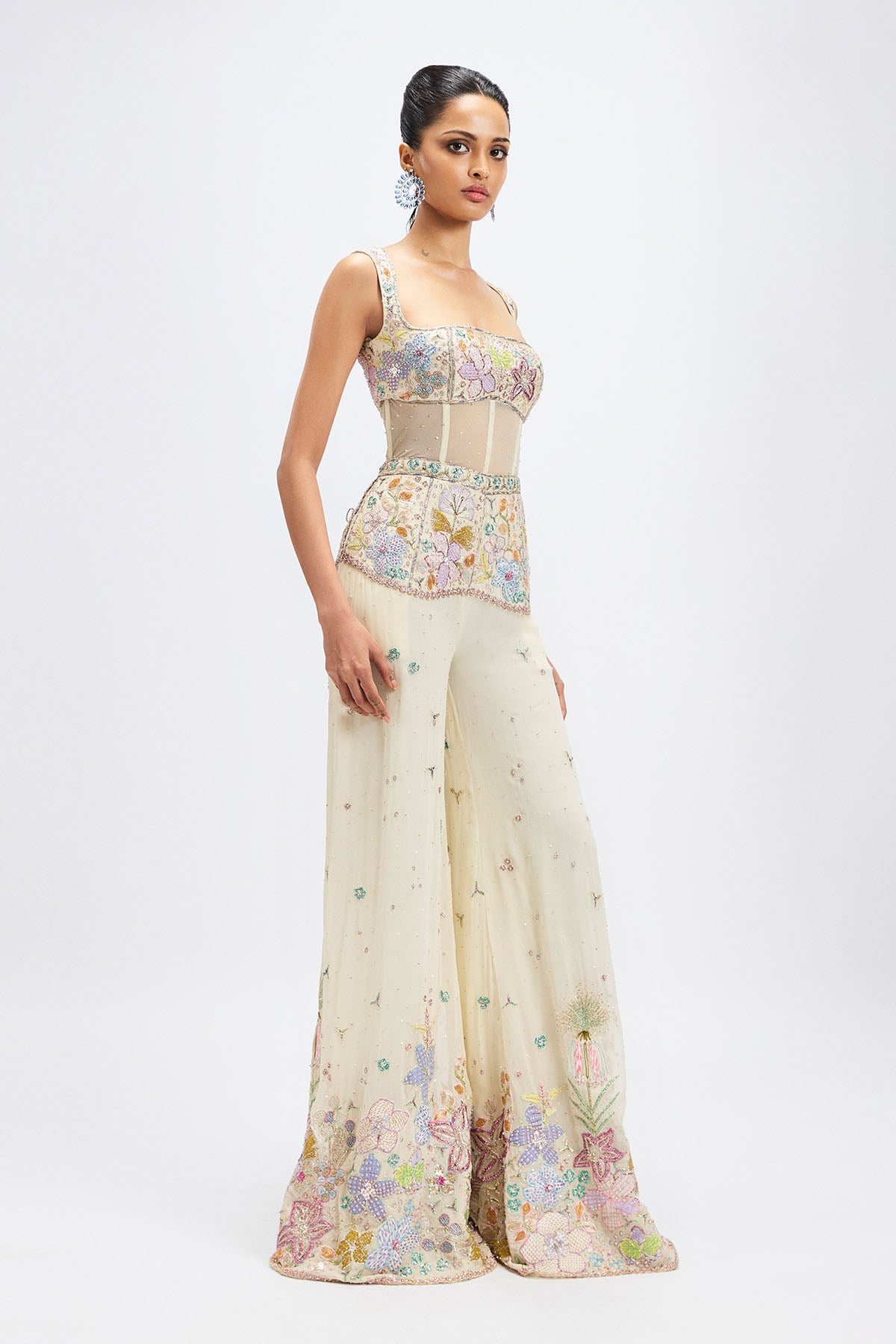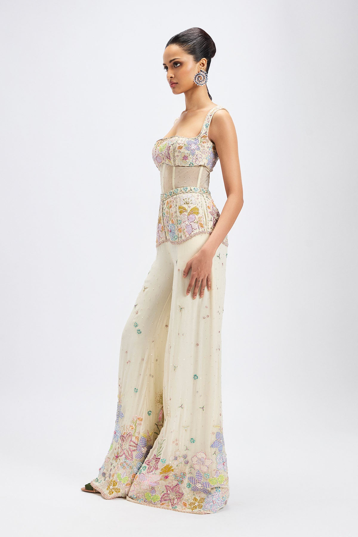 Matilda ivory applique embellished georgette midriff panelled jumpsuit
