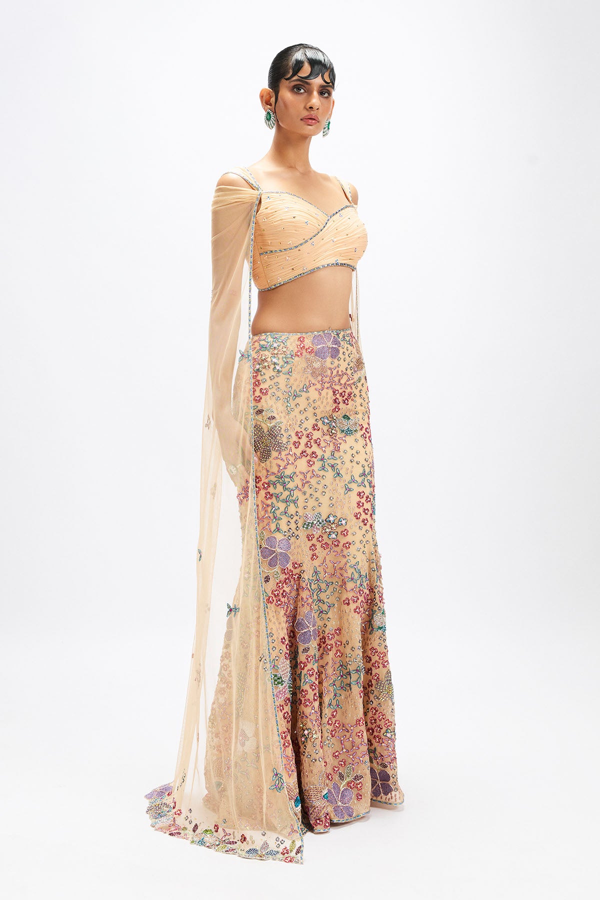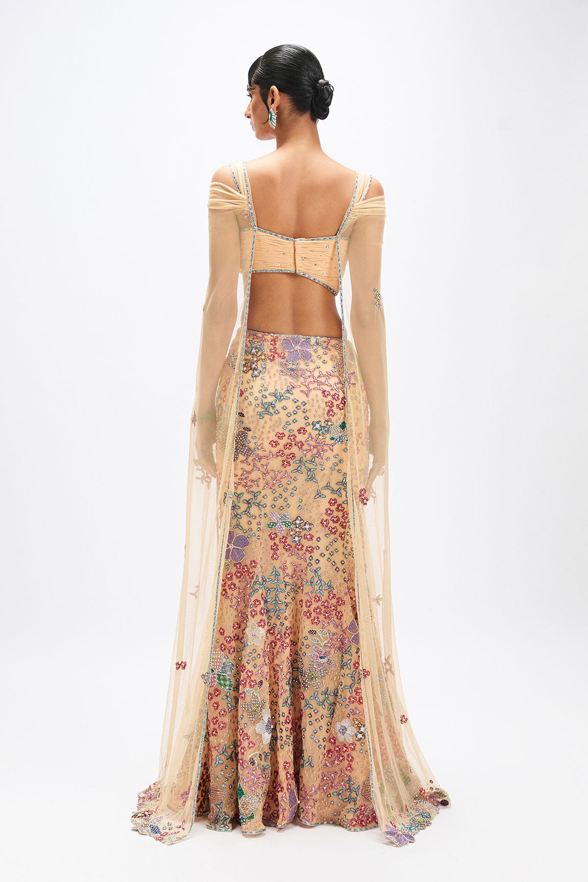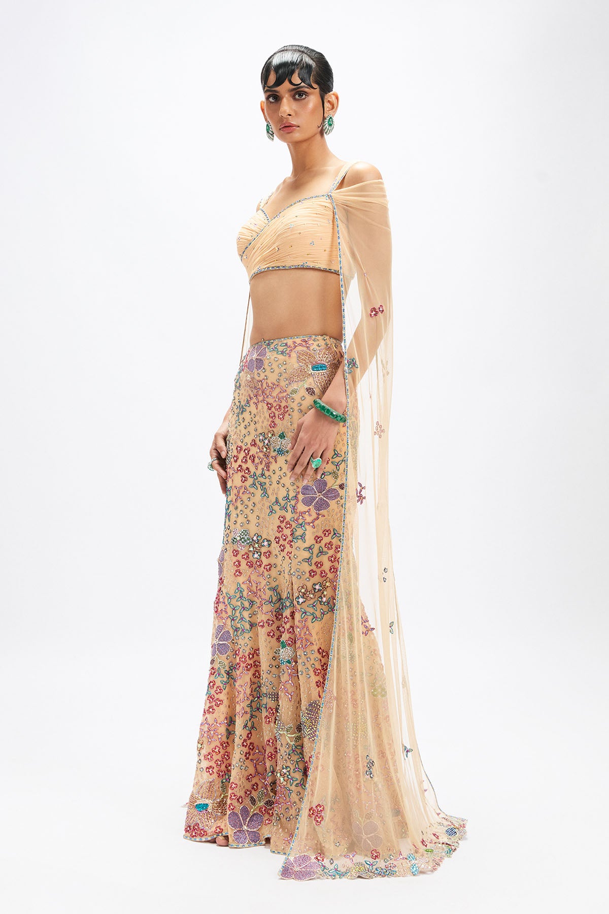 Matilda beige applique embellished tulle mermaid lehenga with cape & ruched asymmetric blouse