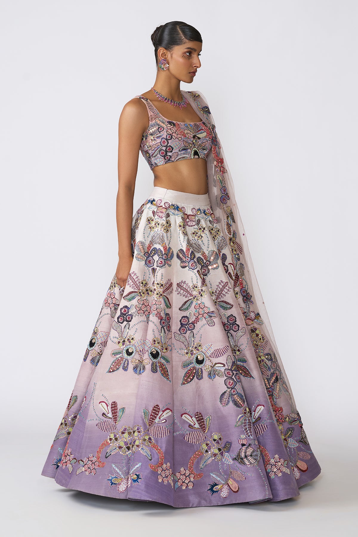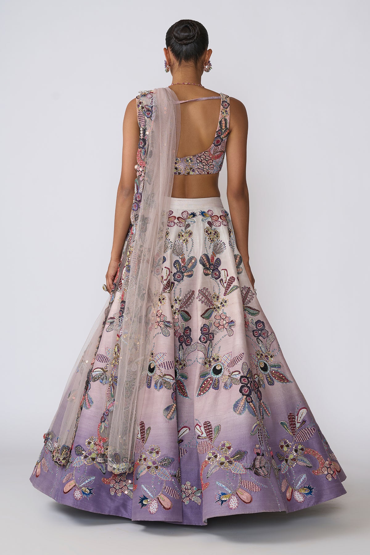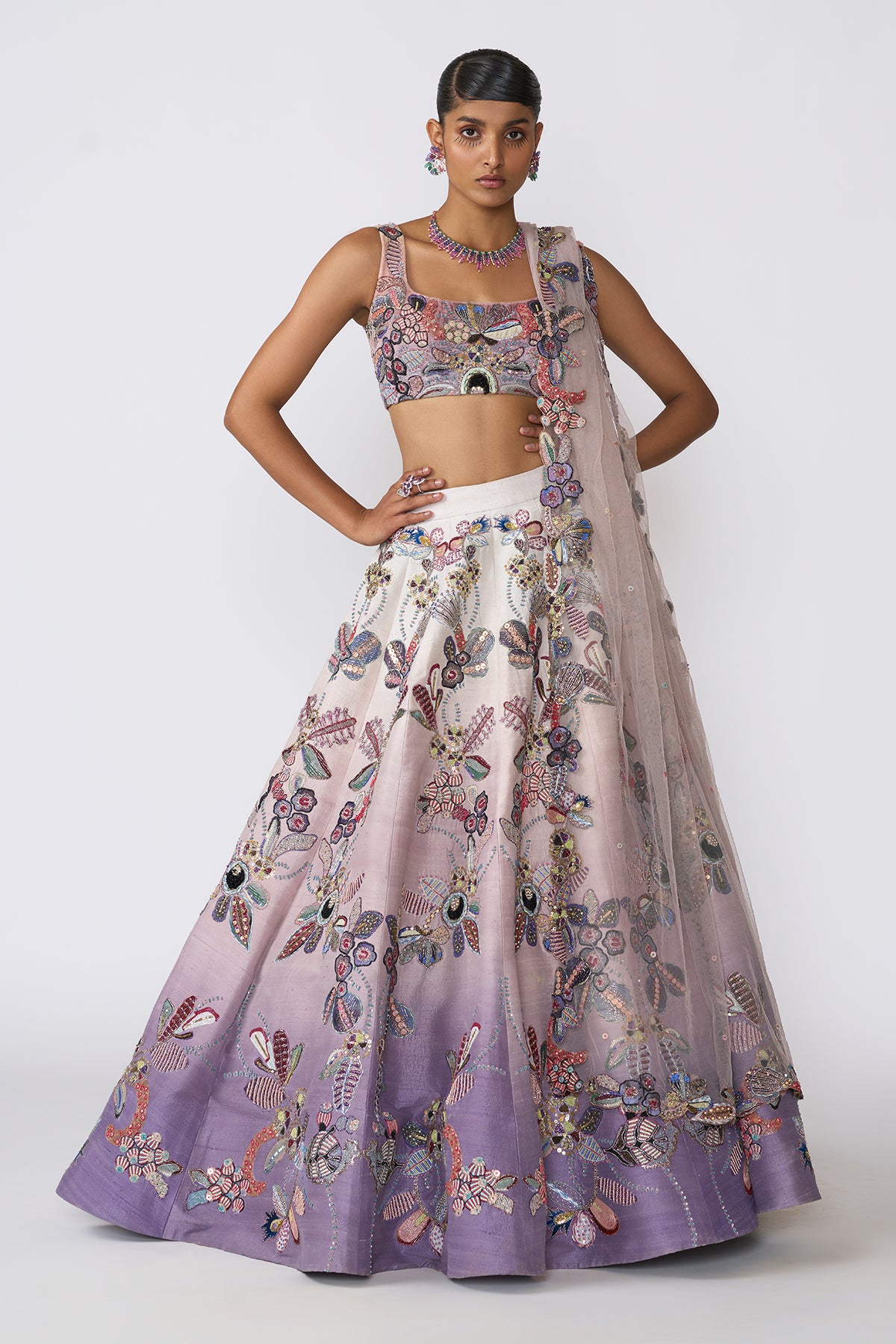 Kinfolk ivory- amethyst ombre applique embellished raw silk lehenga, blouse & tulle dupatta.