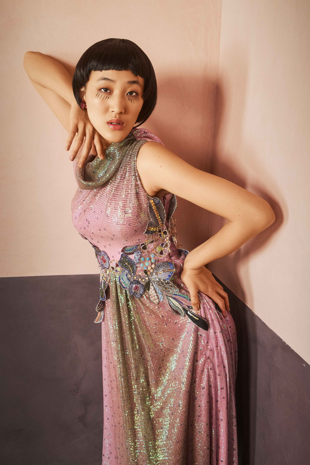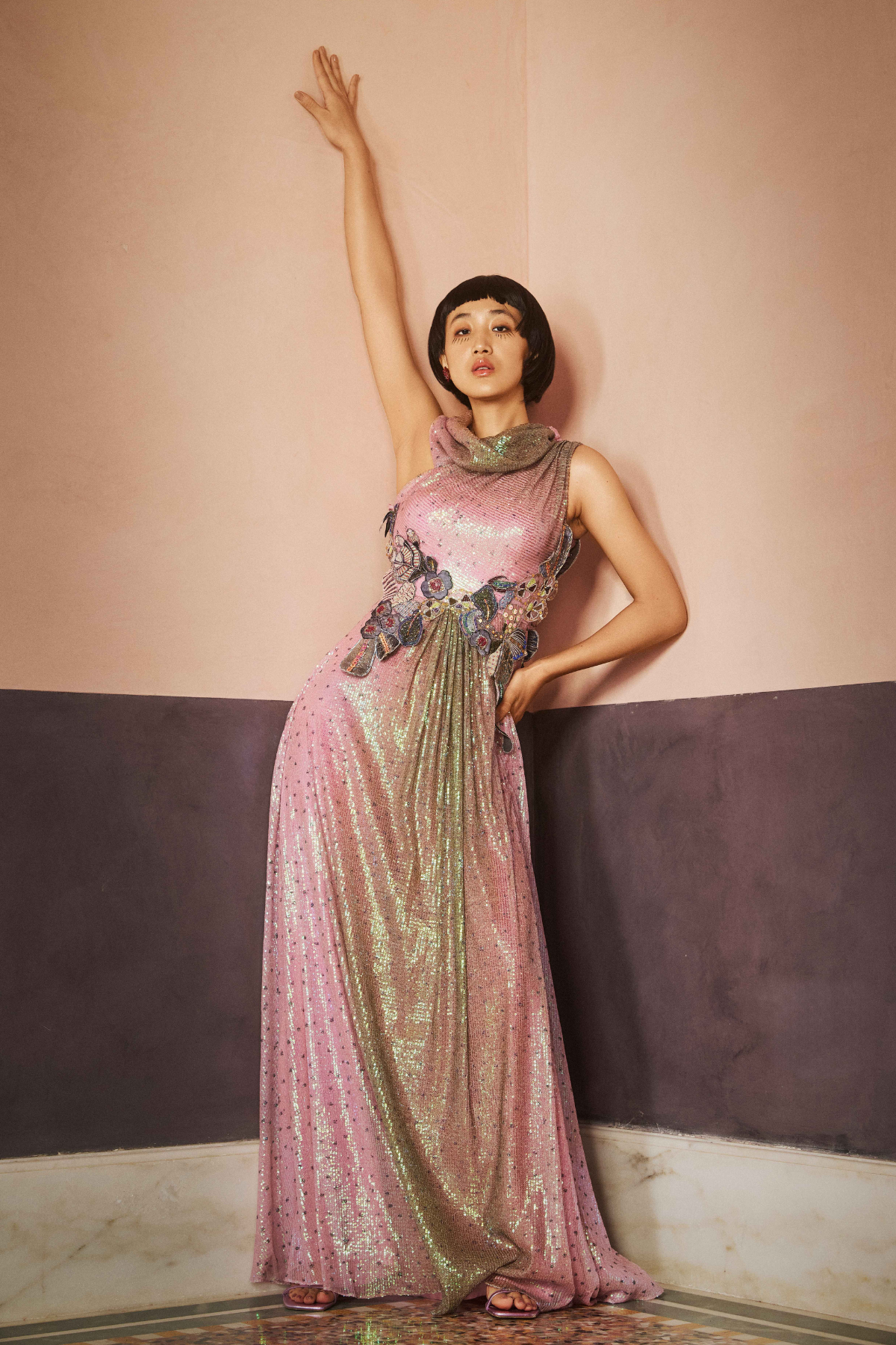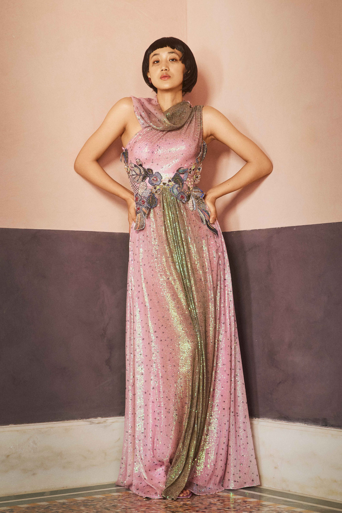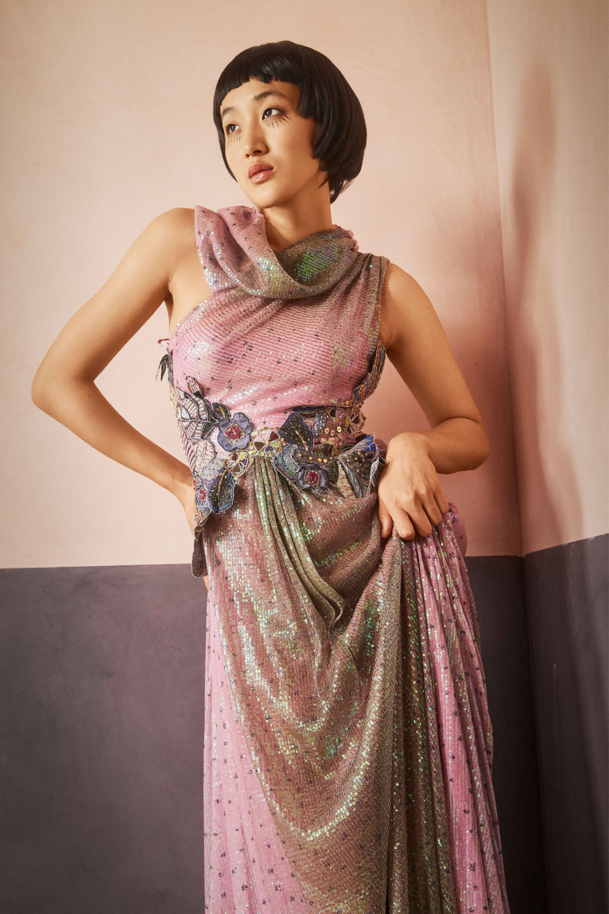 Kinfolk pink-brown ombre printed applique embellished sequin tulle one shoulder cowl & waist 3D flower detail gown.