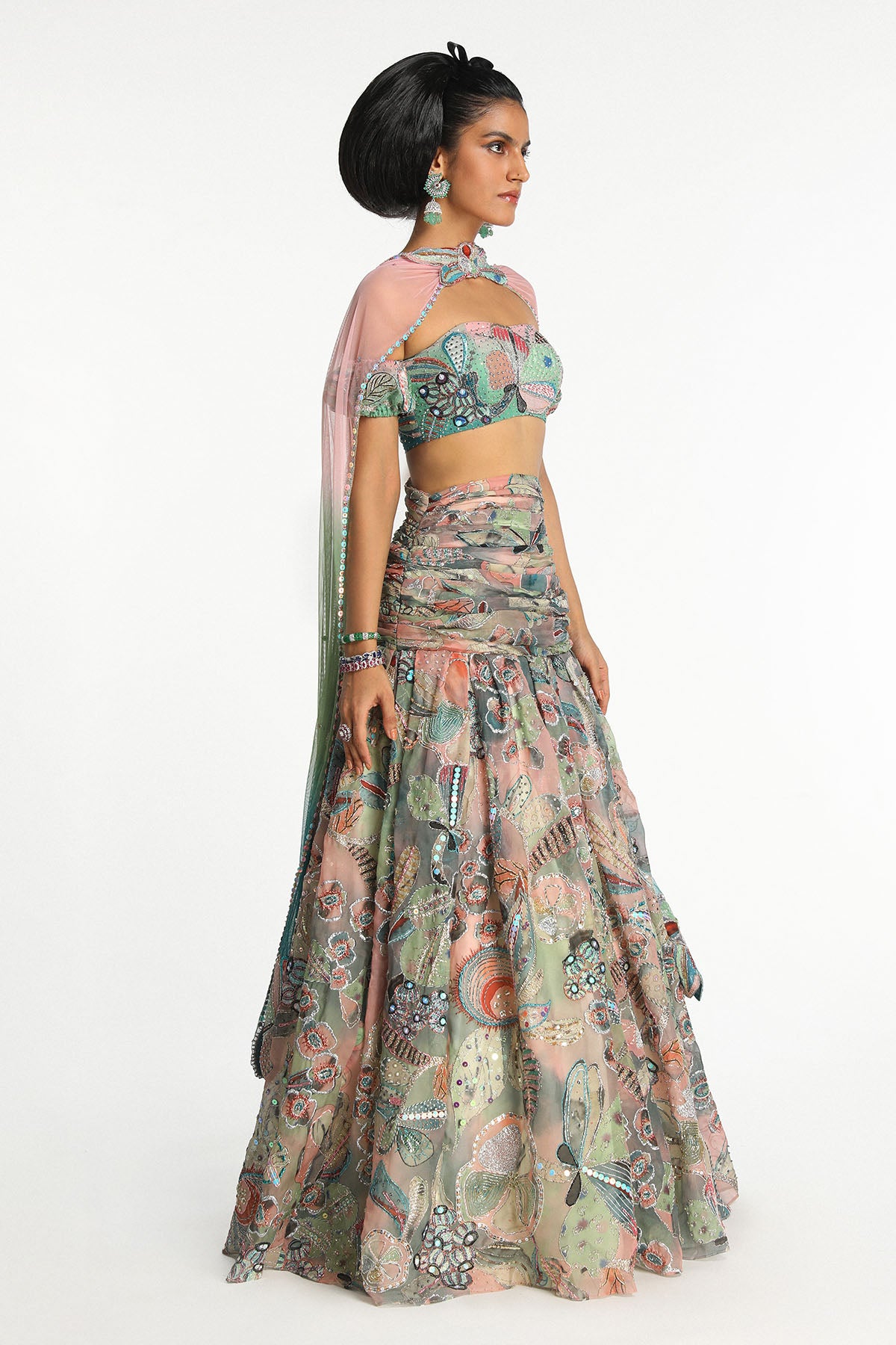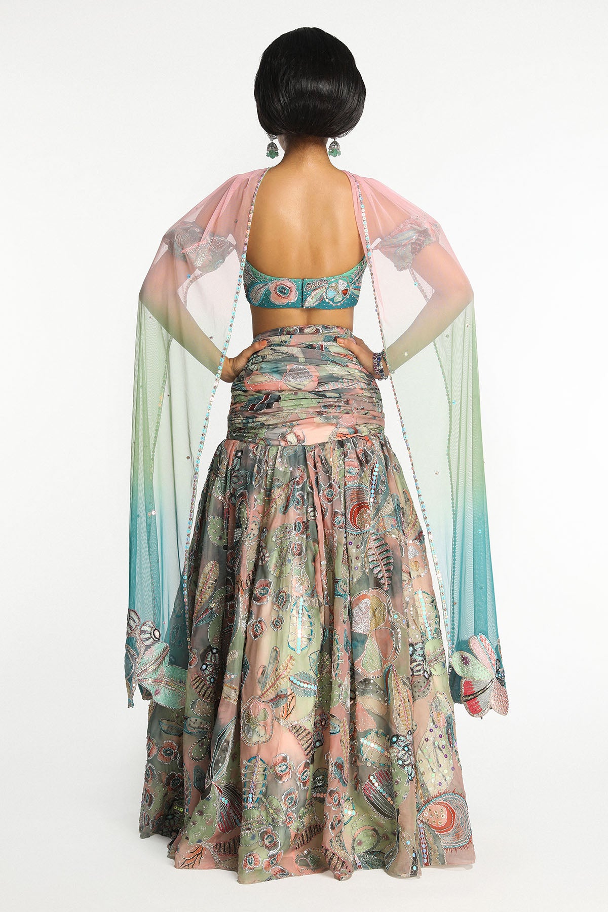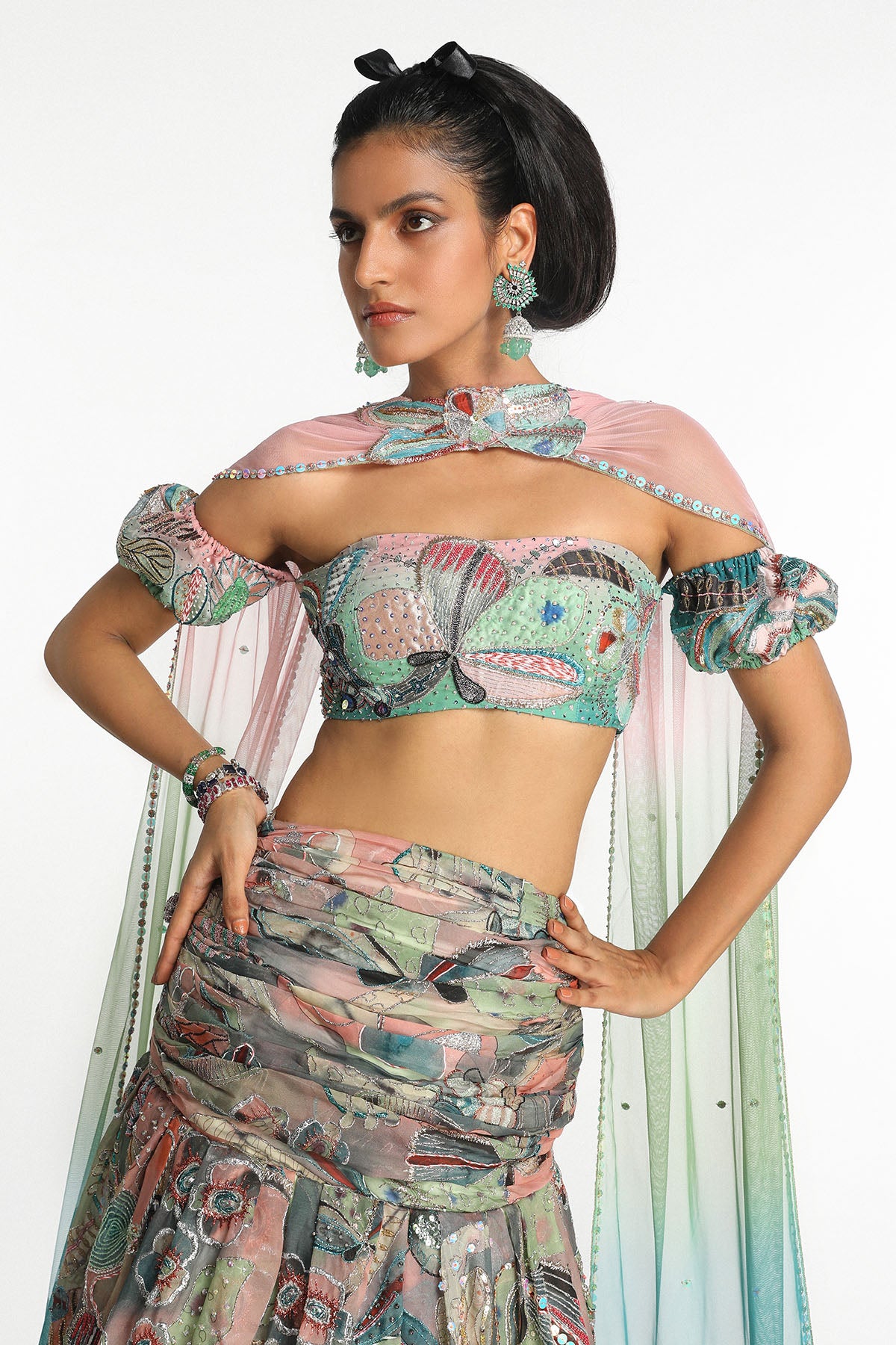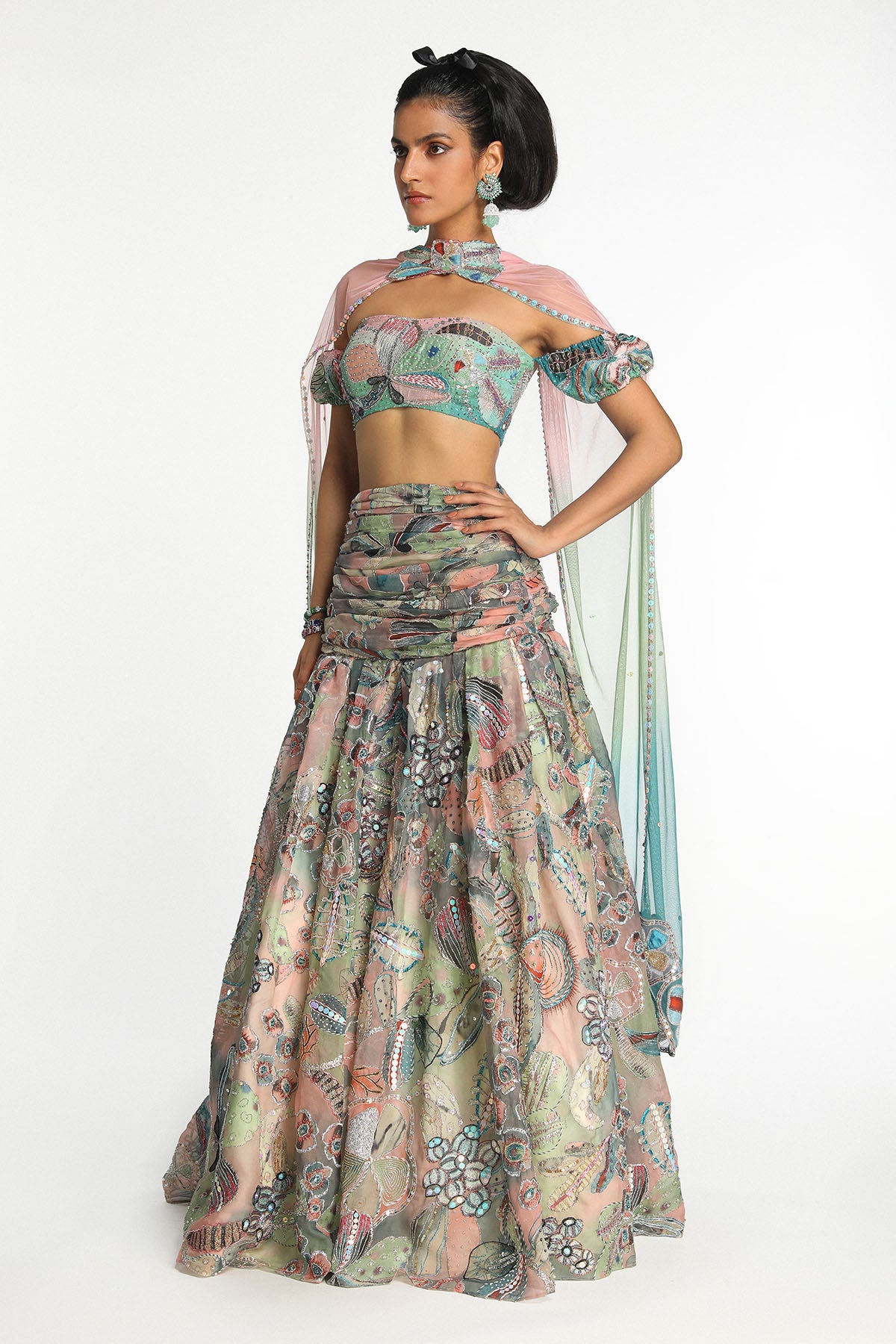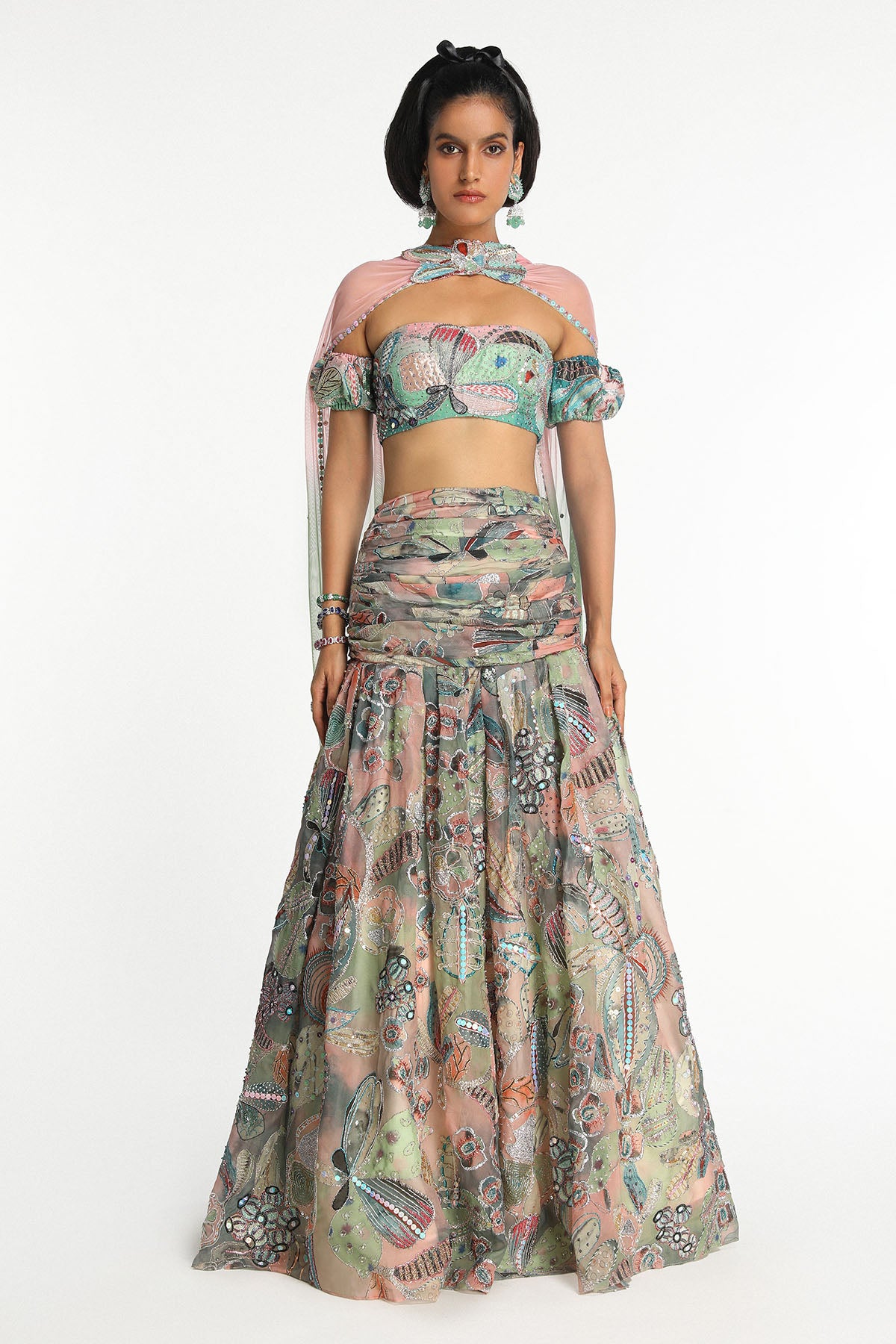Kinfolk Aurora Printed Applique Embellished Organza Off Shoulder Blouse with Gathered Ruched Waist Skirt and Tulle Dupatta