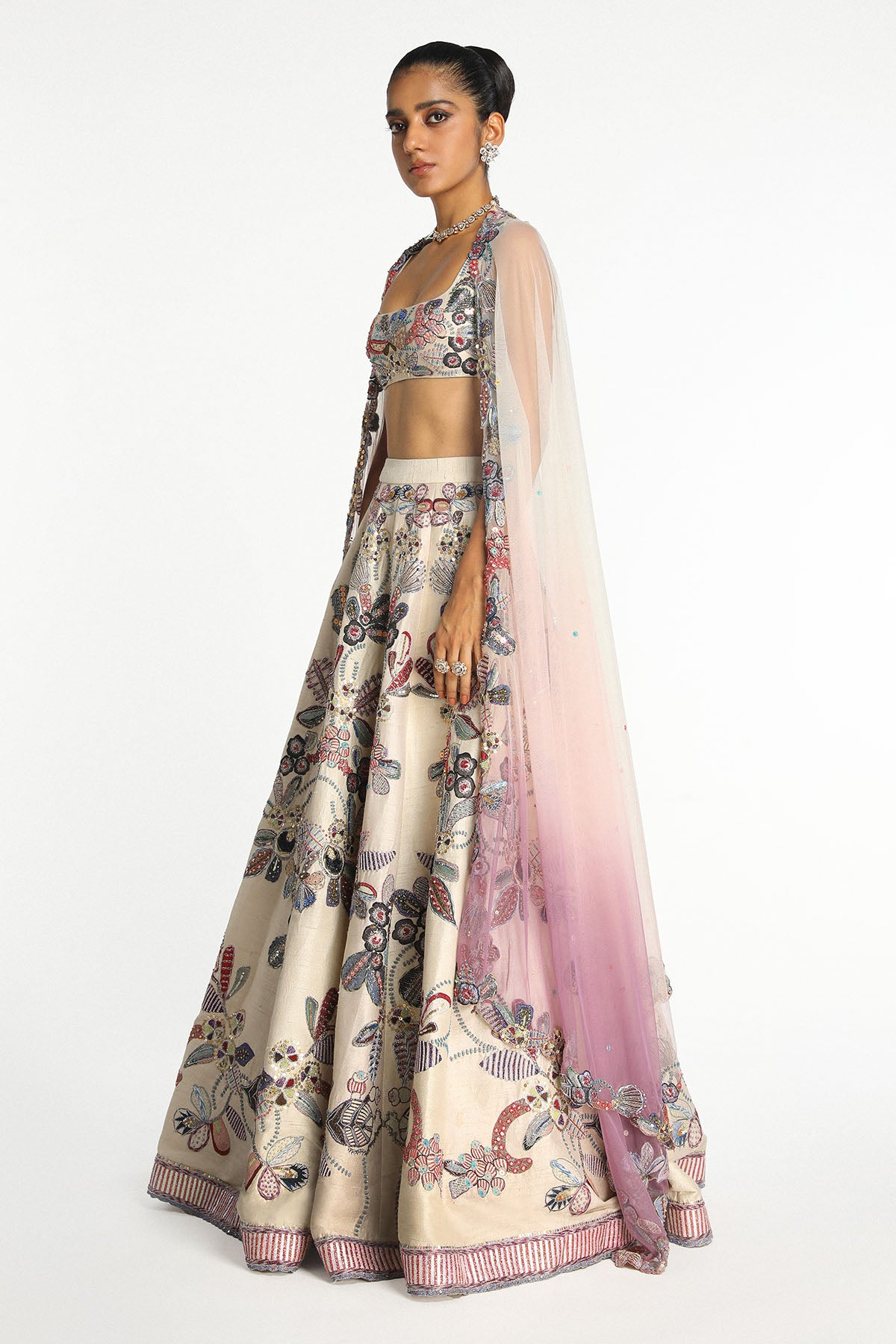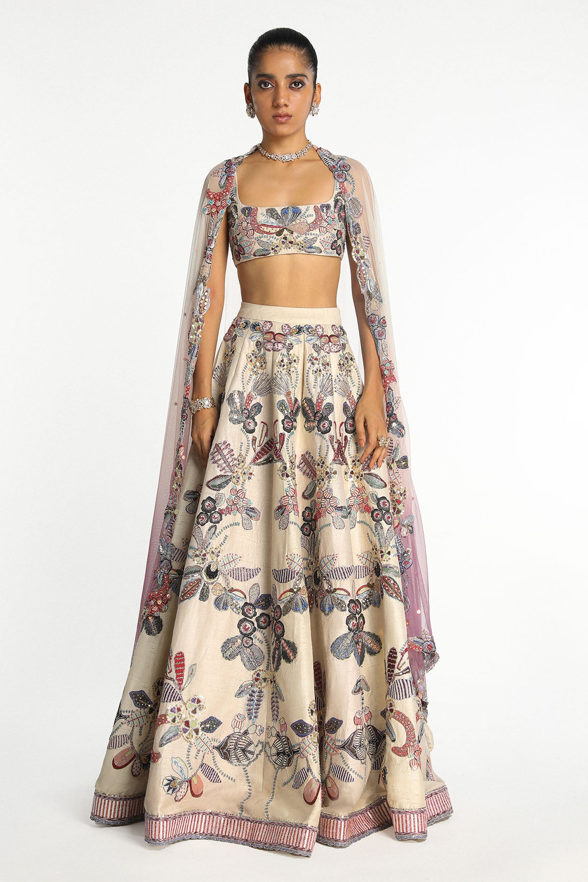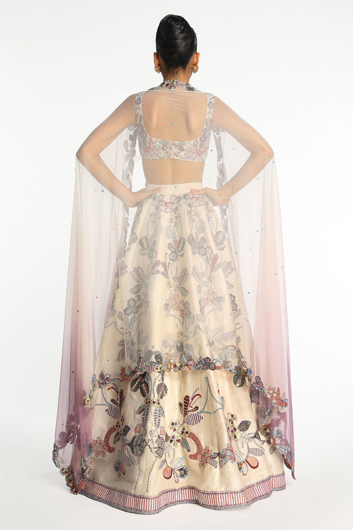 Kinfolk Ivory Applique Embellished Raw Silk Vb Lehenga, Blouse & Tulle Dupatta