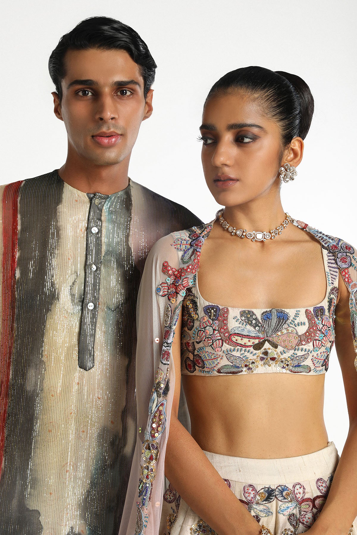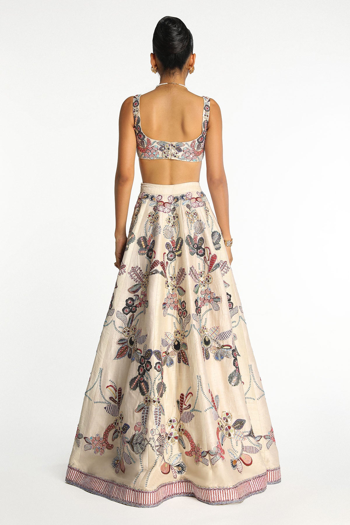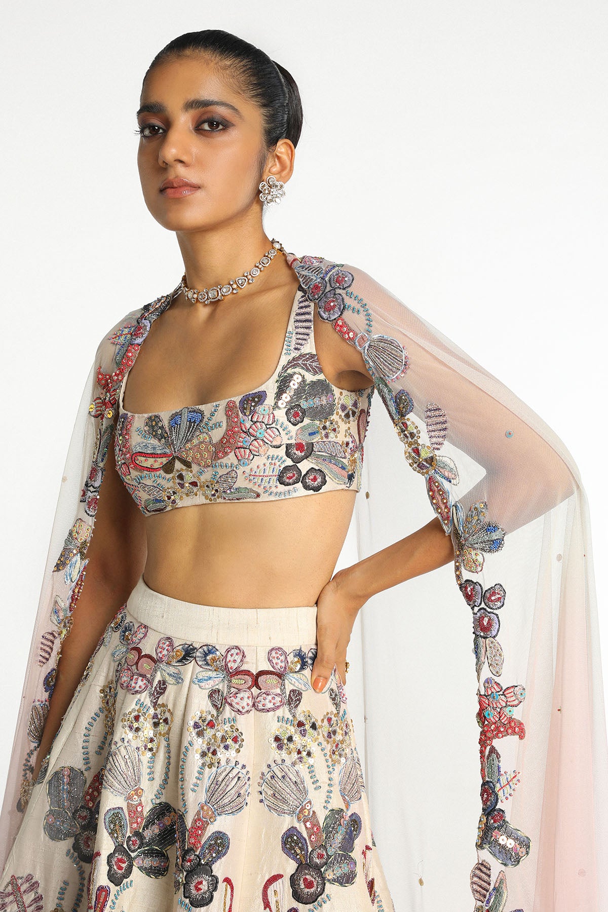 Kinfolk Ivory Applique Embellished Raw Silk Vb Lehenga, Blouse & Tulle Dupatta
