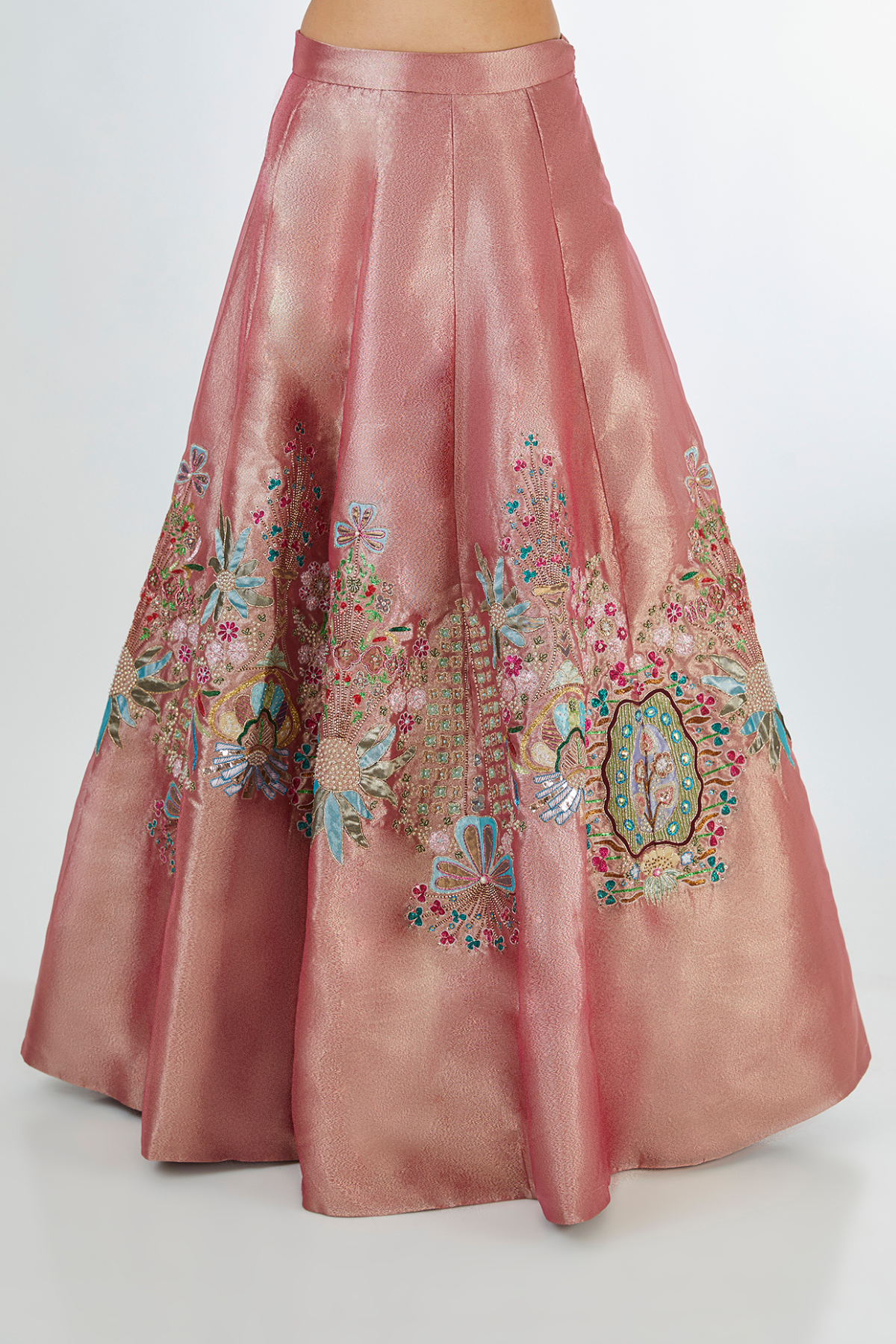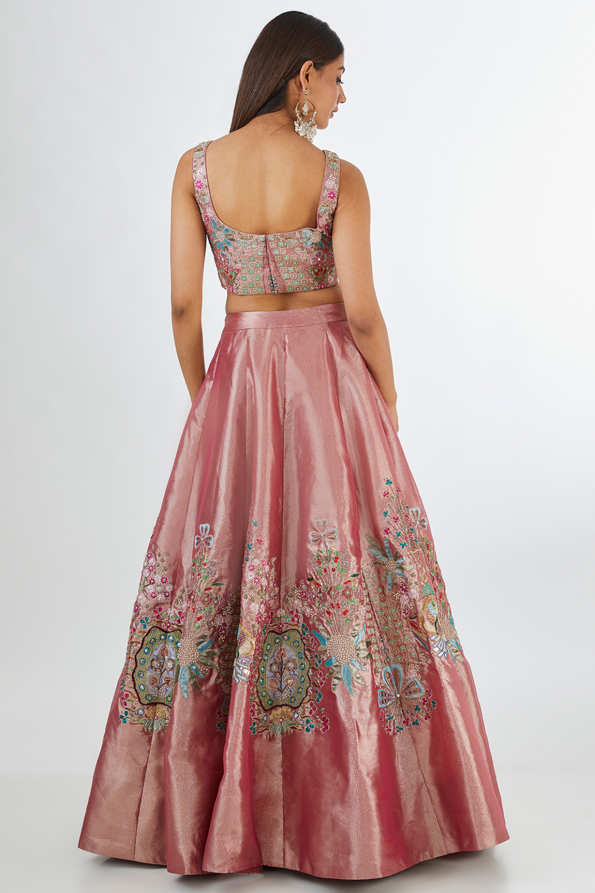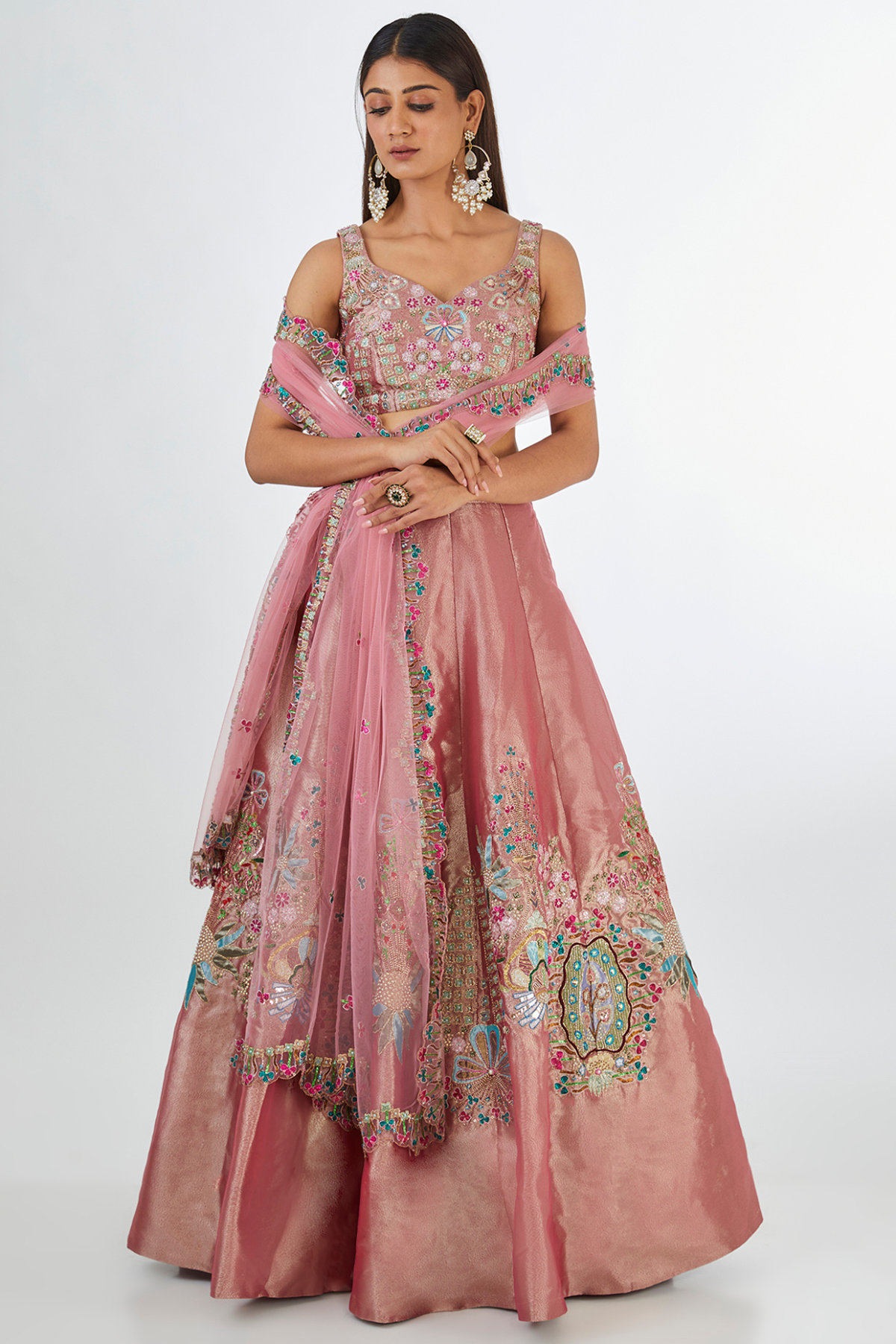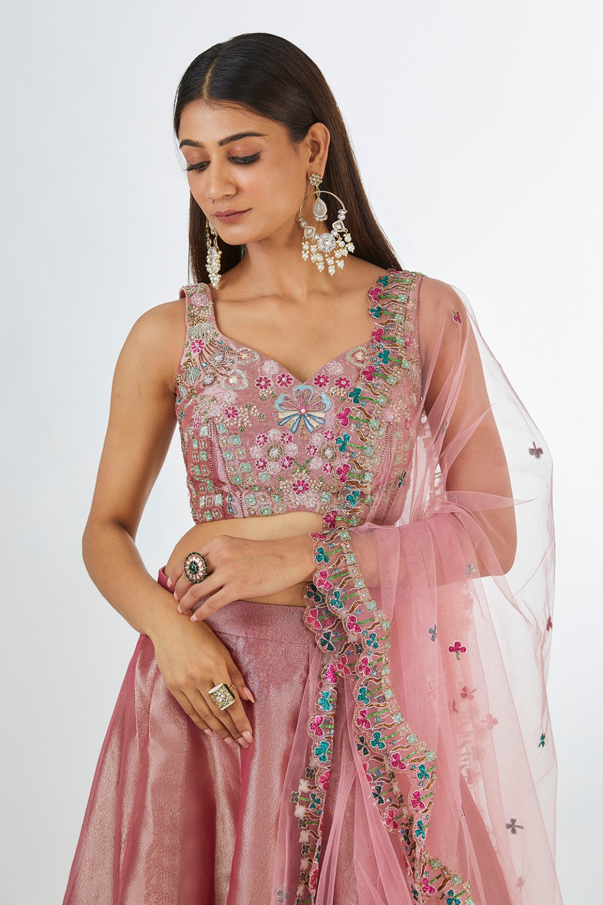 Banafsh pink appliqued embellished Tissue MK lehenga with blouse & dupatta.