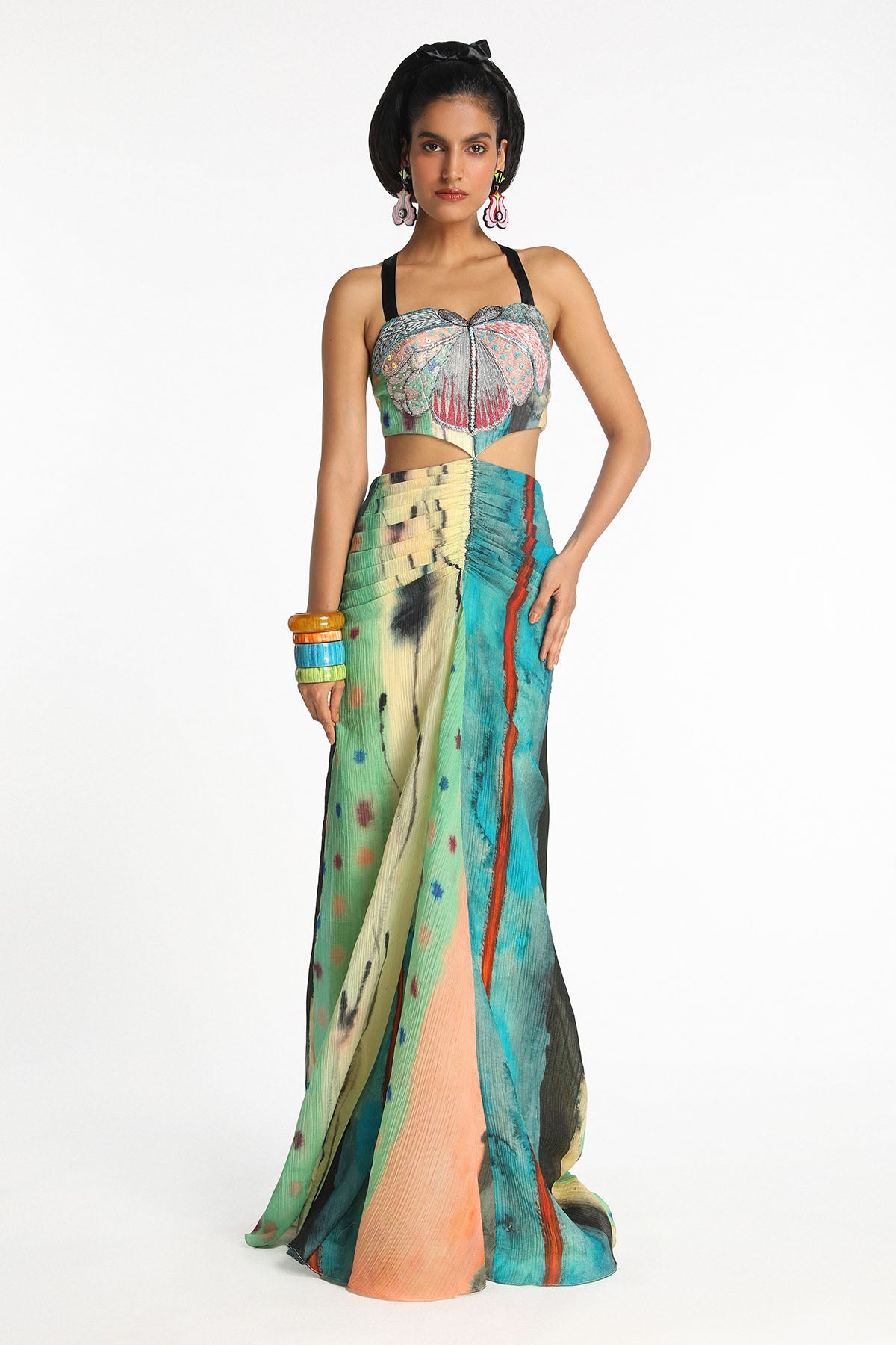 Kinfolk Aurora printed applique embellished cupro sweetheart bodice midriff cutout front gathered skirt gown