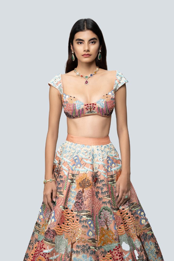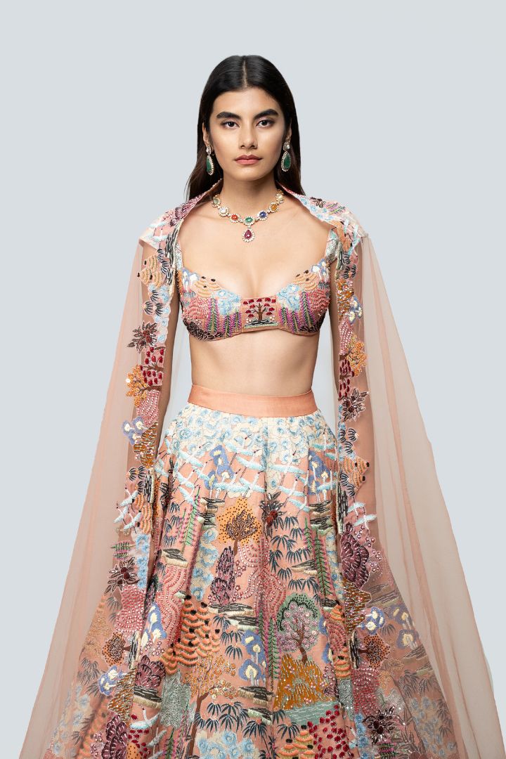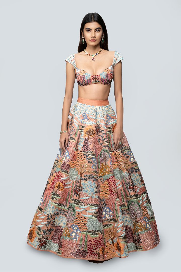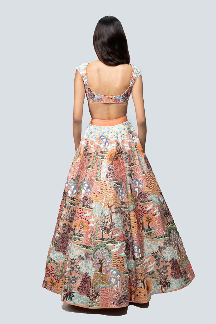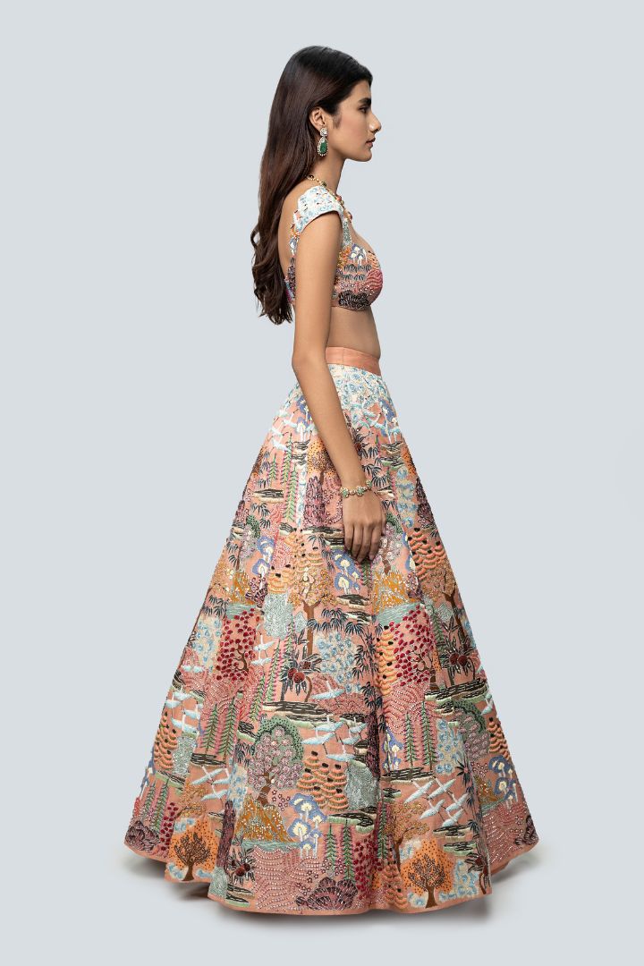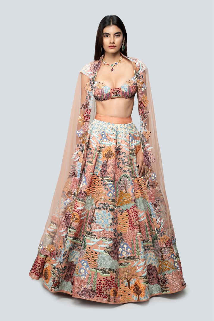 Our 'Divergence' peach printed appliquéd and embellished kasab satin lehenga with blouse and tulle dupatta.