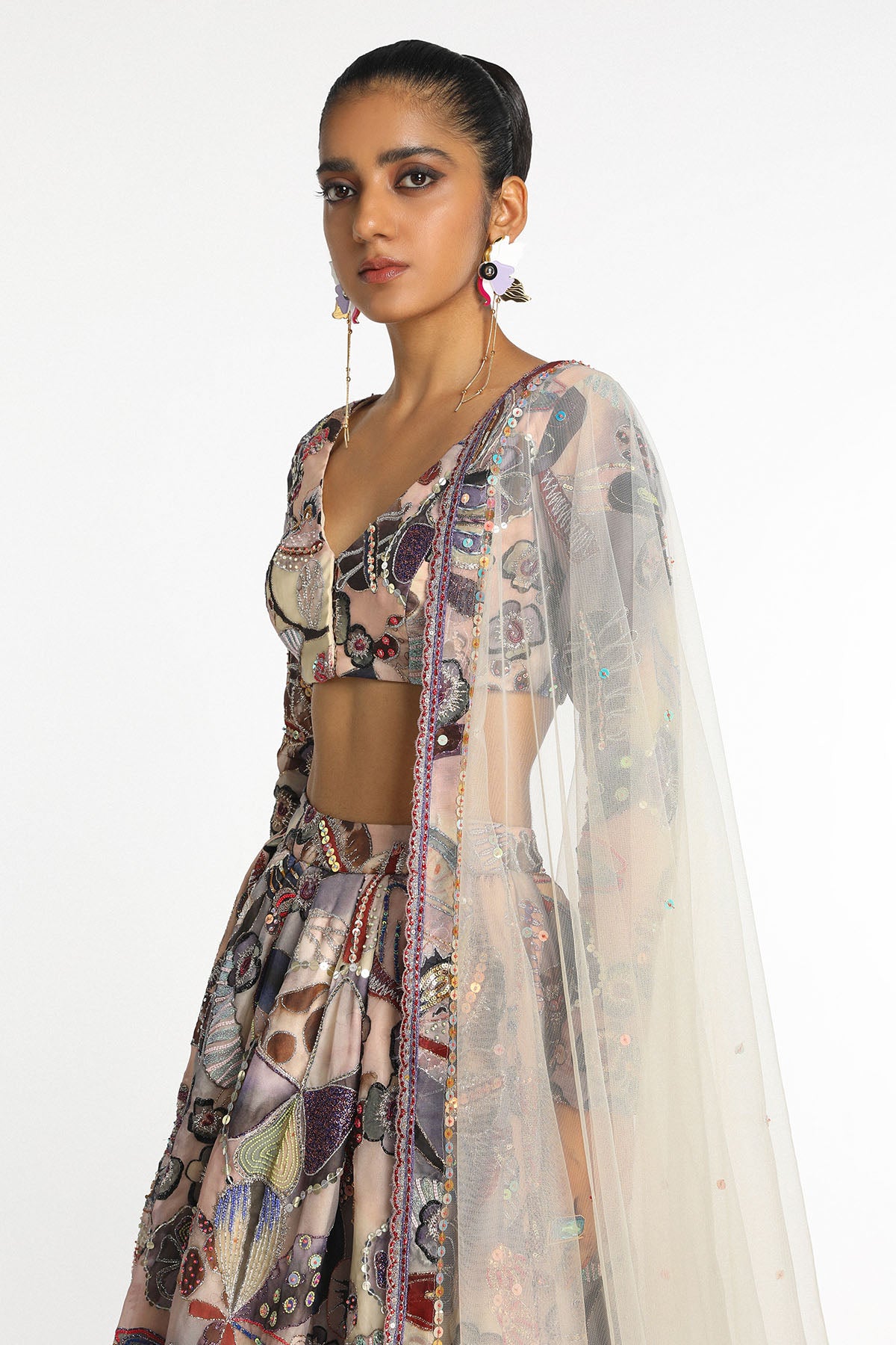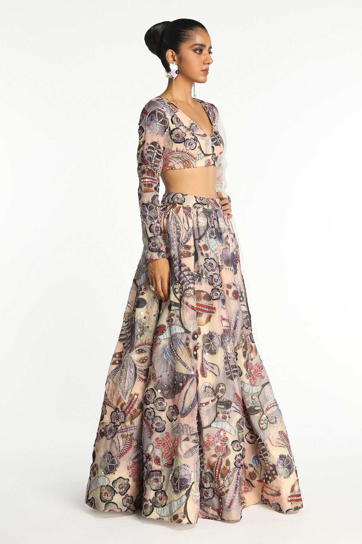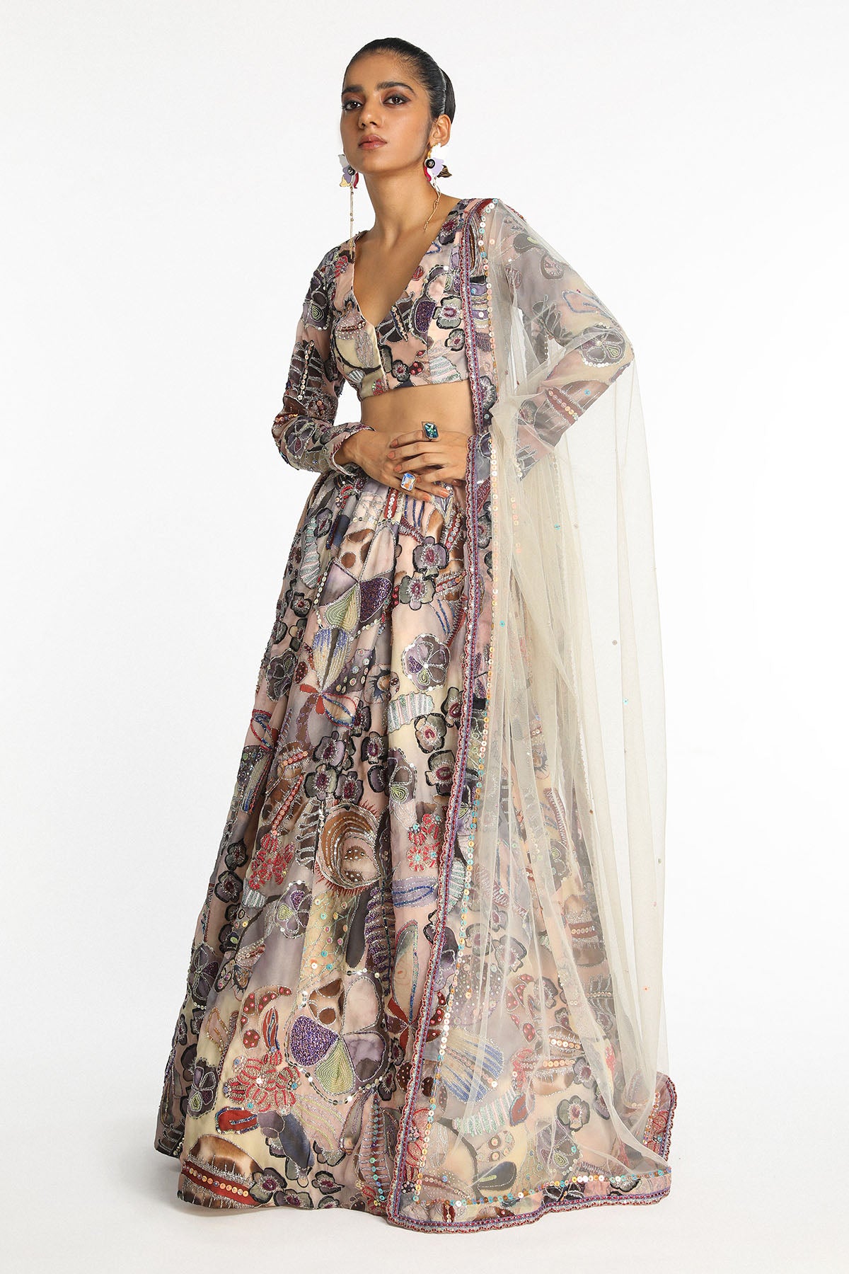 Kinfolk Mist Purple Printed Embellished Organza Gathered Skirt with V Neckline Blouse & Dupatta