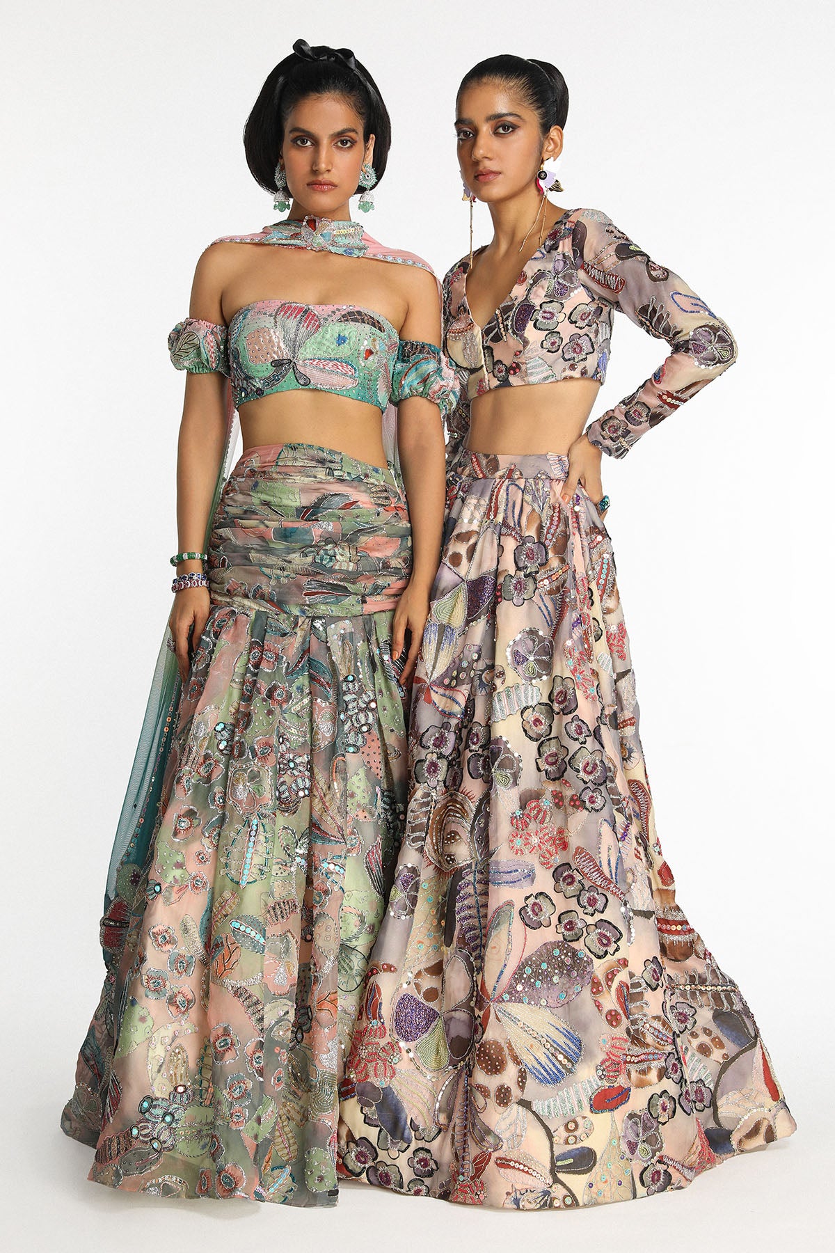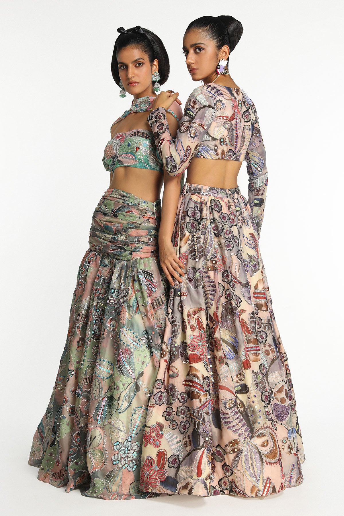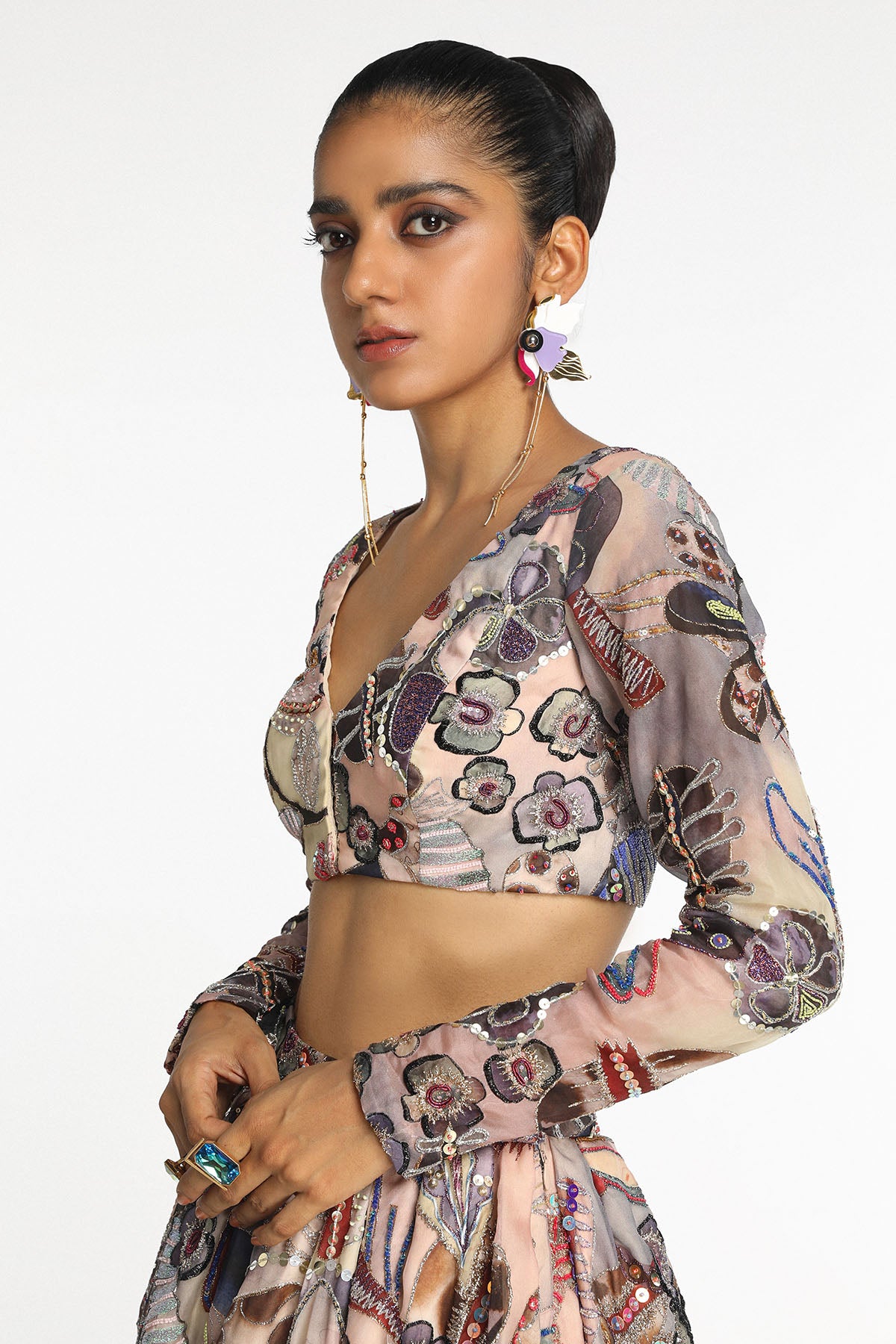 Kinfolk Mist Purple Printed Embellished Organza Gathered Skirt with V Neckline Blouse & Dupatta