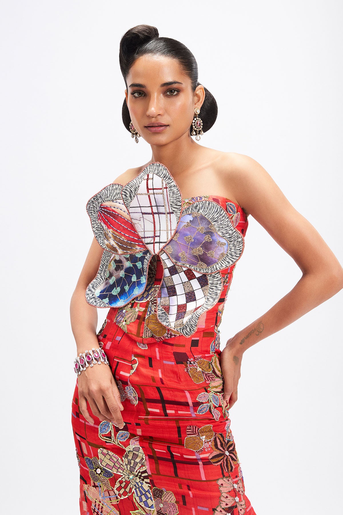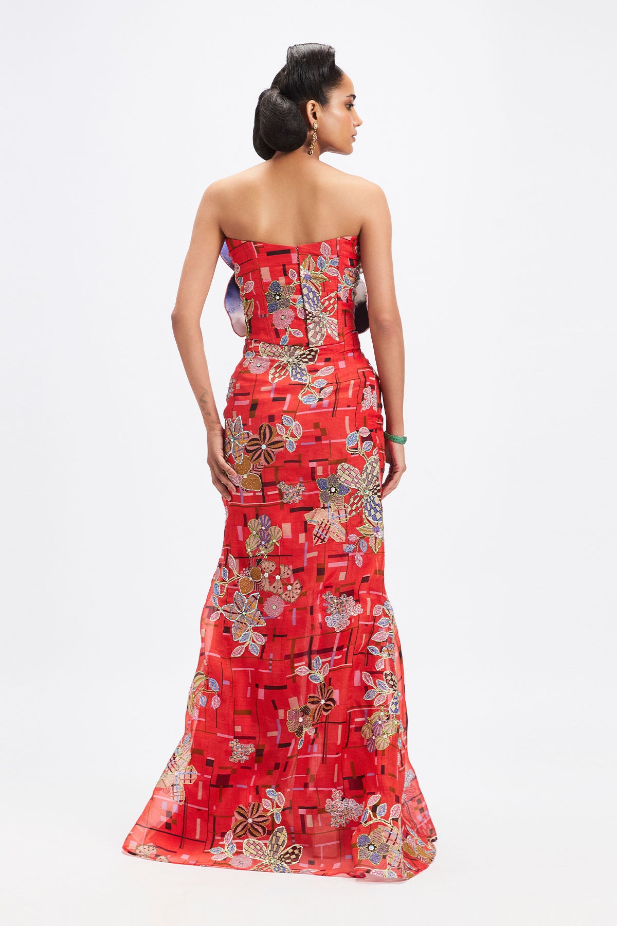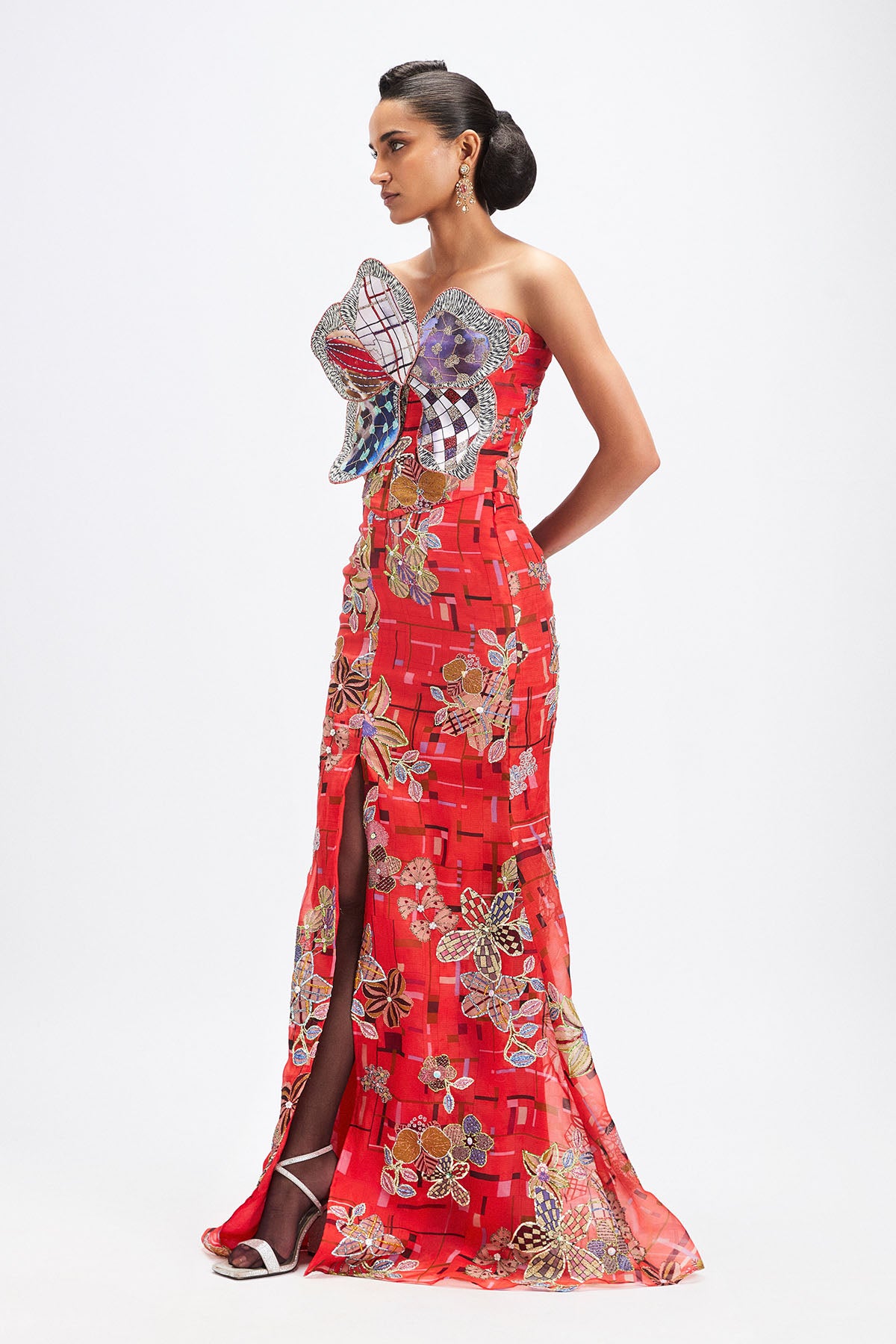 Matilda corel printed applique embellished 3d flower corset top with organza long slit skirt