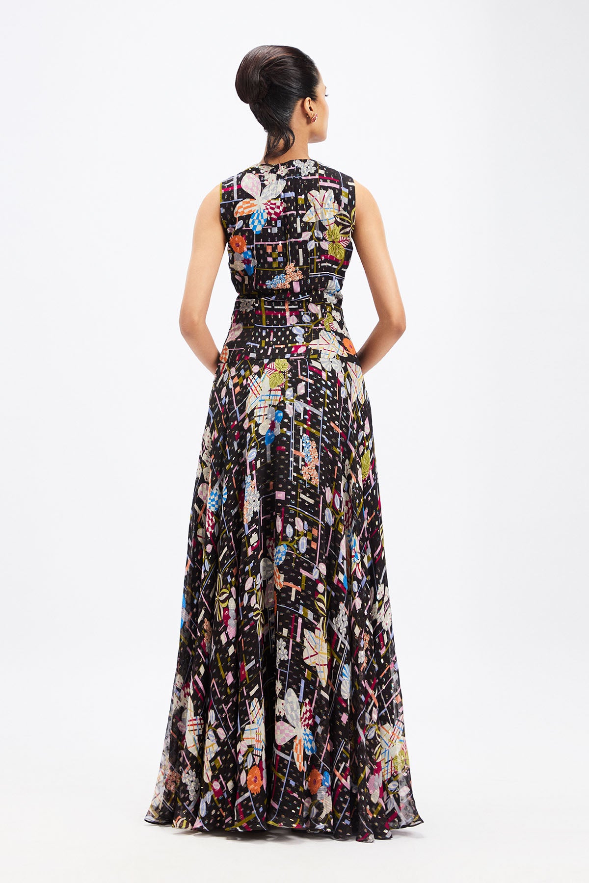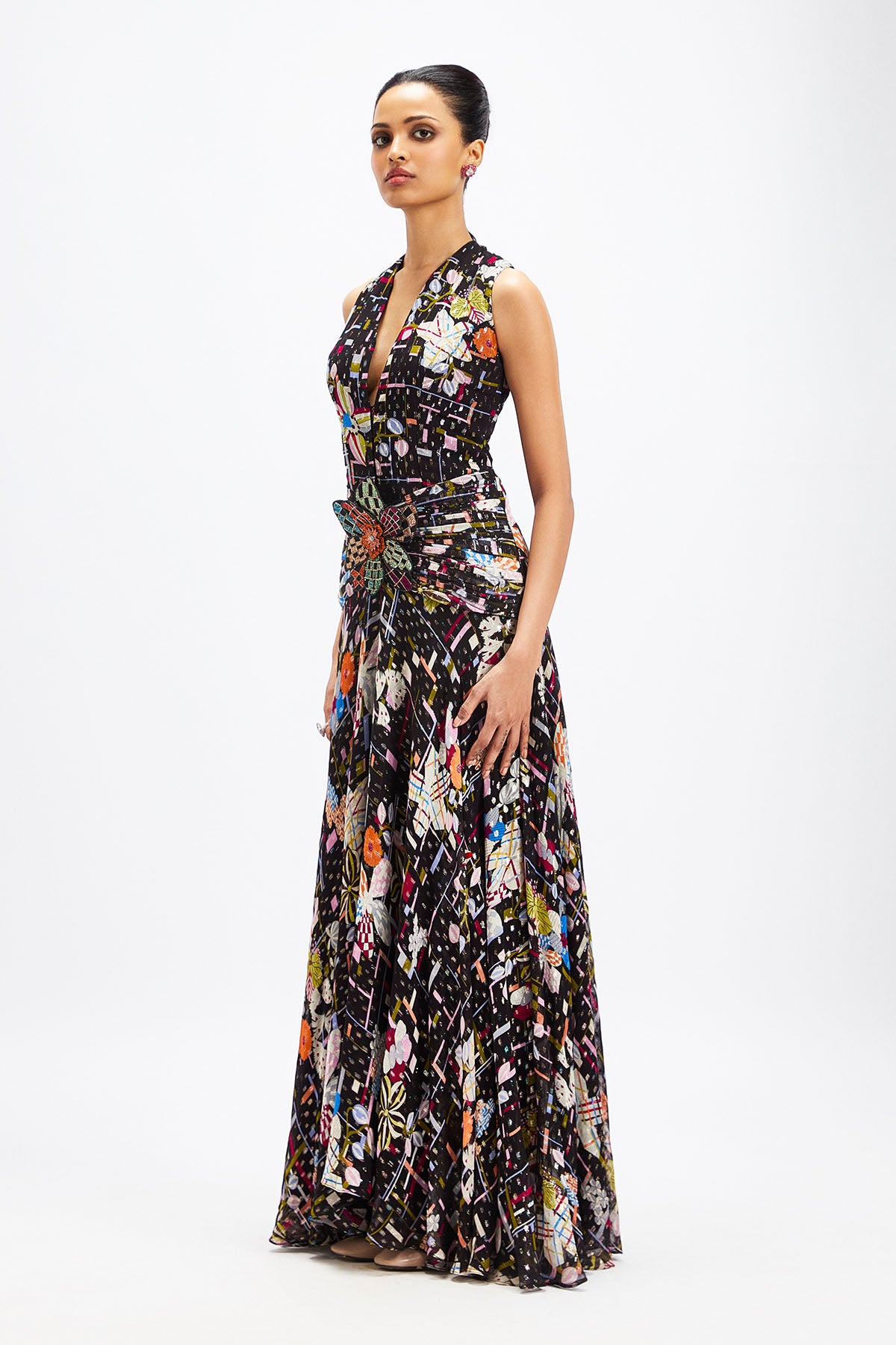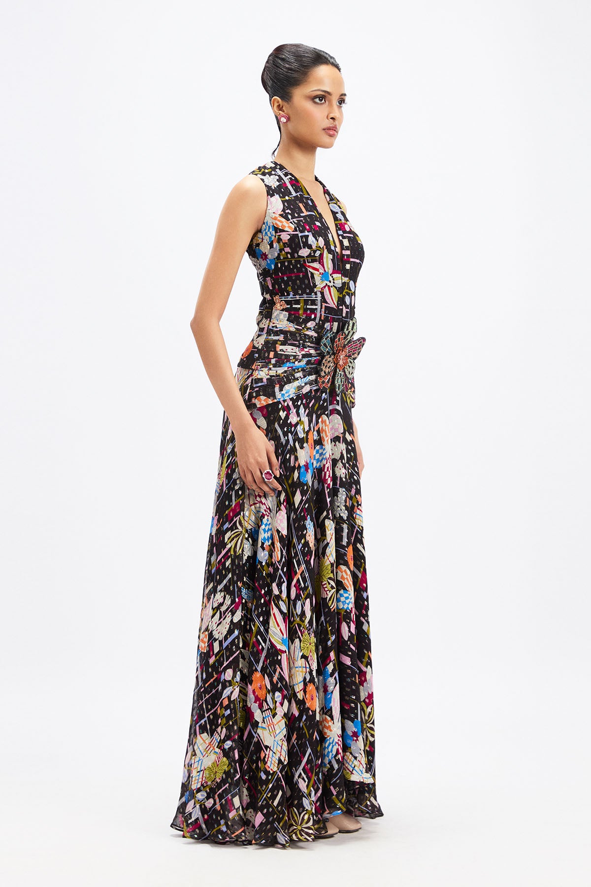 Matilda black printed lurex ruched maxi- dress with embellished 3d flower