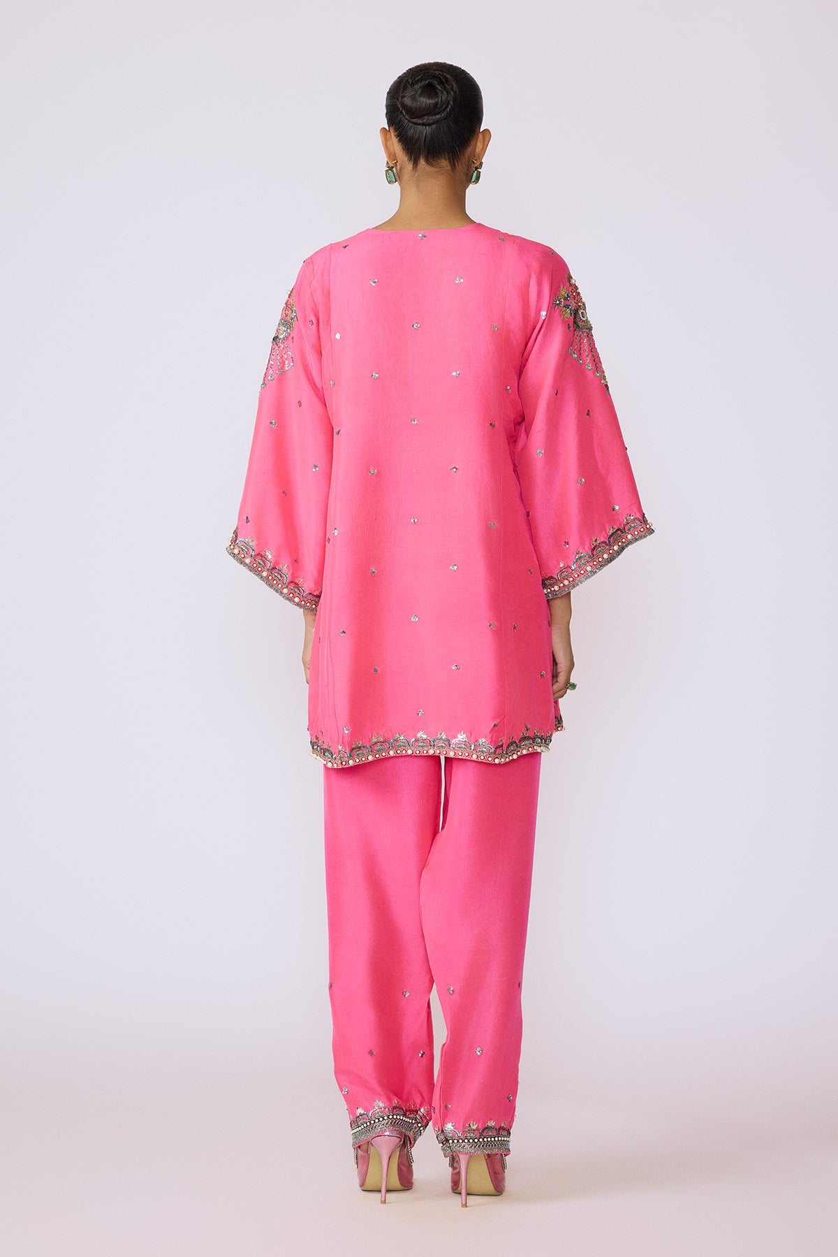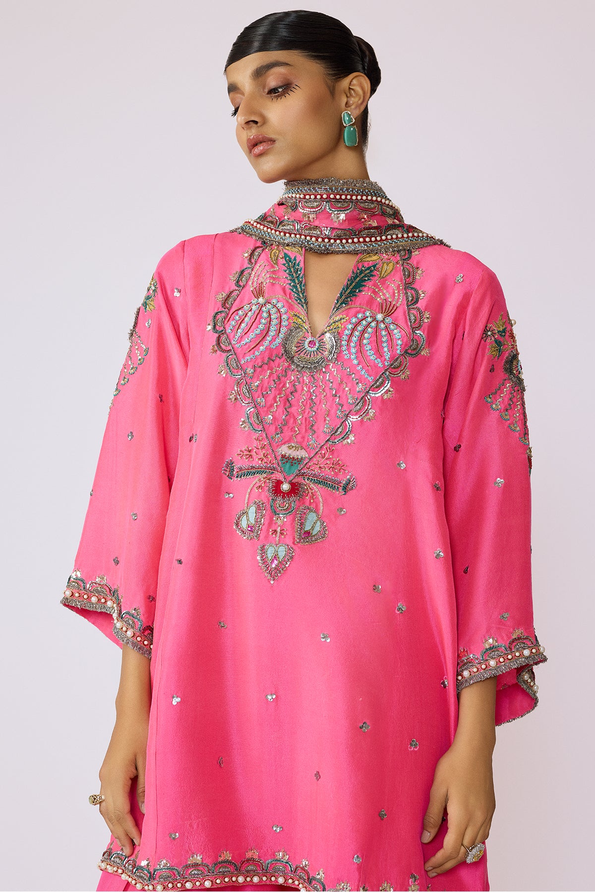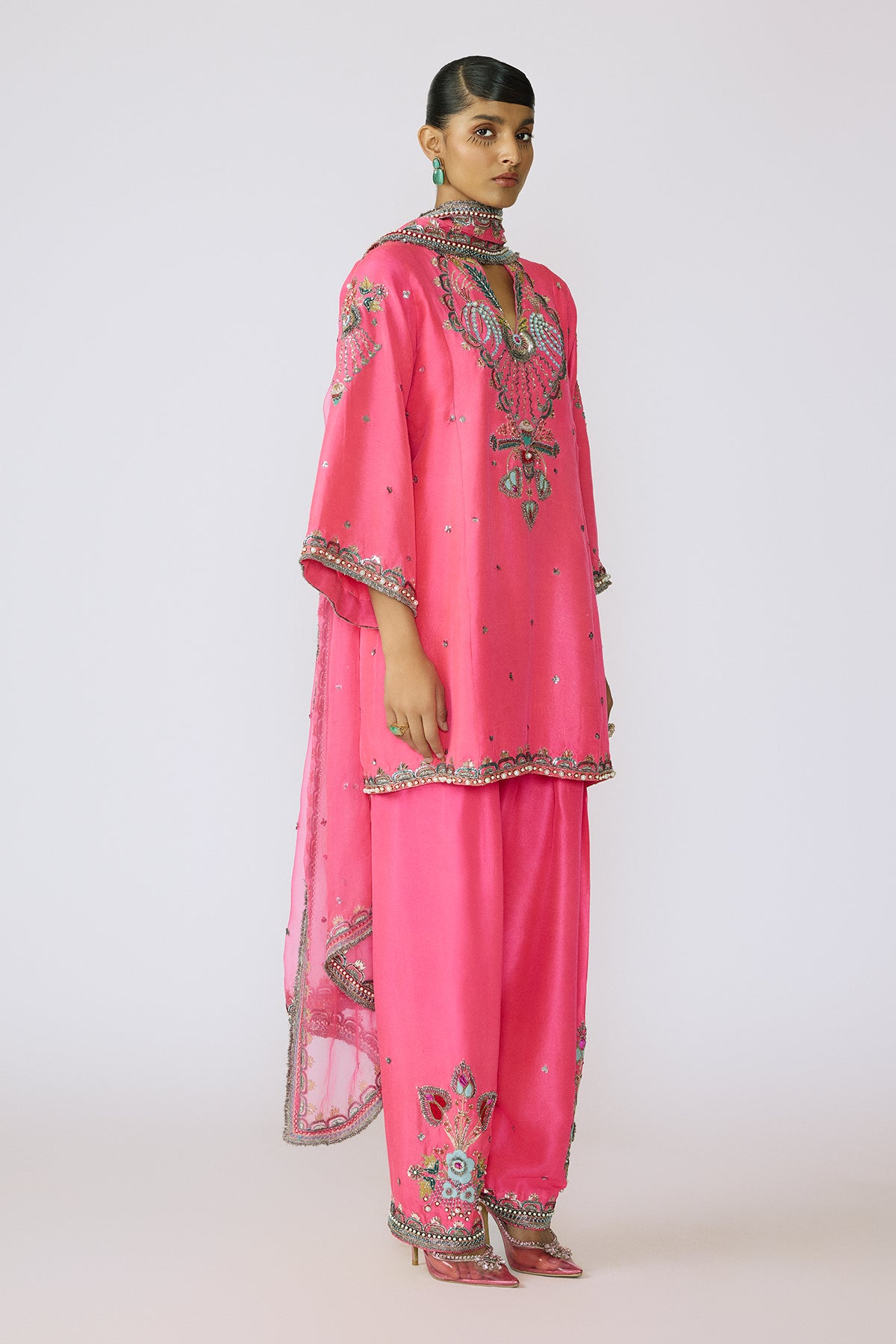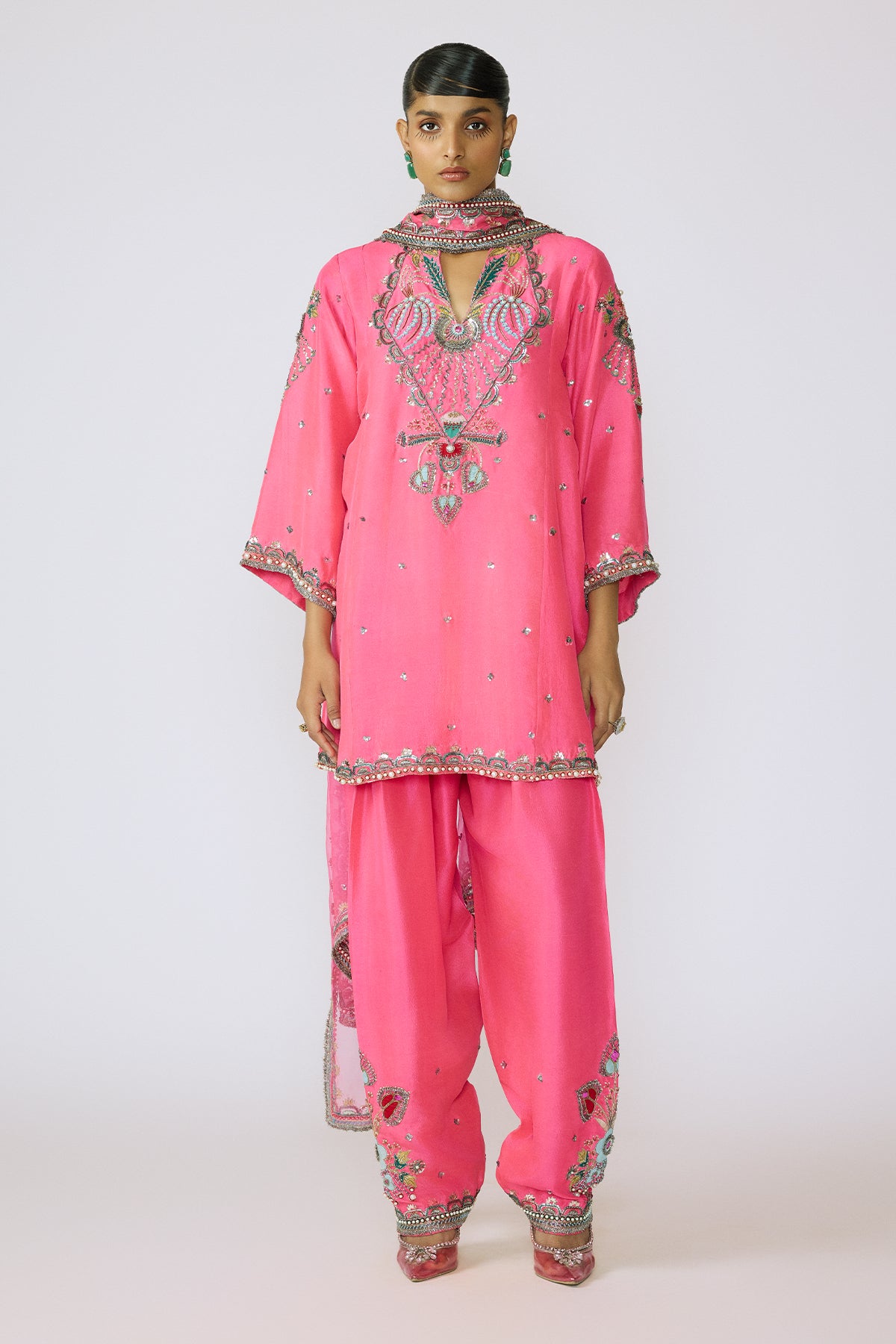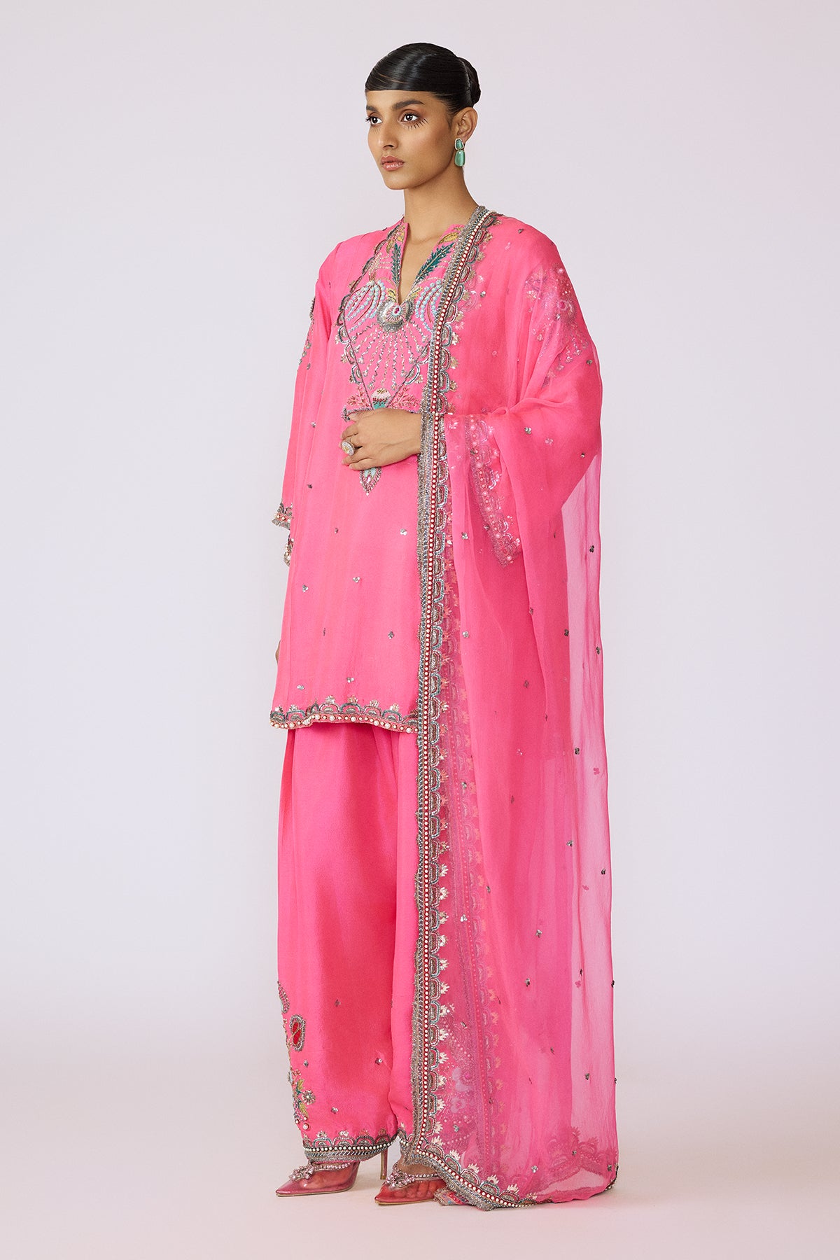 Paper doll hot pink applique embellished dupion silk patiyala kurta pants with organza dupatta.