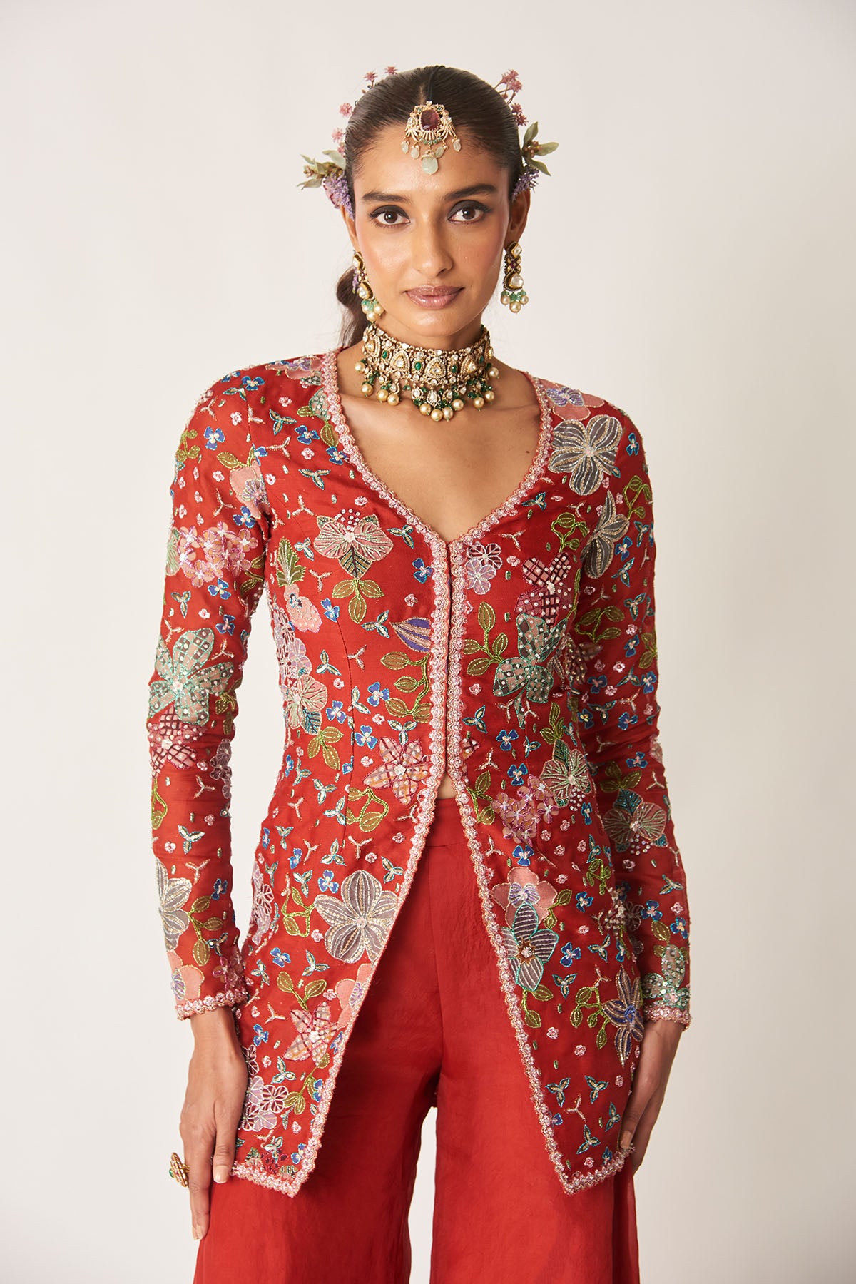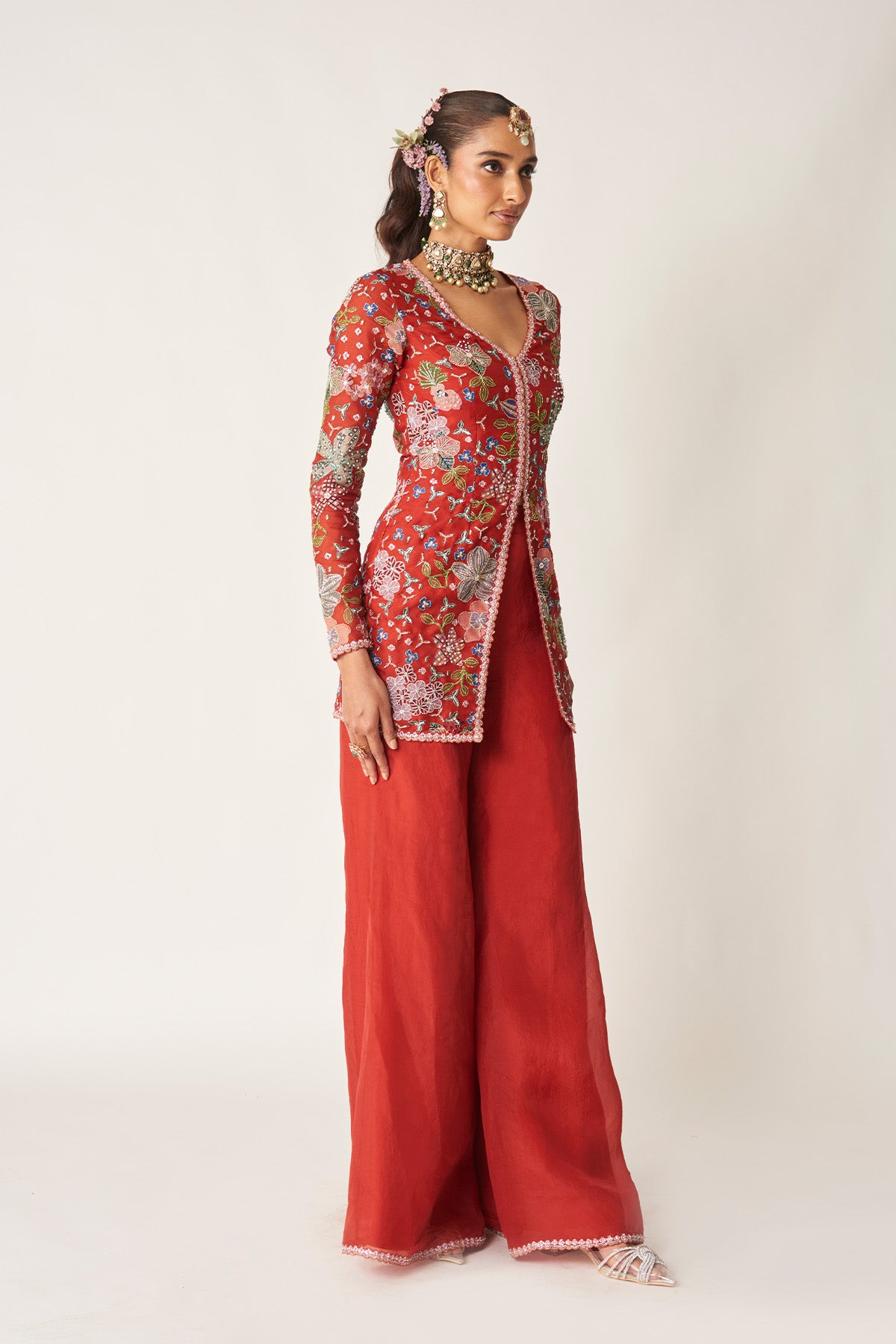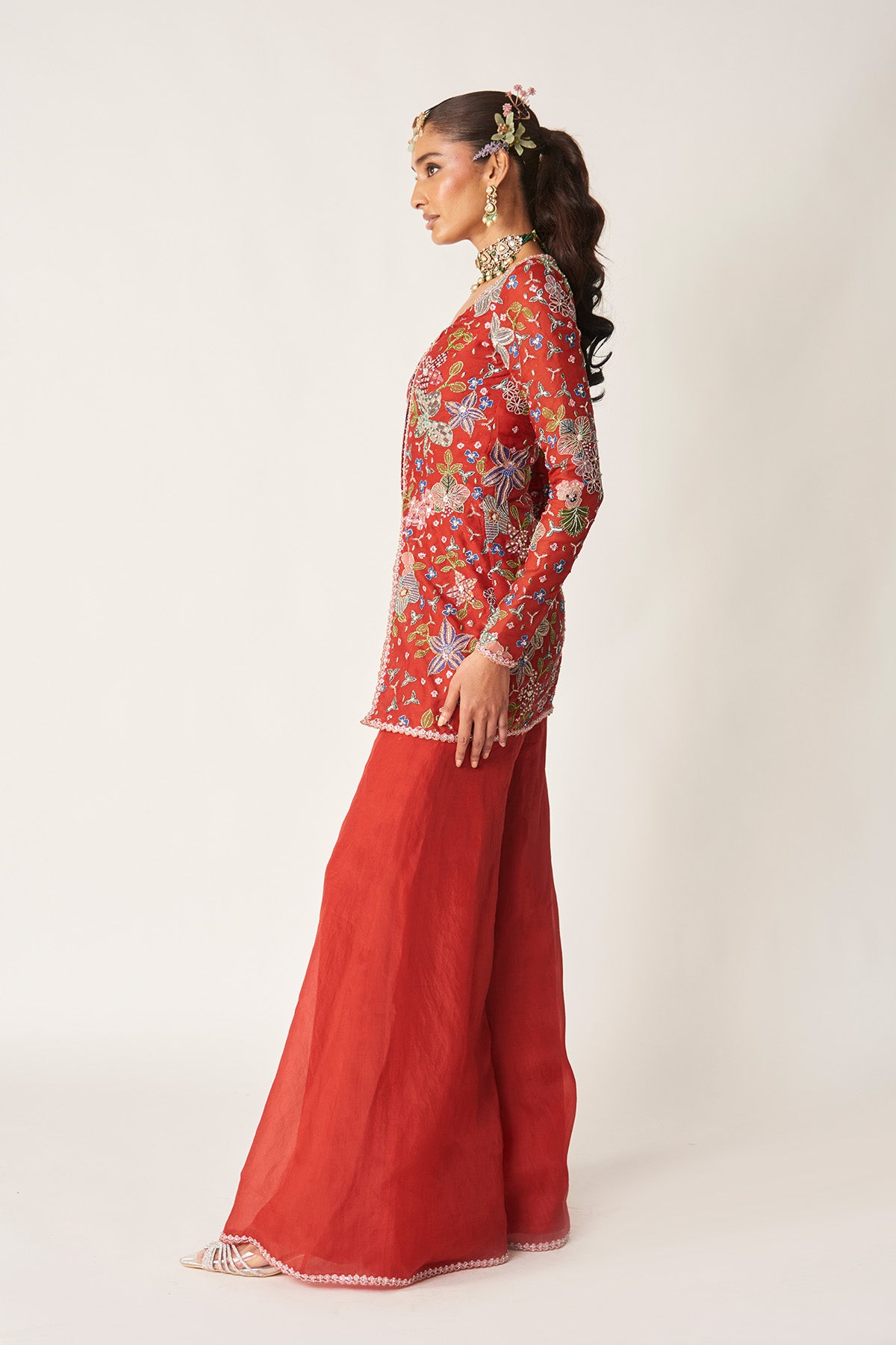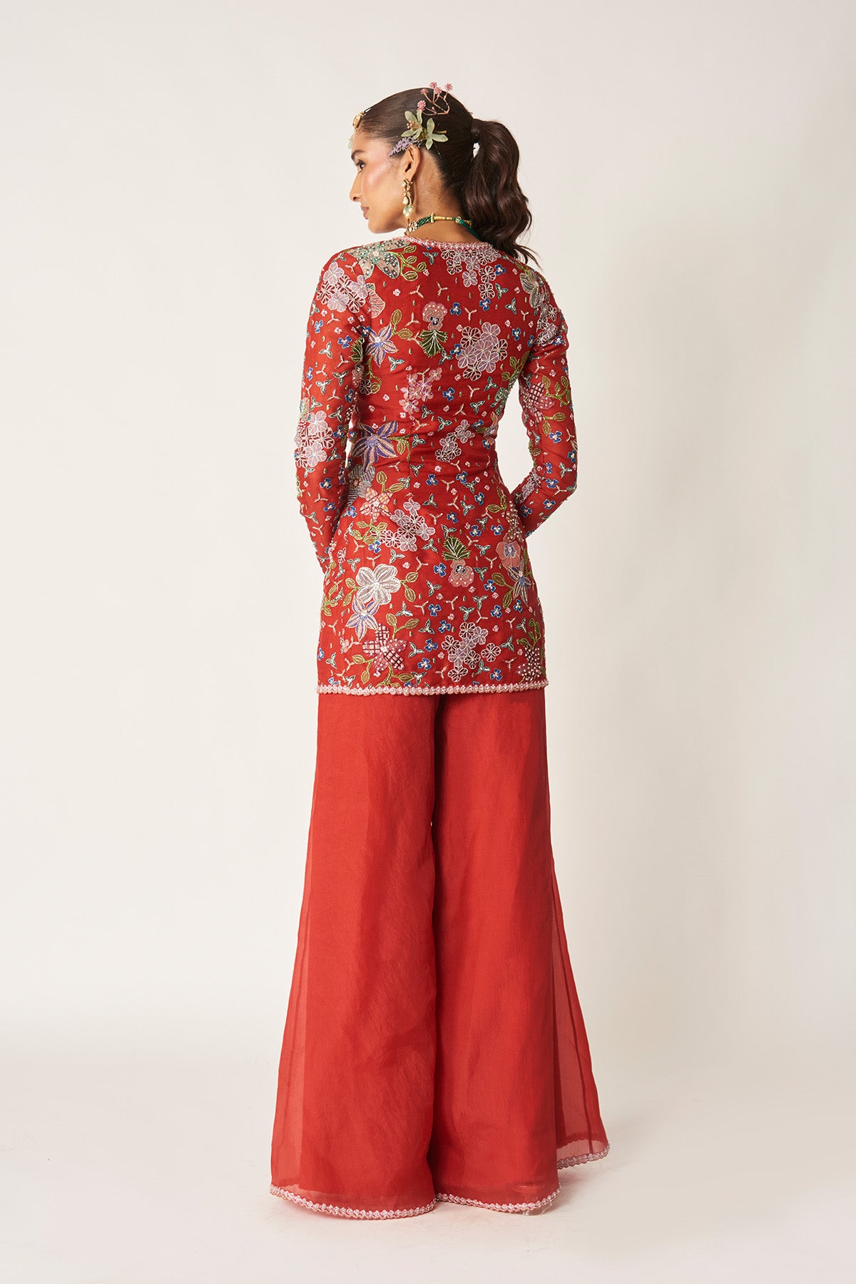 Matilda red printed embellished organza short kurta with solid sharara & tulle dupatta.