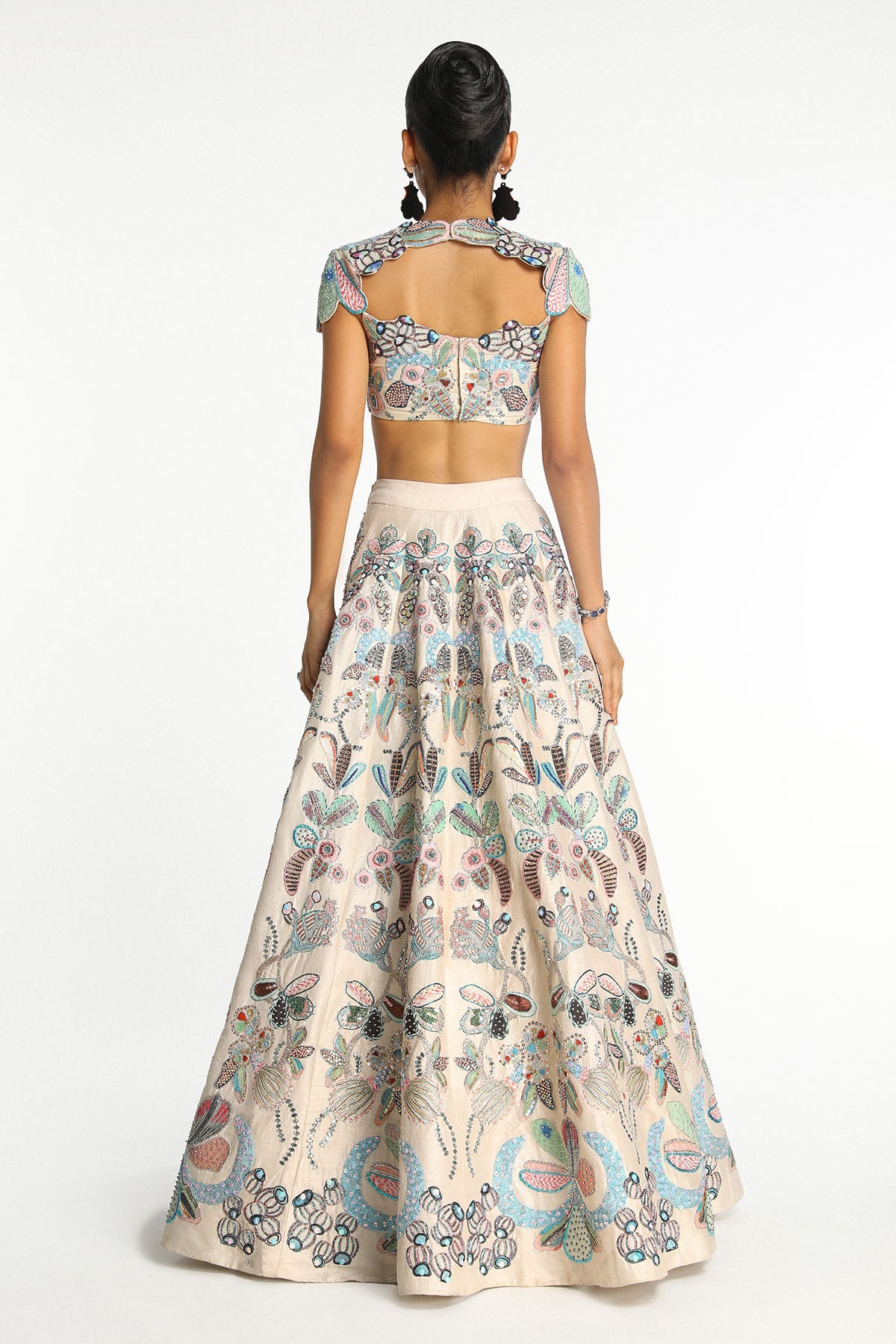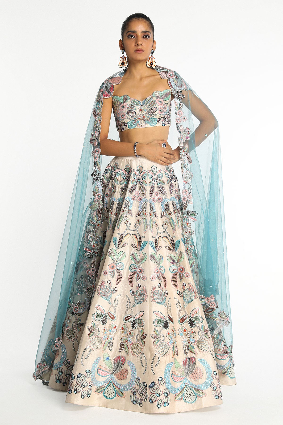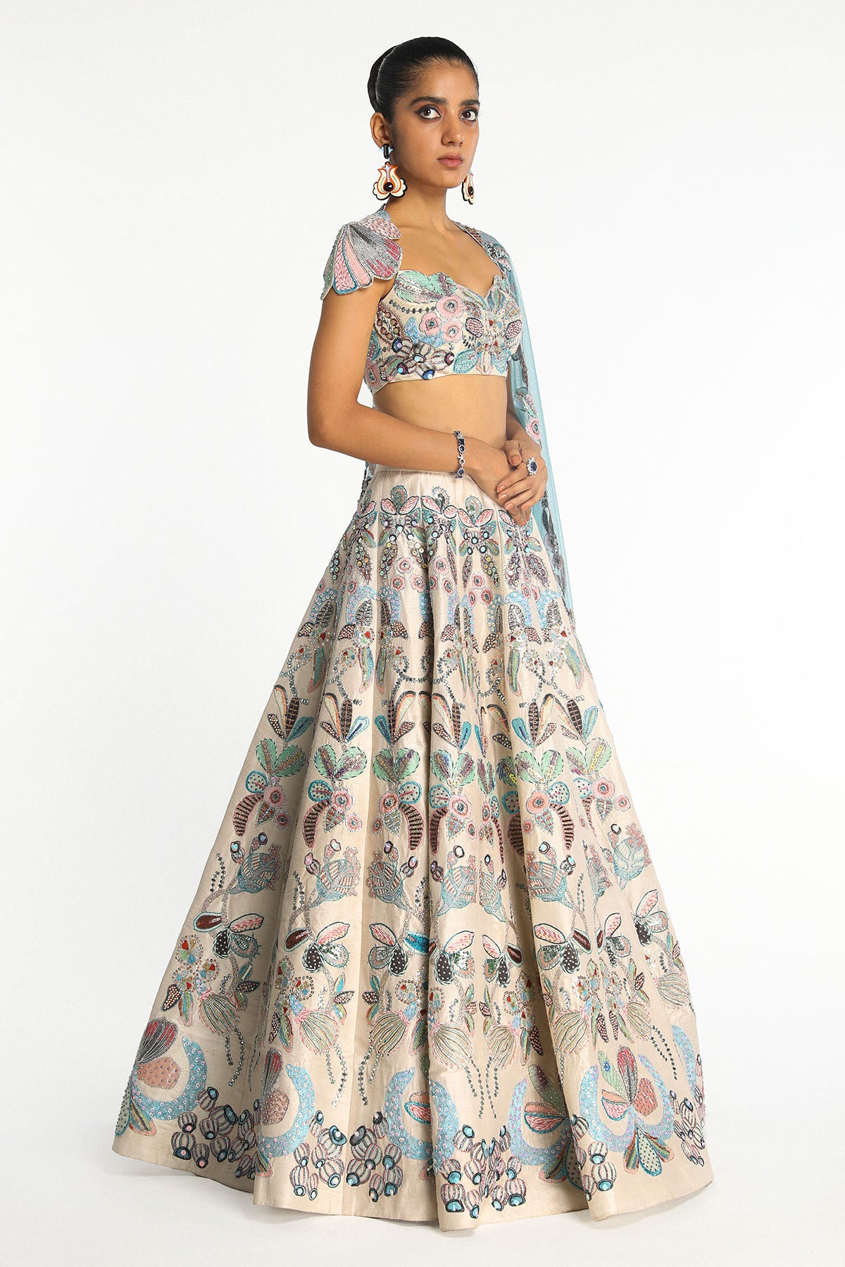 Kinfolk Ivory Applique Embellished Raw Silk Hk Lehenga, Blouse & Tulle Dupatta