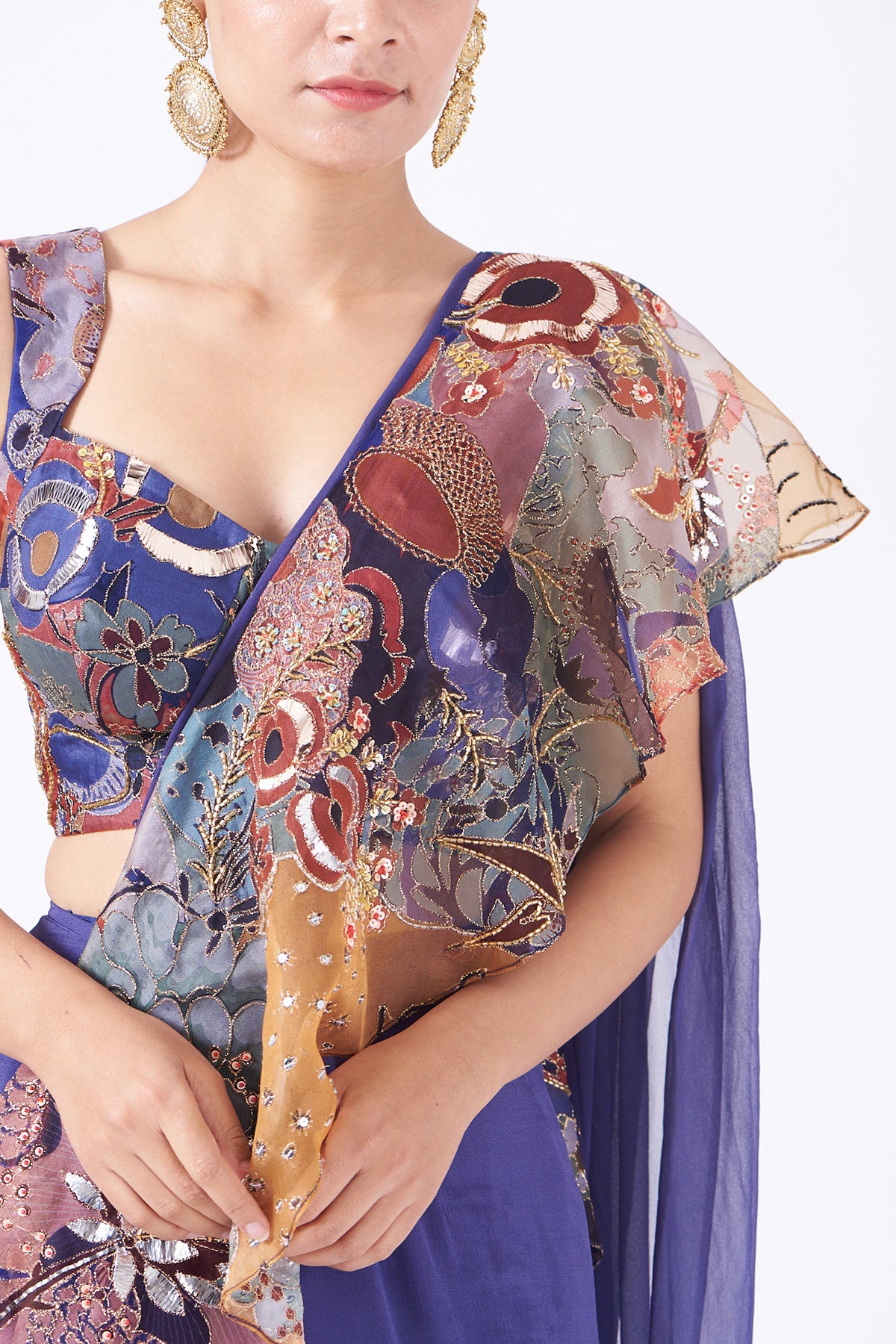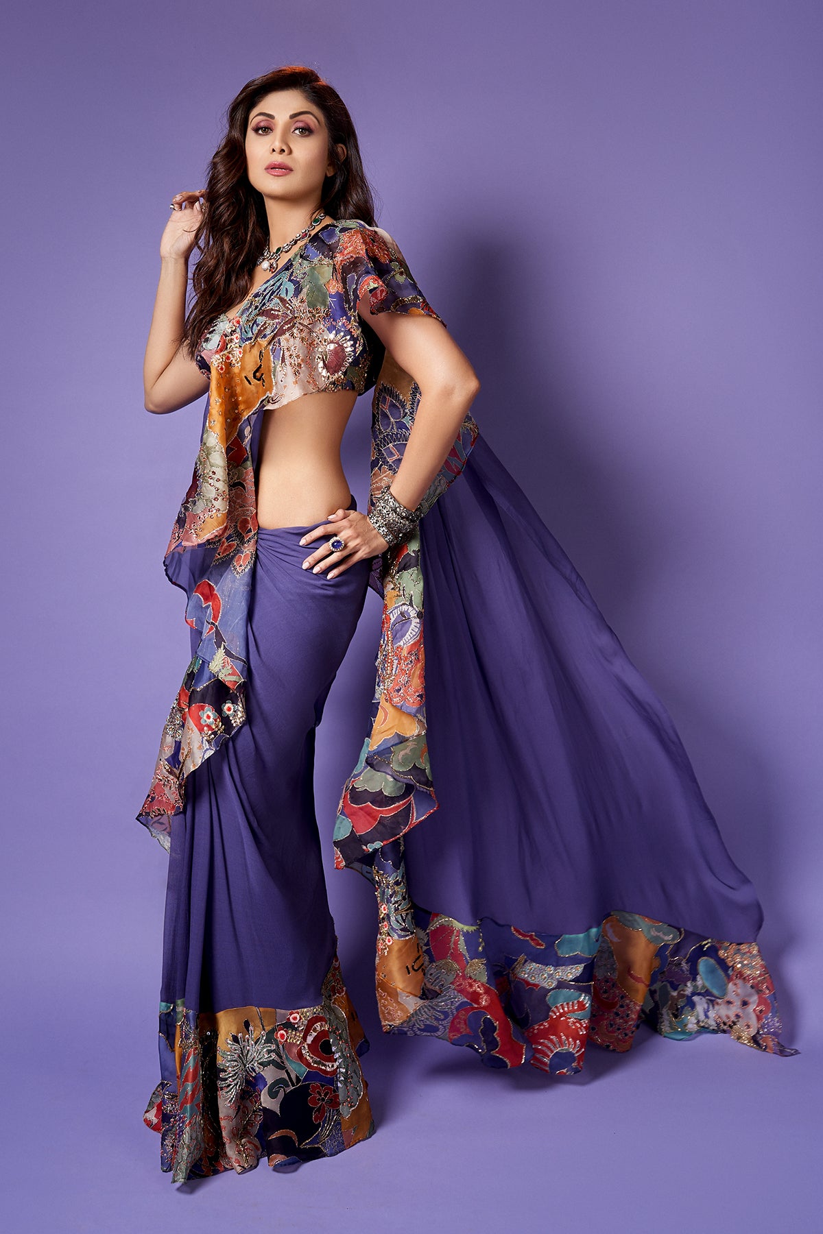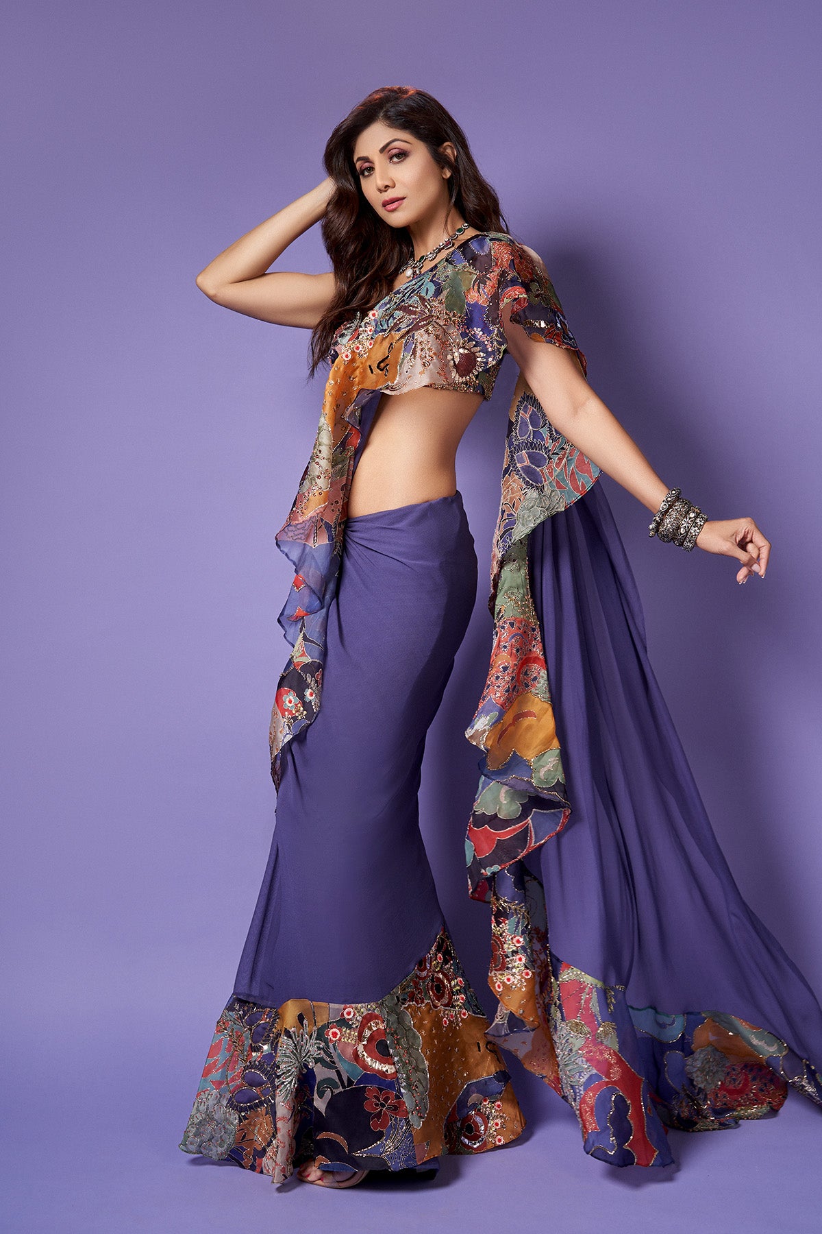 Violet paper dolls printed and embellished satin organza ruffle saree and blouse.