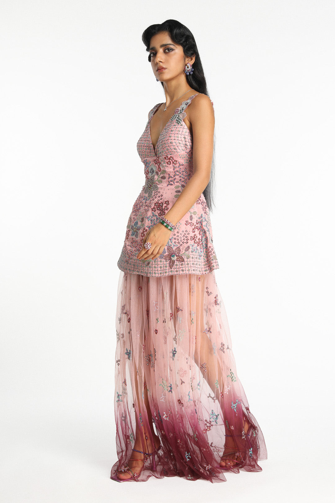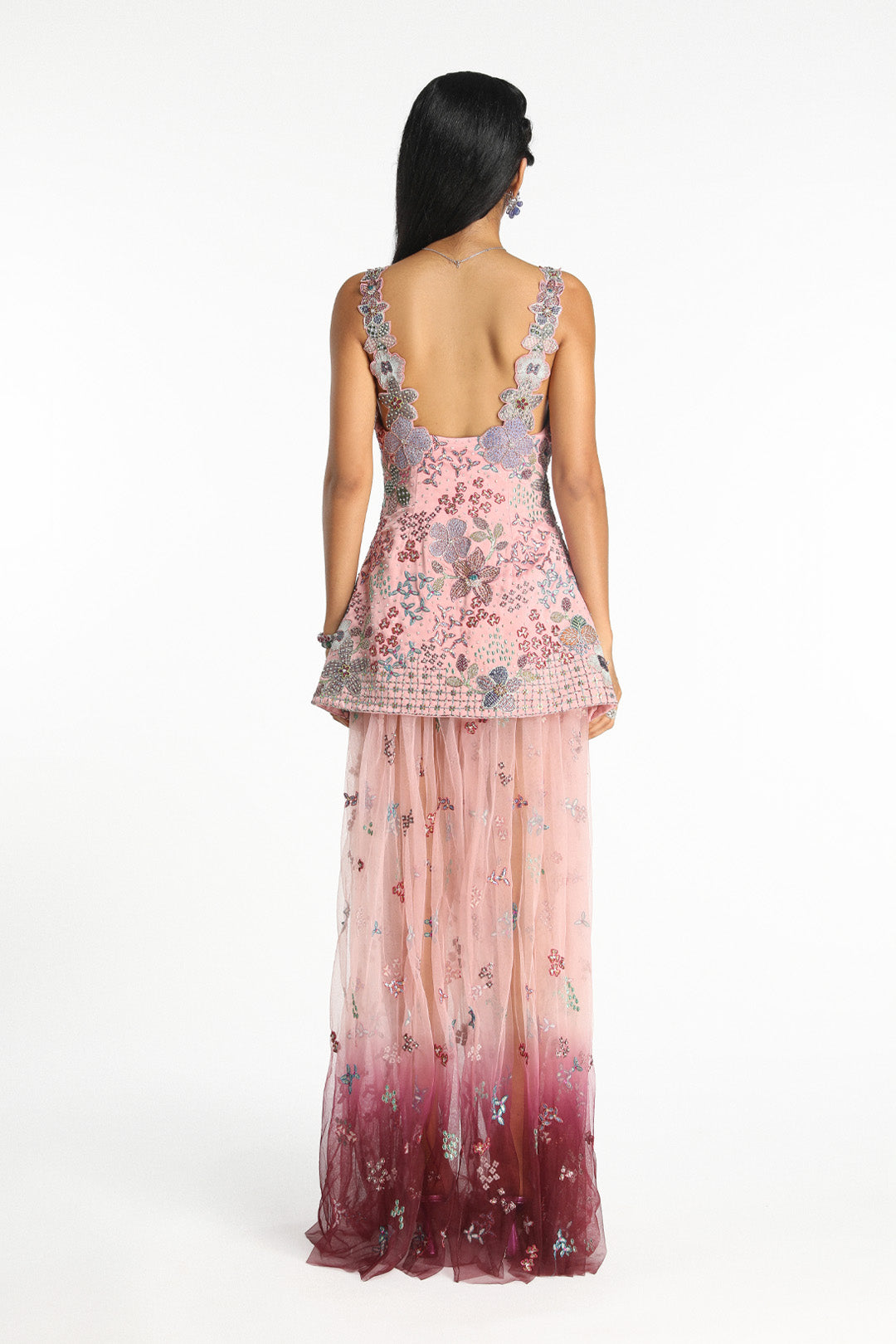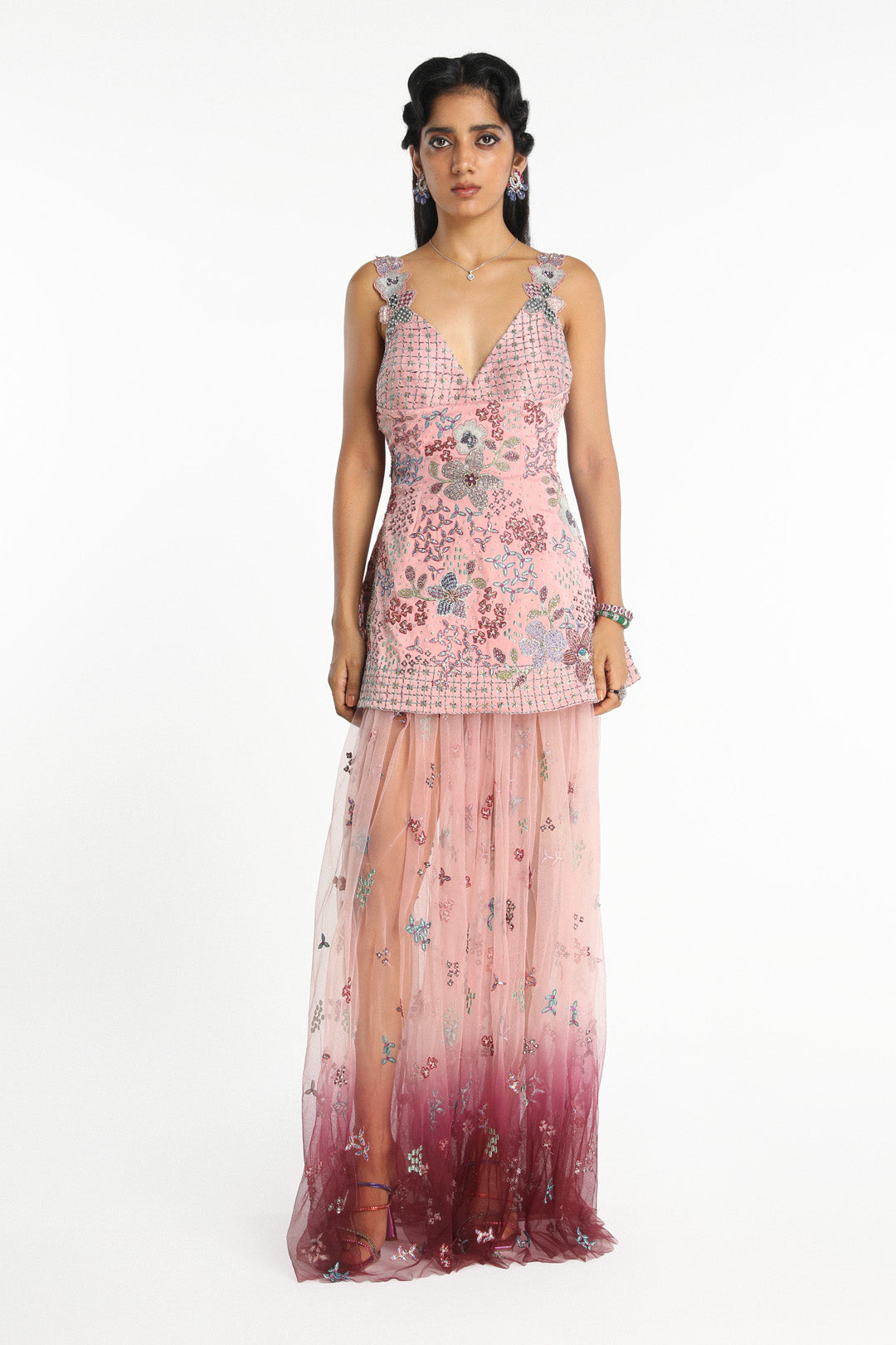 Matilda baby pink applique embellished satin V neckline tunic bodice sheer net skirt gown.