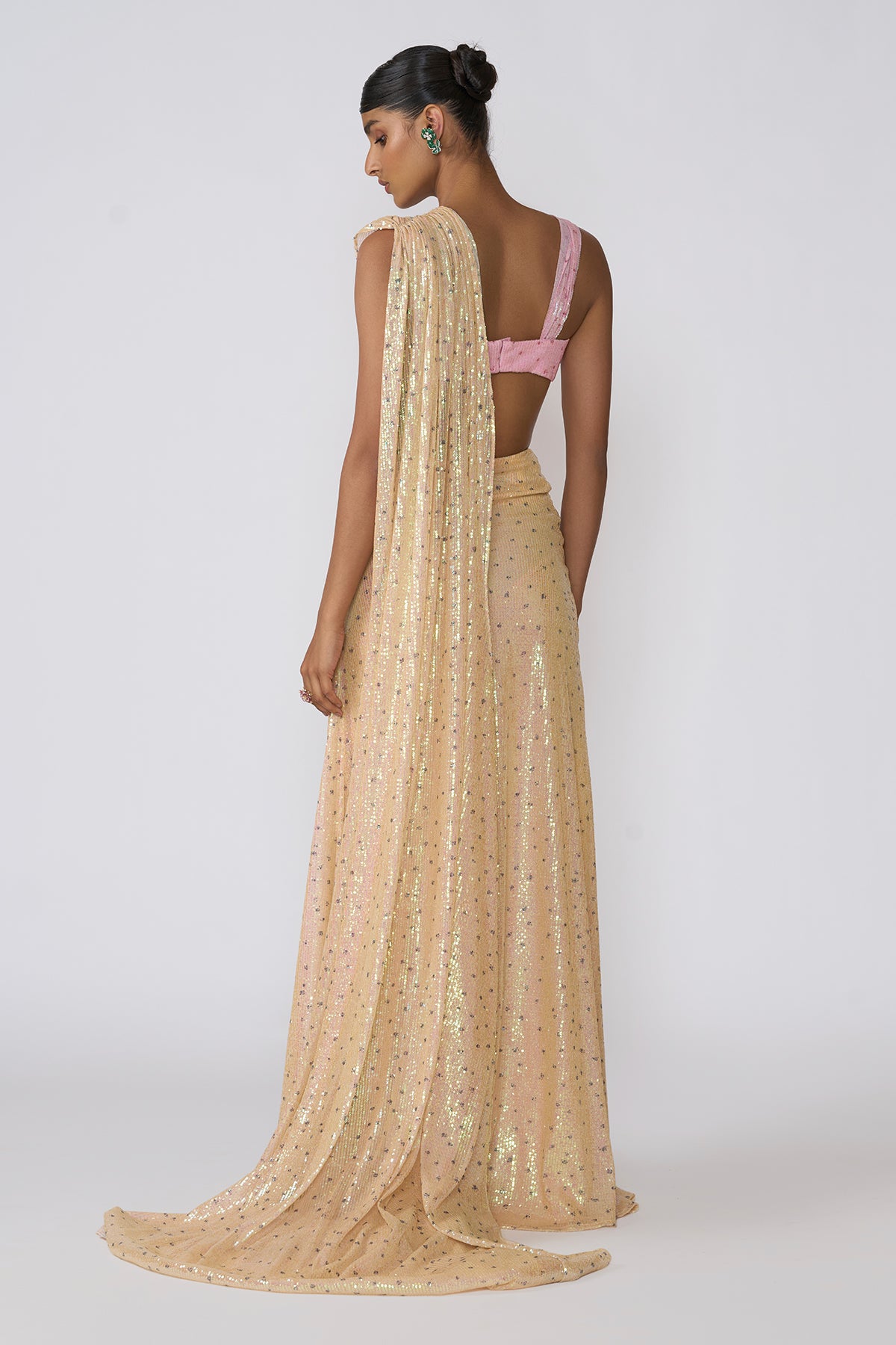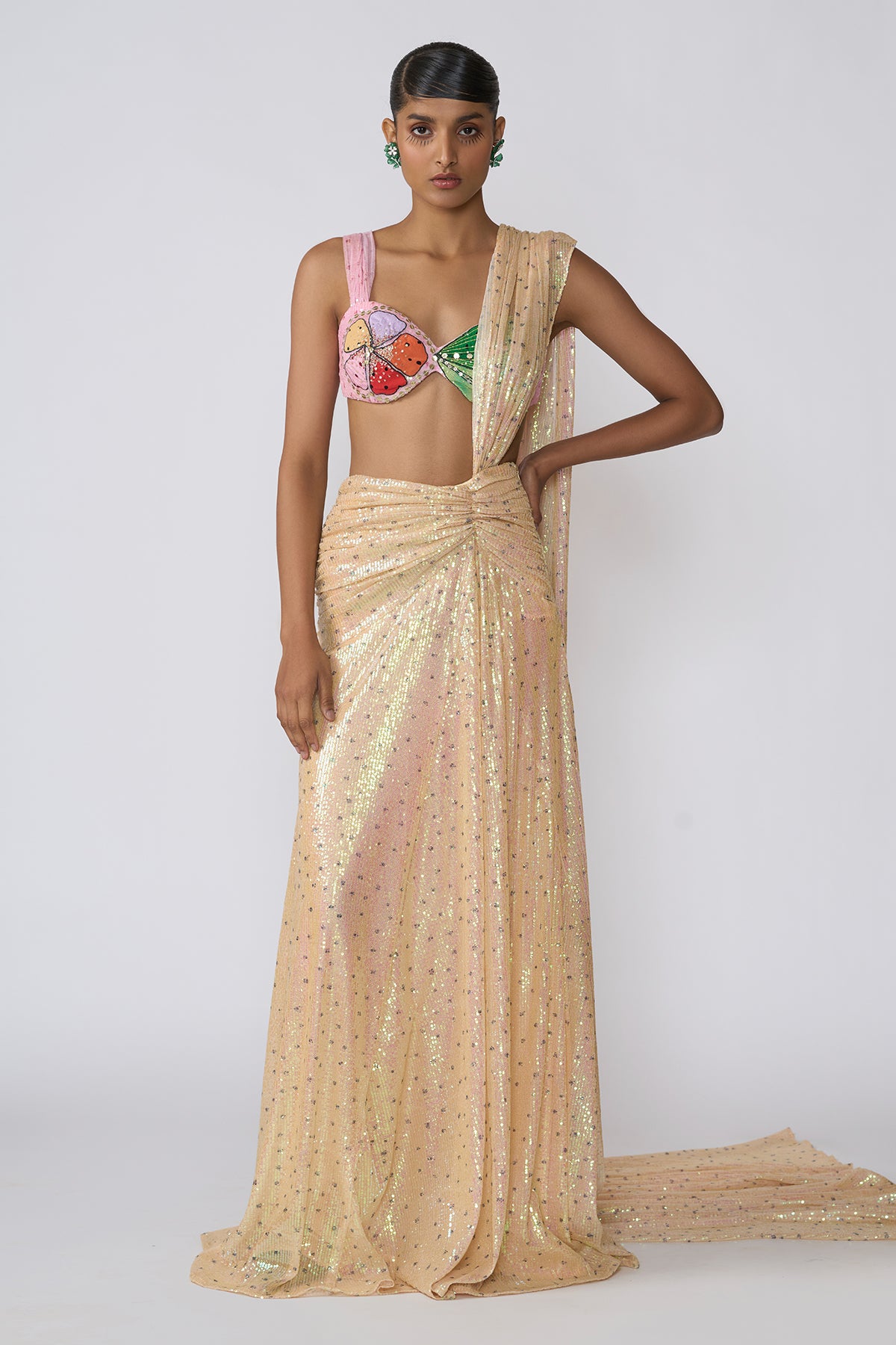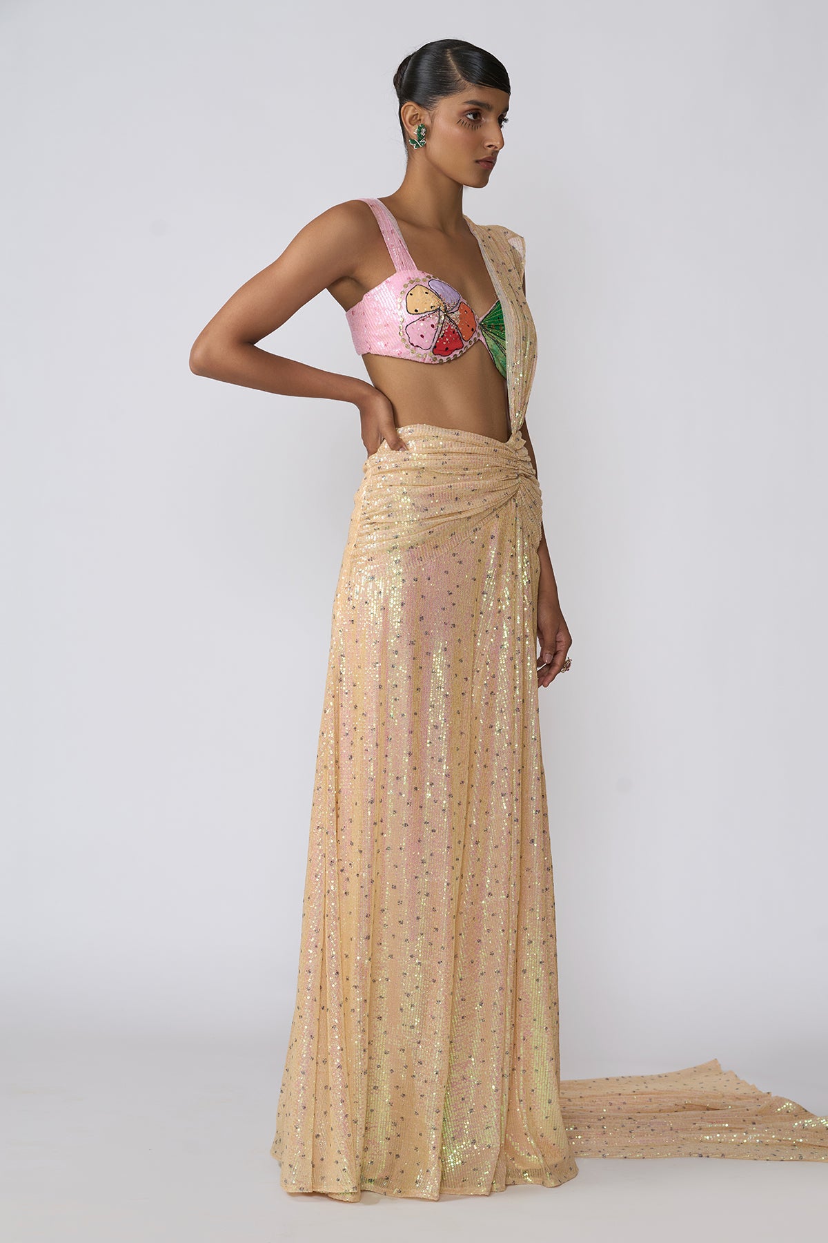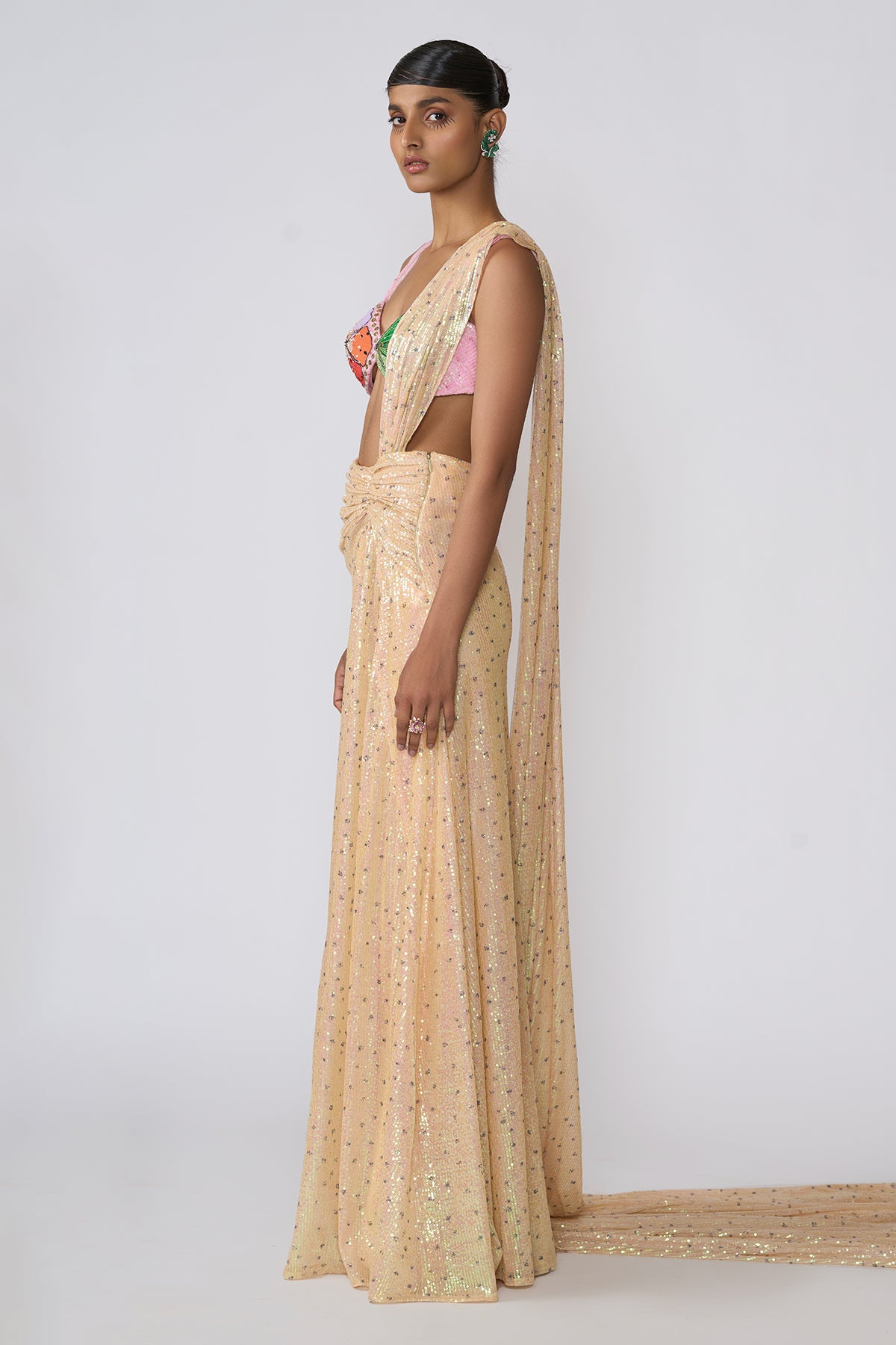 Kinfolk flax yellow printed applique embellished sequin tulle blouse with cinched waist draped saree