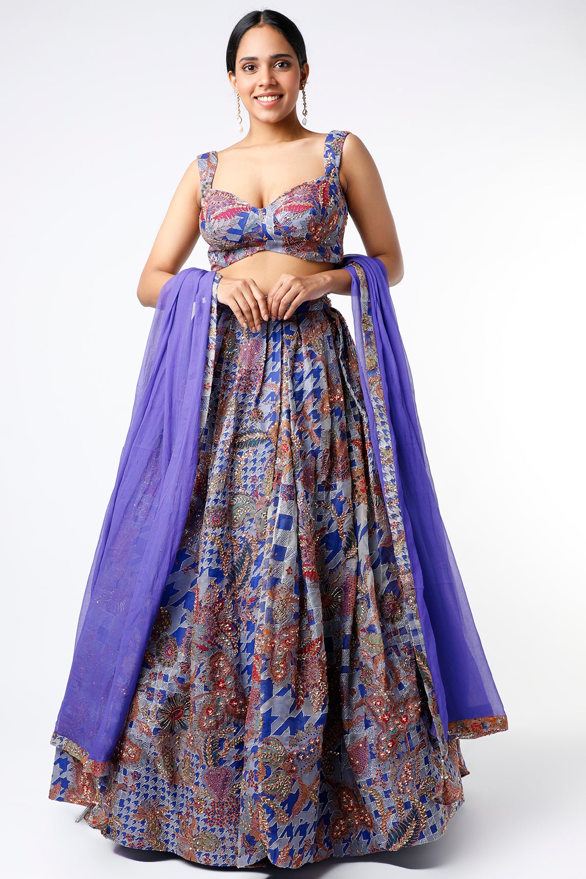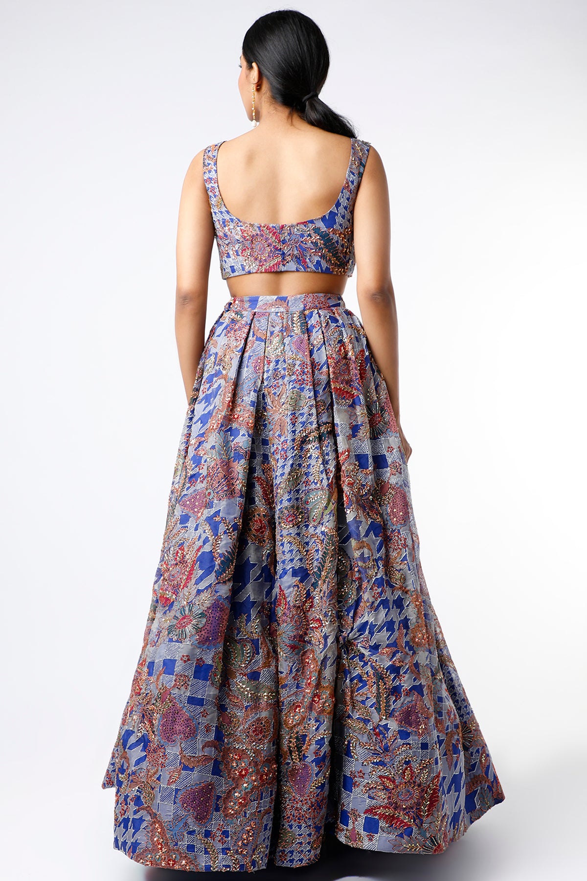 Dodger blue Juna organza printed and embellished top and skirt with dupatta