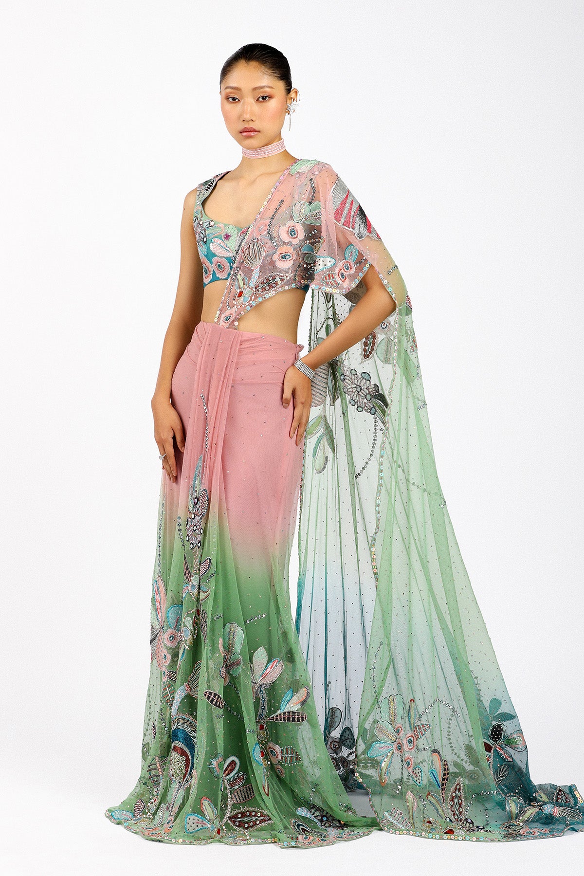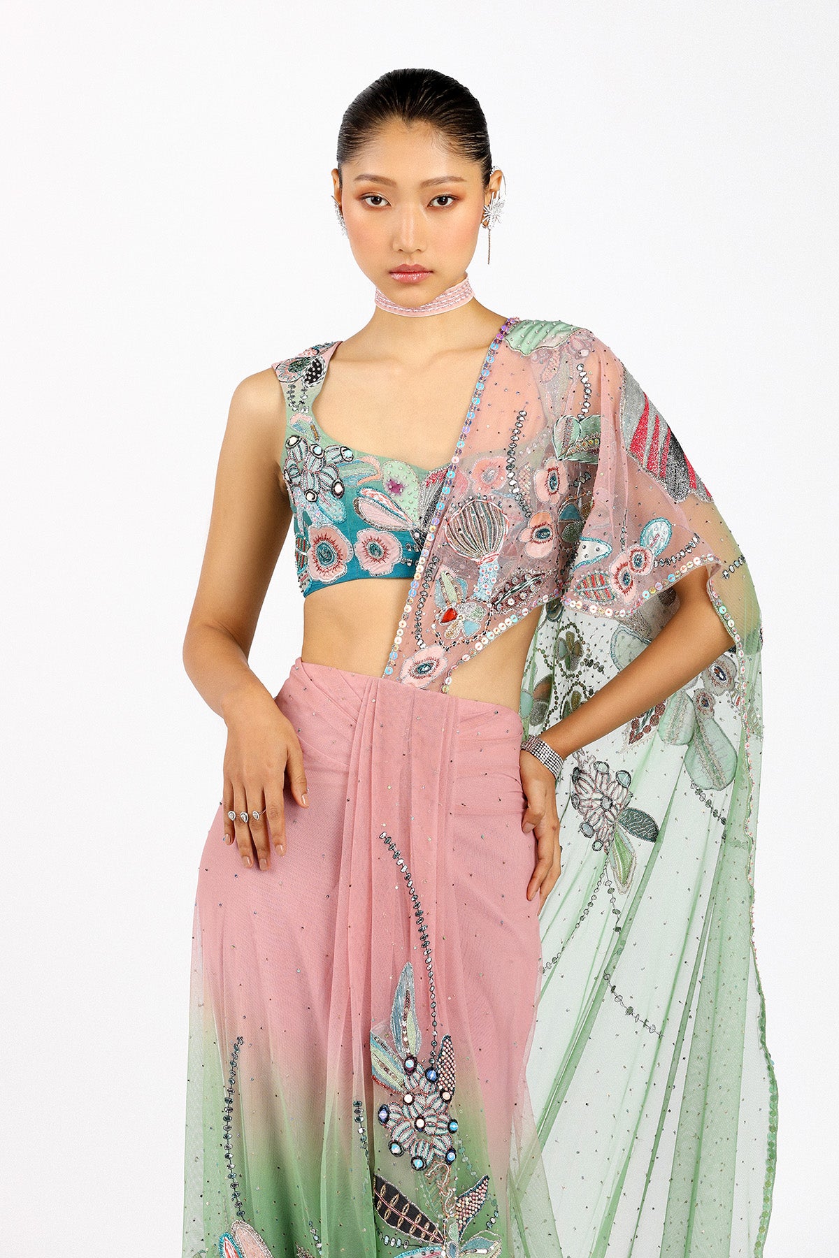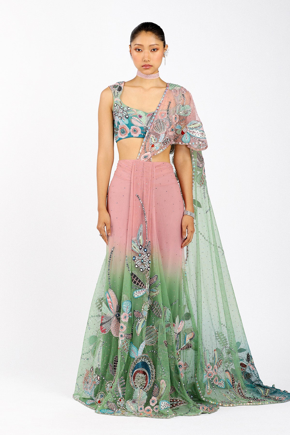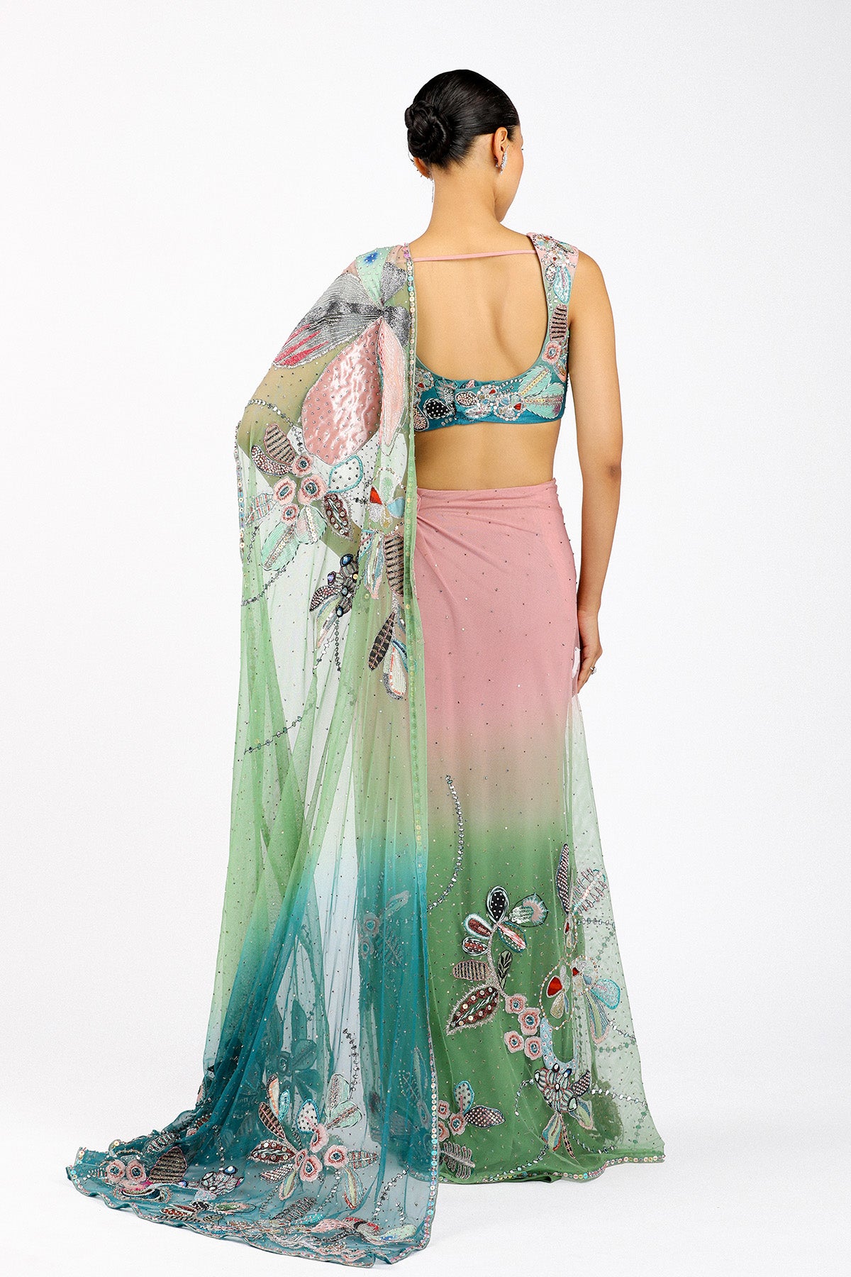 Kinfolk pink-green applique embellished tulle pre-draped saree with raw silk blouse