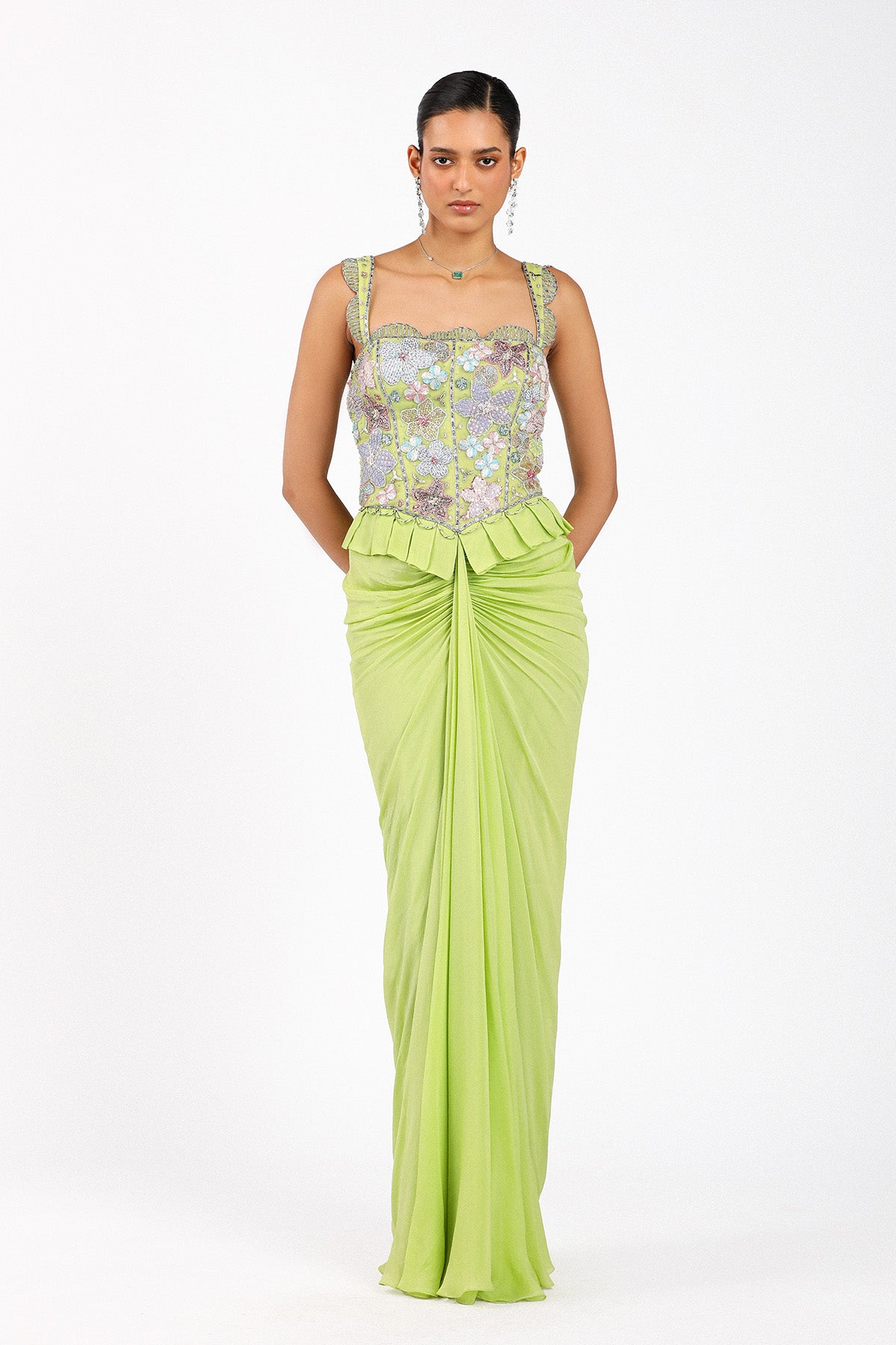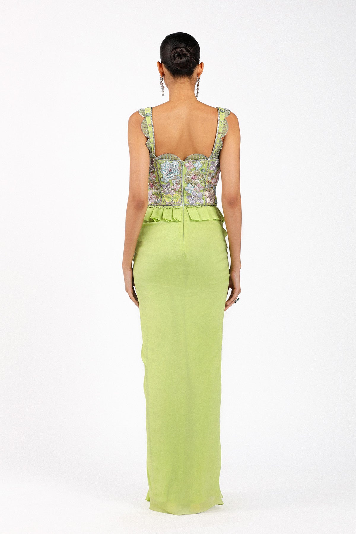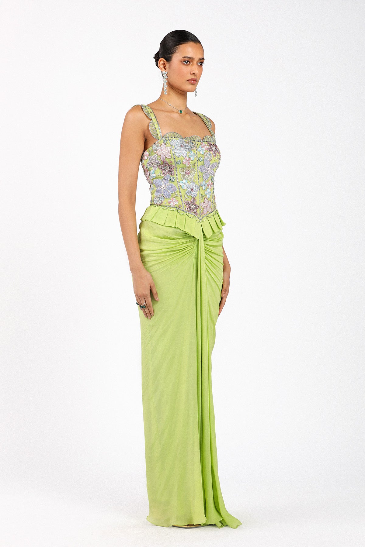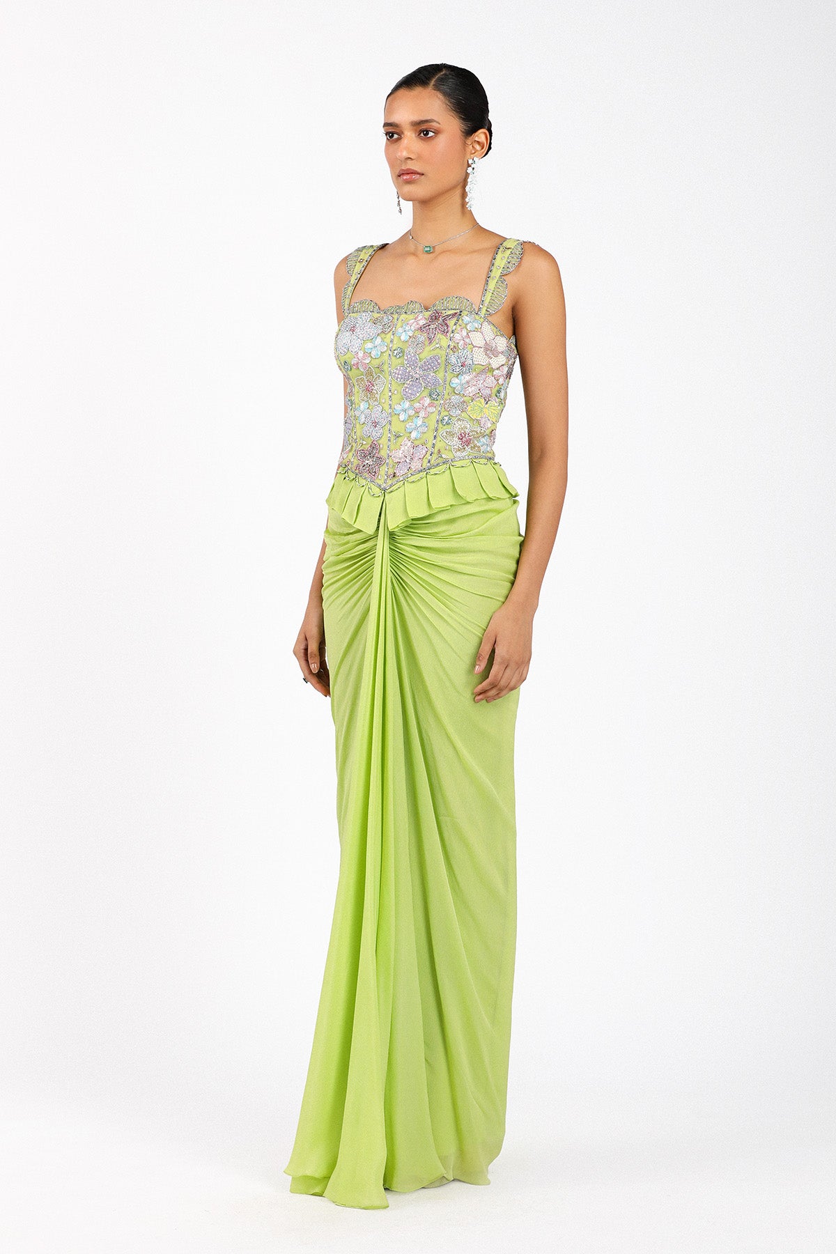 Matilda lime green applique embellished bodice with chiffon pleated ruched skirted gown