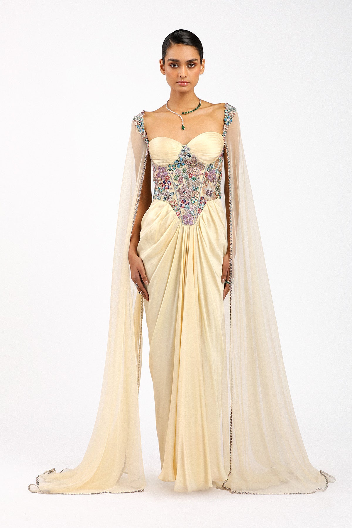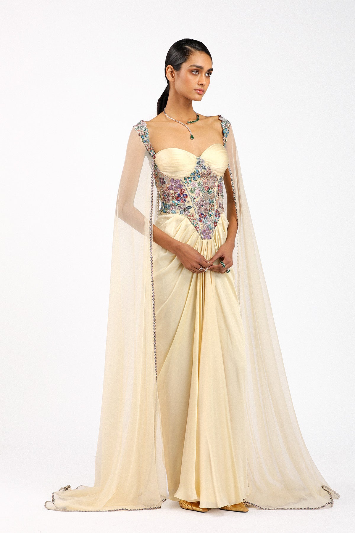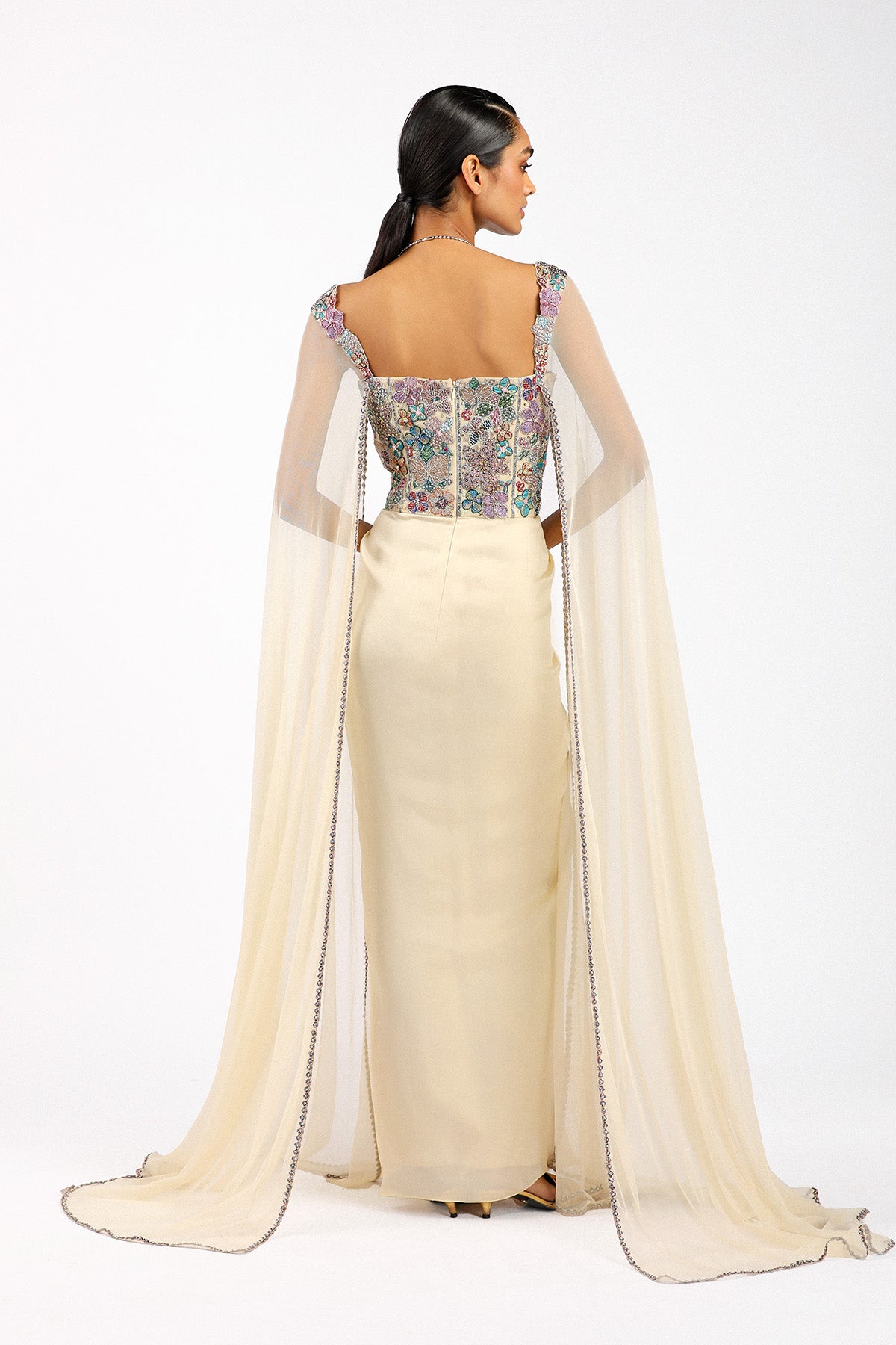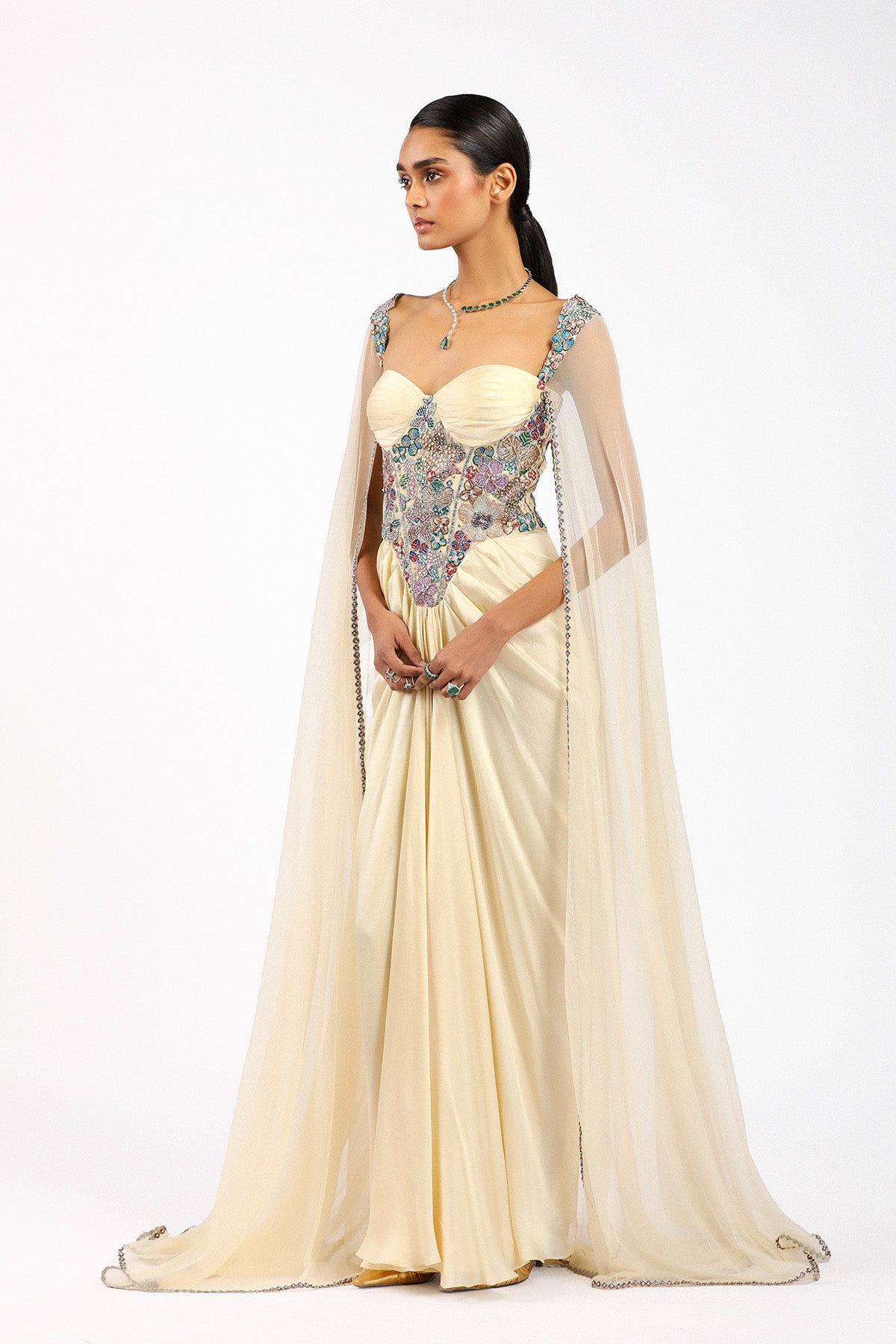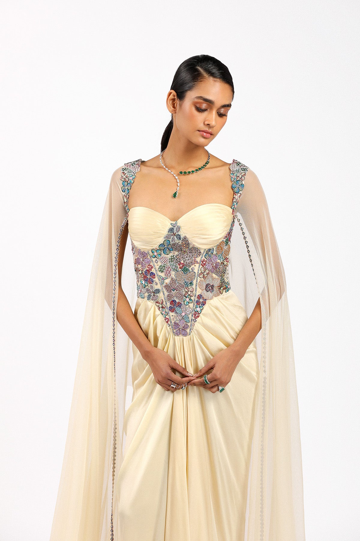 Matilda beige applique embellished corset bodice silky satin ruched pleated skirted gown with tulle cape