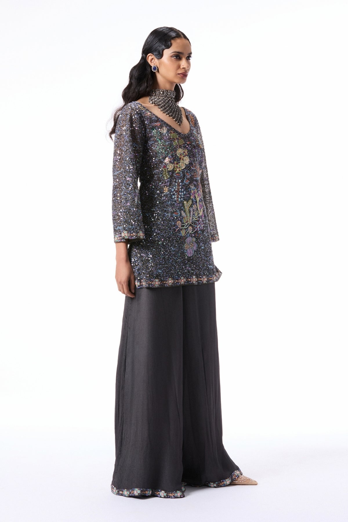 Wild At Heart gunmetal Applique Embellished tulle sequin short kurta with chiffon pants and tulle dupatta.