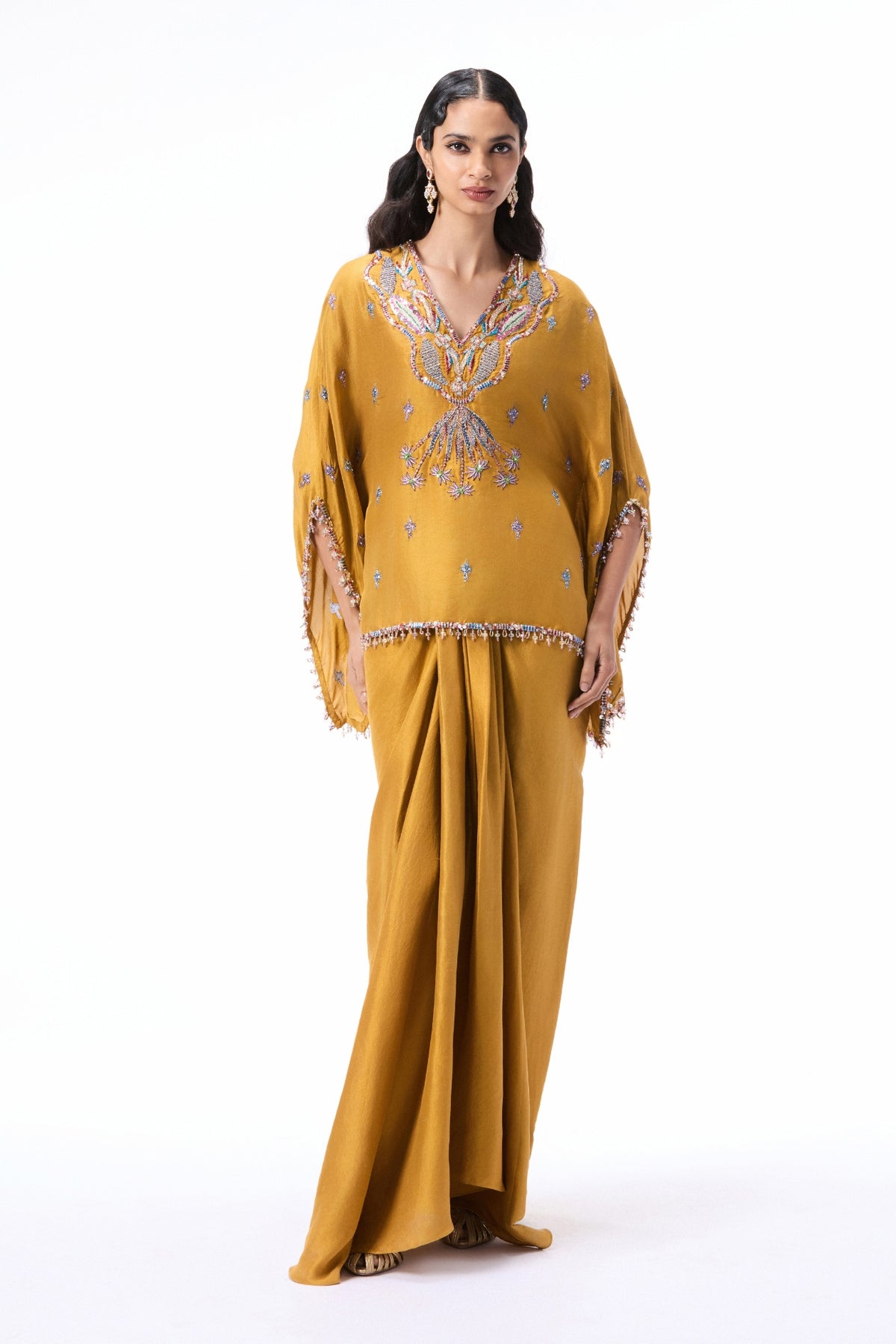 Full look of the Wild At Heart mustard dupion silk set featuring an embellished short kurta and draped skirt.