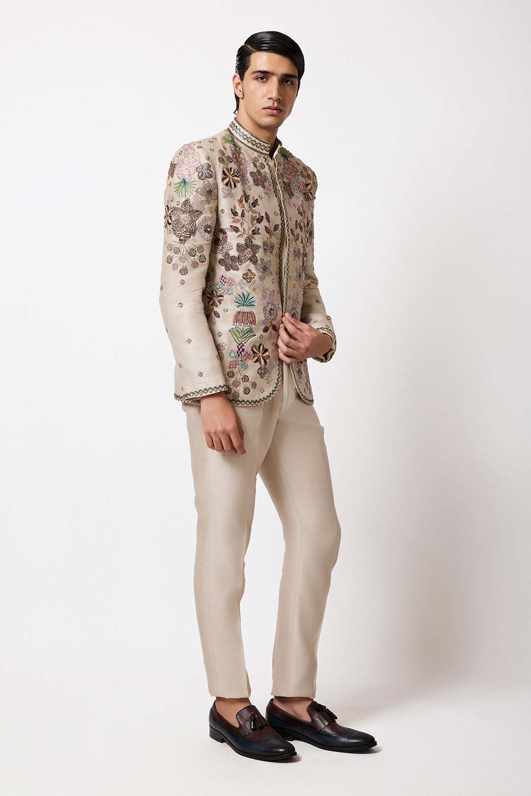 Matilda Pastel Ivory Applique Embellished Raw Silk Bandhgala