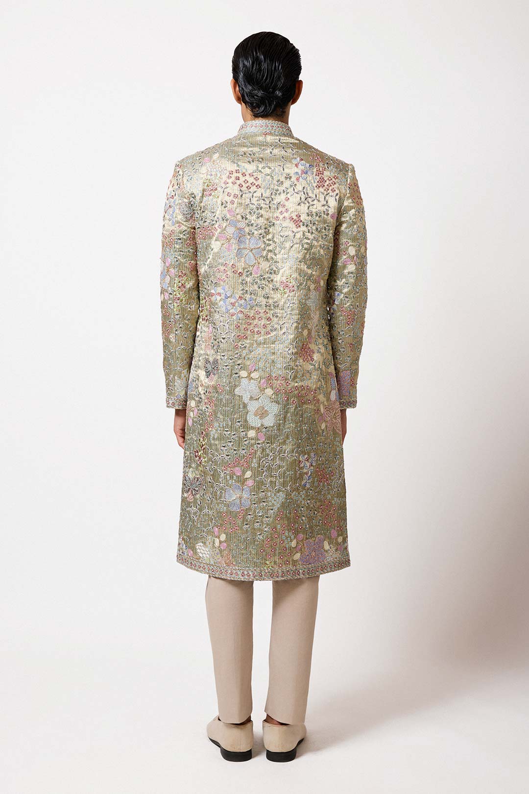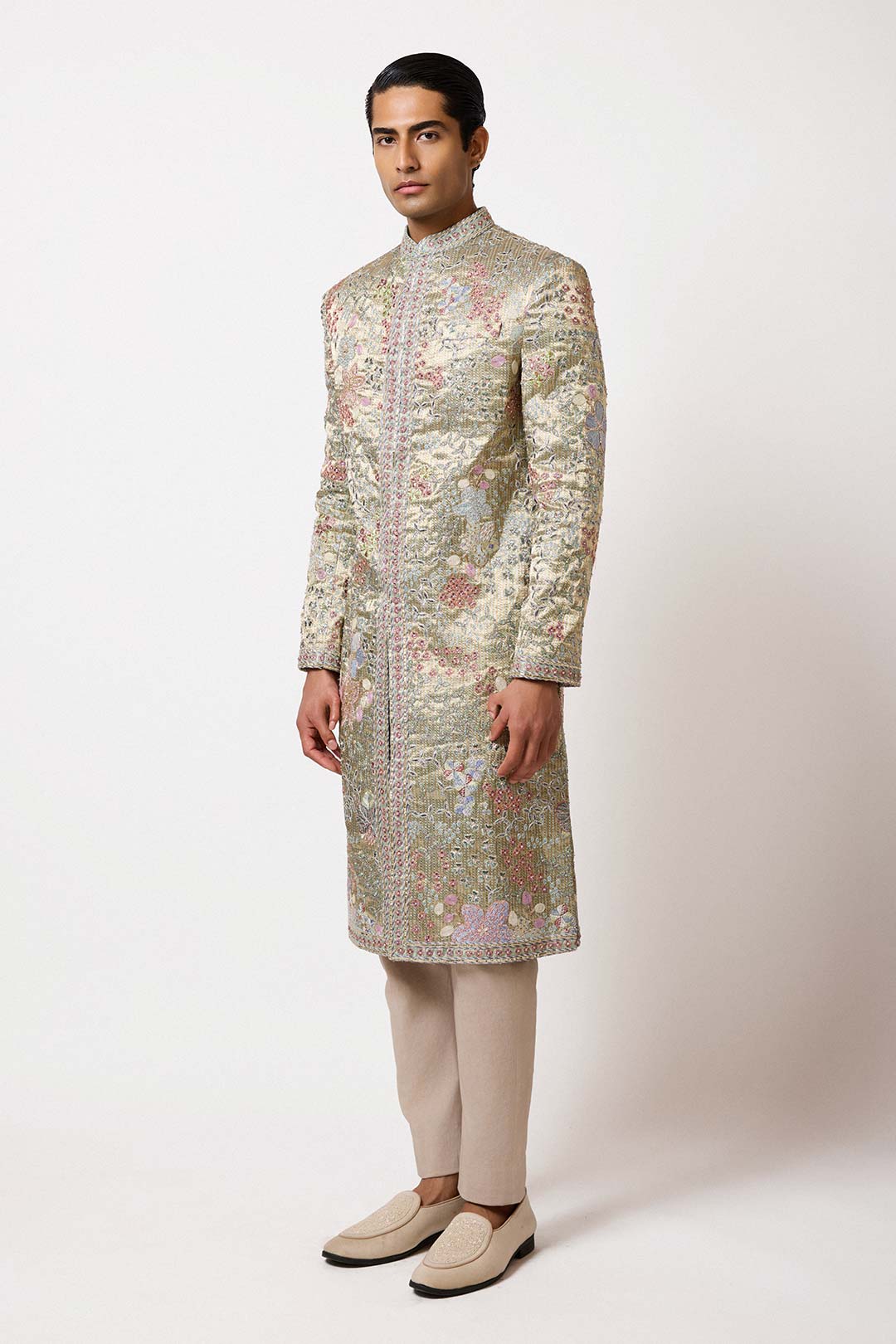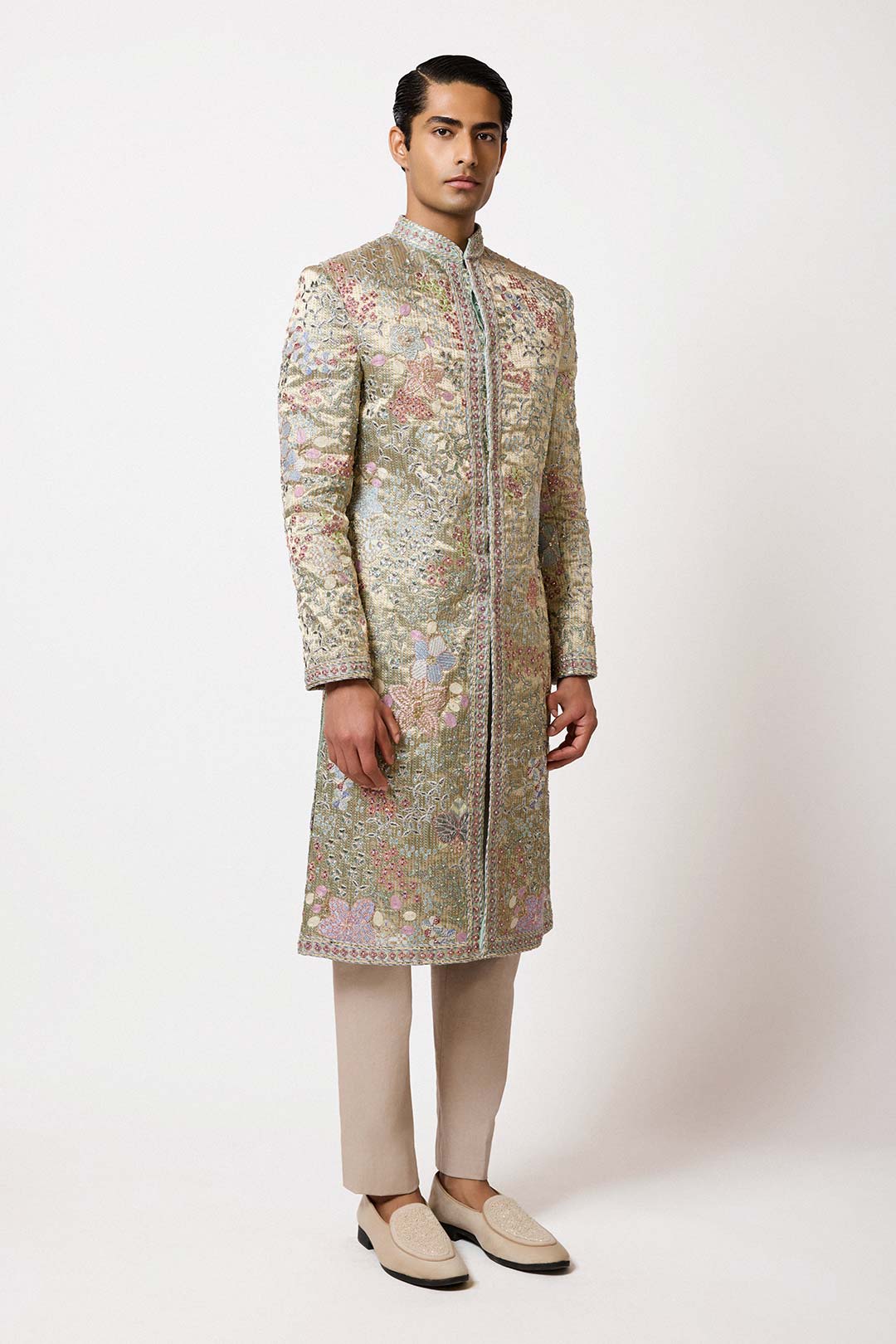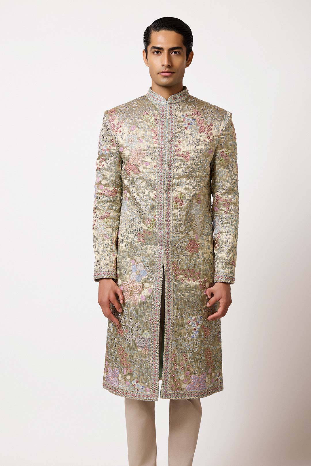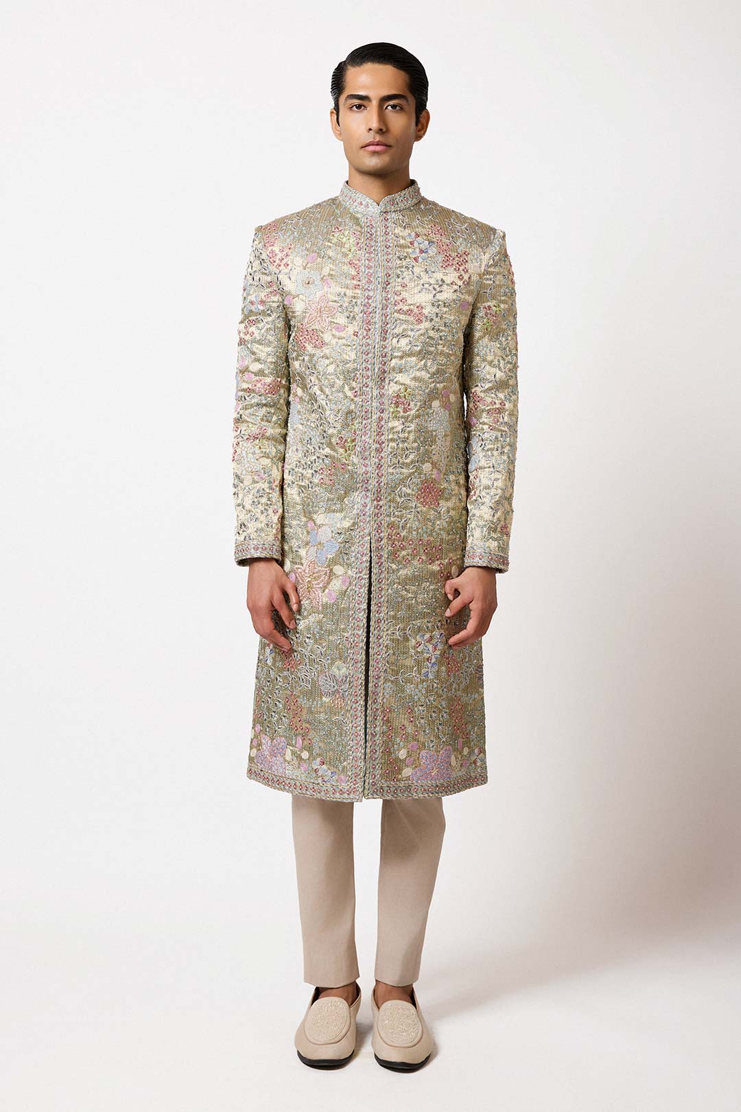 Matilda Blue Pearl Applique Embellished Banarasi Tissue Brocade Sherwani